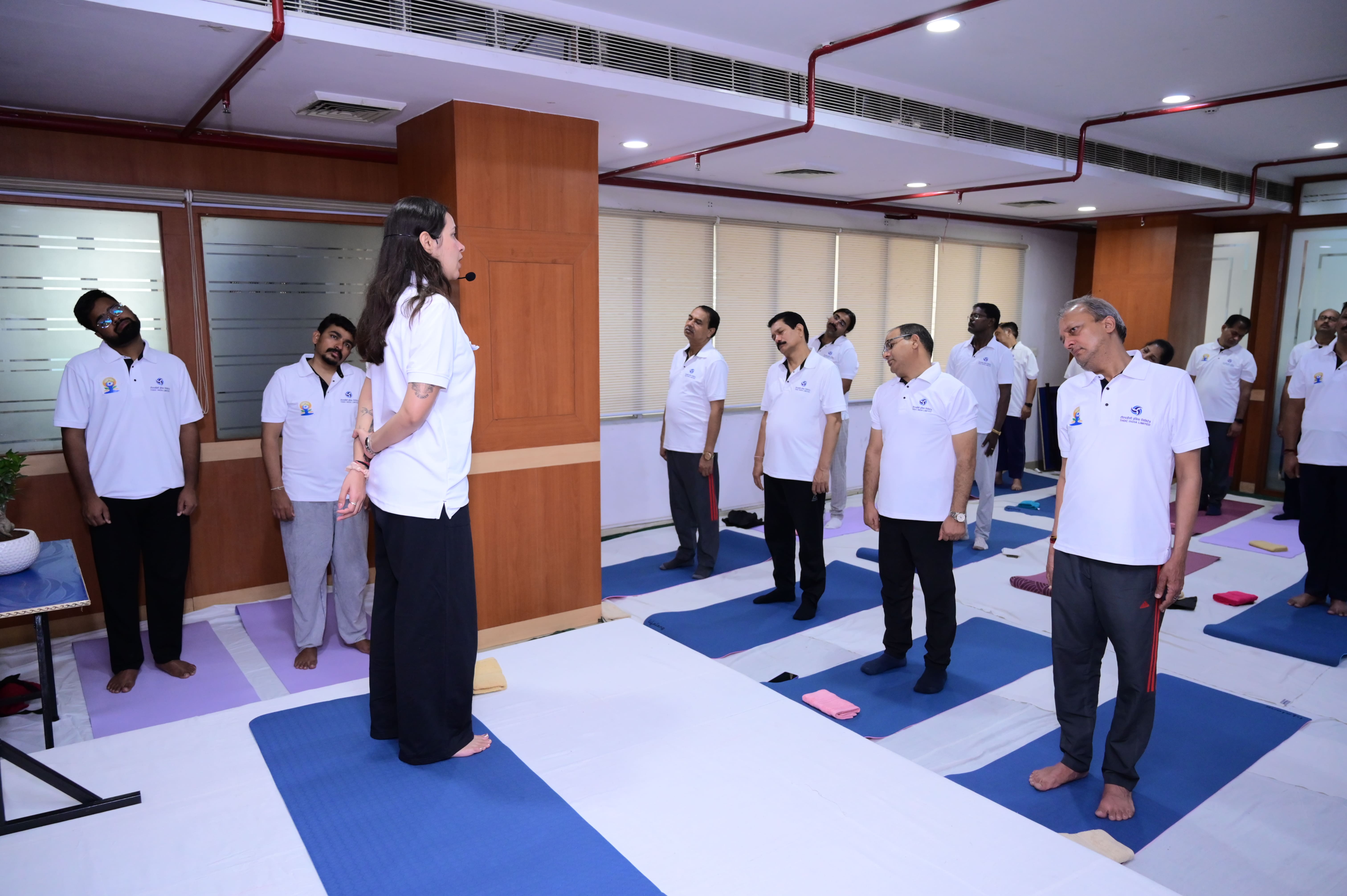 The Yoga session, conducted by two professional yoga instructors, offered a comprehensive one-hour practice session. The instructors effectively guided the attendees — officers, staff, and their family members — through various asanas and breathing techniques, promoting both physical vitality and mental clarity.