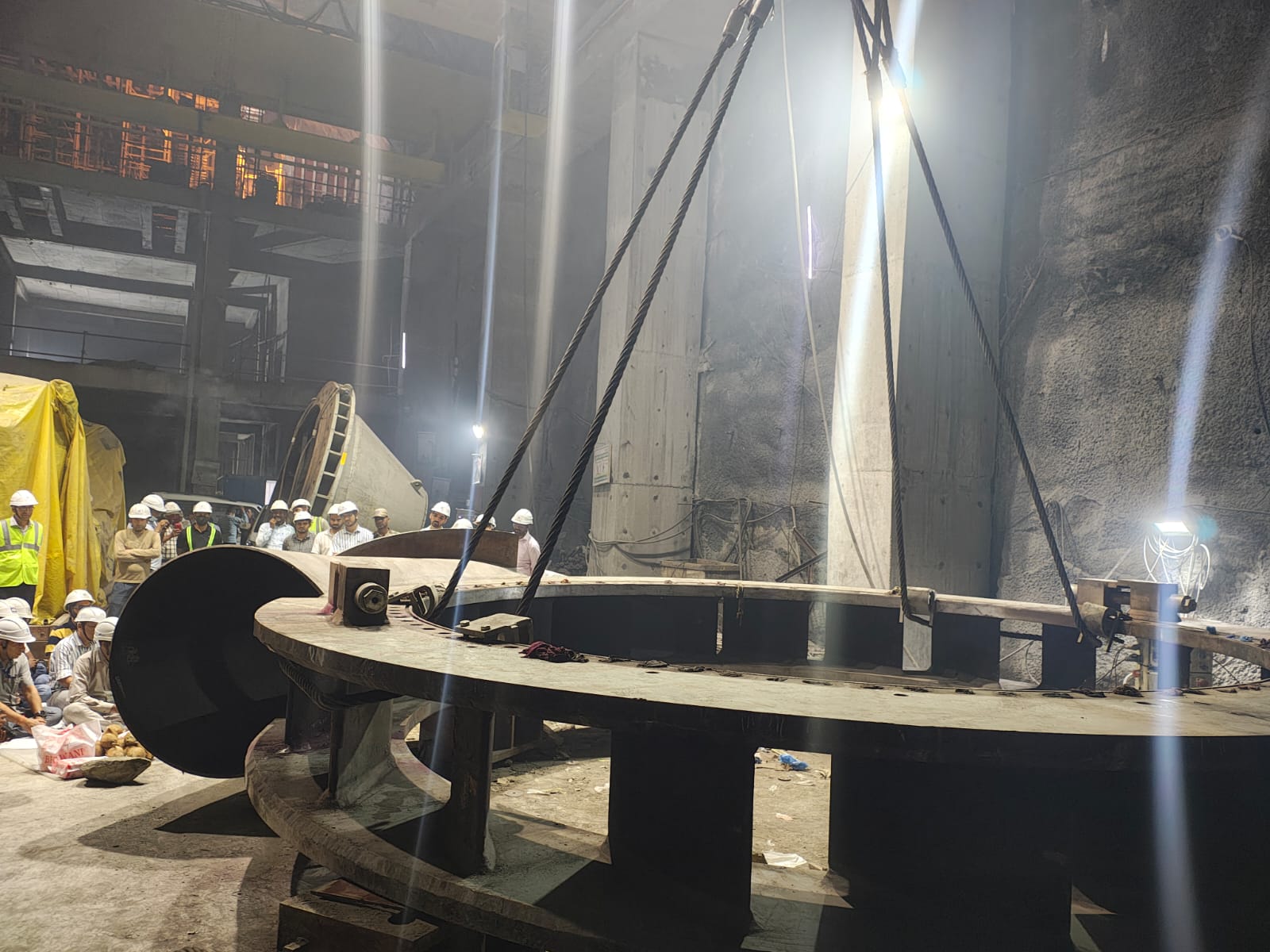 (VPHEP) by lowering the stay ring of Unit#2 at Powerhouse.  The stay ring halves were assembled using cyclic welding and stress-relieved at the service bay, followed by non-destructive testing. After completion of first stage concreting, today the stay ring of Unit #2 has been placed at its respective location.