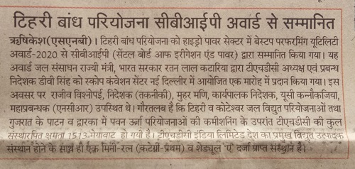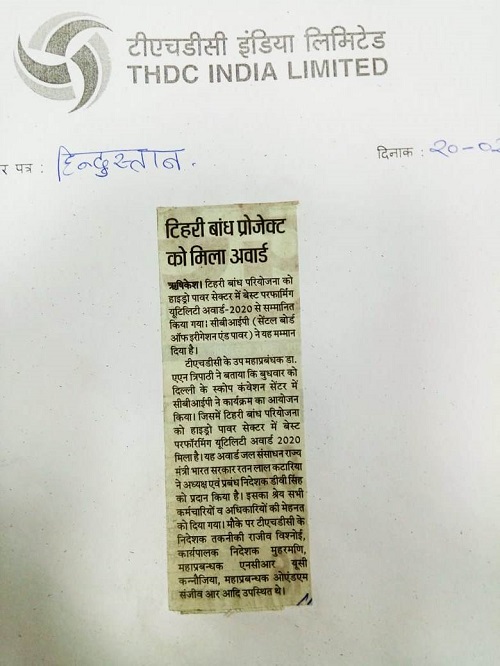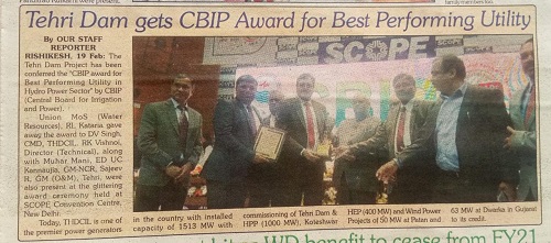 19.02.2020- Rishikesh: Tehri Dam Project has been conferred with "CBIP award for Best Performing Utility in Hydro Power Sector" by CBIP (Central Board for Irrigation and Power). Hon’ble MoS (Water Resources), Govt. of India Sh. R.L. Kataria gave away the award to Sh. D. V. Singh, CMD, THDCIL. Sh. R.K.Vishnoi, Director (Technical) along with Sh. Muhar Mani, ED Sh. U.C.Kannaujia, GM-NCR and Sh. Sajeev.R, GM (O&M), Tehri were also present in a glittering award ceremony held at SCOPE Convention Centre New Delhi. Today, THDCIL is one of the premier power generators in the country with installed capacity of 1513 MW with commissioning of Tehri Dam & HPP (1000MW), Koteshwar HEP (400MW) and Wind Power Projects of 50MW at Patan & 63MW at Dwarka in Gujarat to its credit.