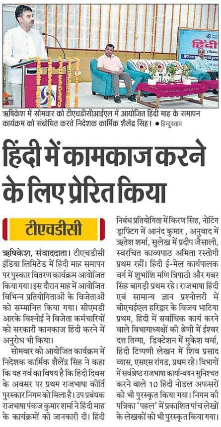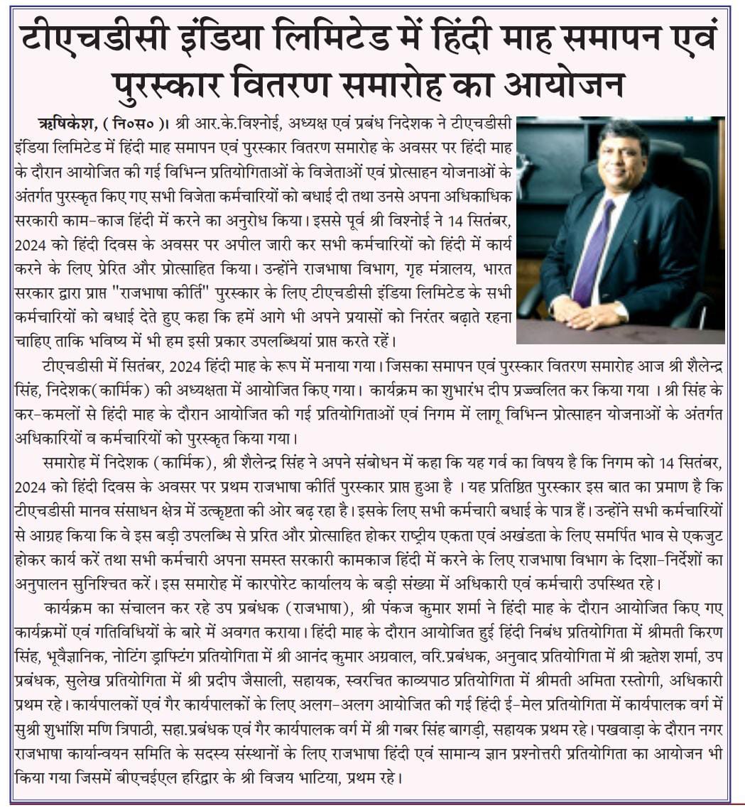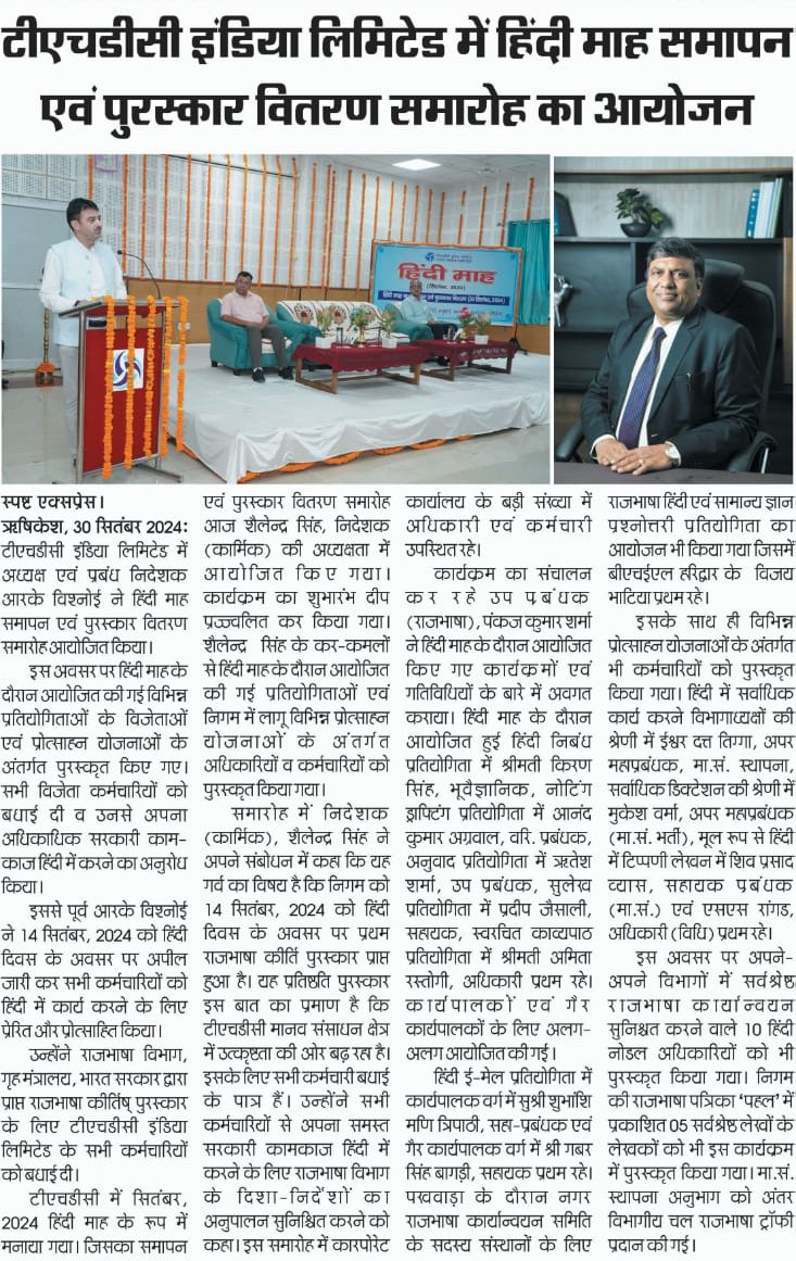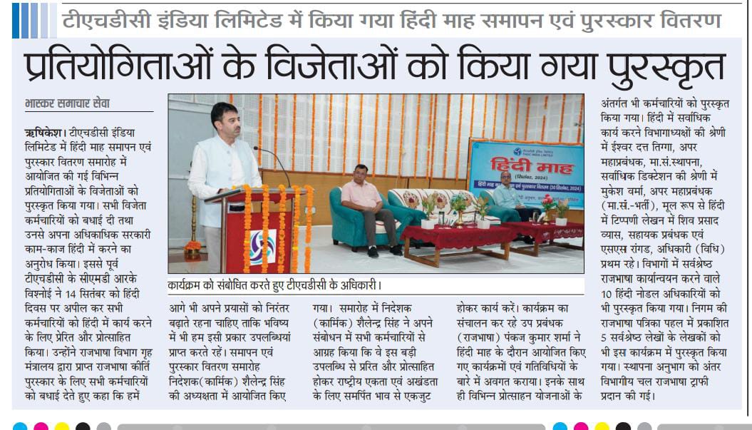 टीएचडीसी में सितंबर, 2024 हिंदी माह के रूप में मनाया गया। जिसका समापन एवं पुरस्कार वितरण समारोह आज श्री शैलेन्द्र सिंह, निदेशक(कार्मिक) की अध्यक्षता में आयोजित किए गया। कार्यक्रम का शुभारंभ दीप प्रज्ज्वलित कर किया गया । श्री सिंह के कर-कमलों से हिंदी माह के दौरान आयोजित की गई प्रतियोगिताओं एवं निगम में लागू विभिन्न प्रोत्साहन योजनाओं के अंतर्गत अधिकारियों व कर्मचारियों को पुरस्कृत किया गया।