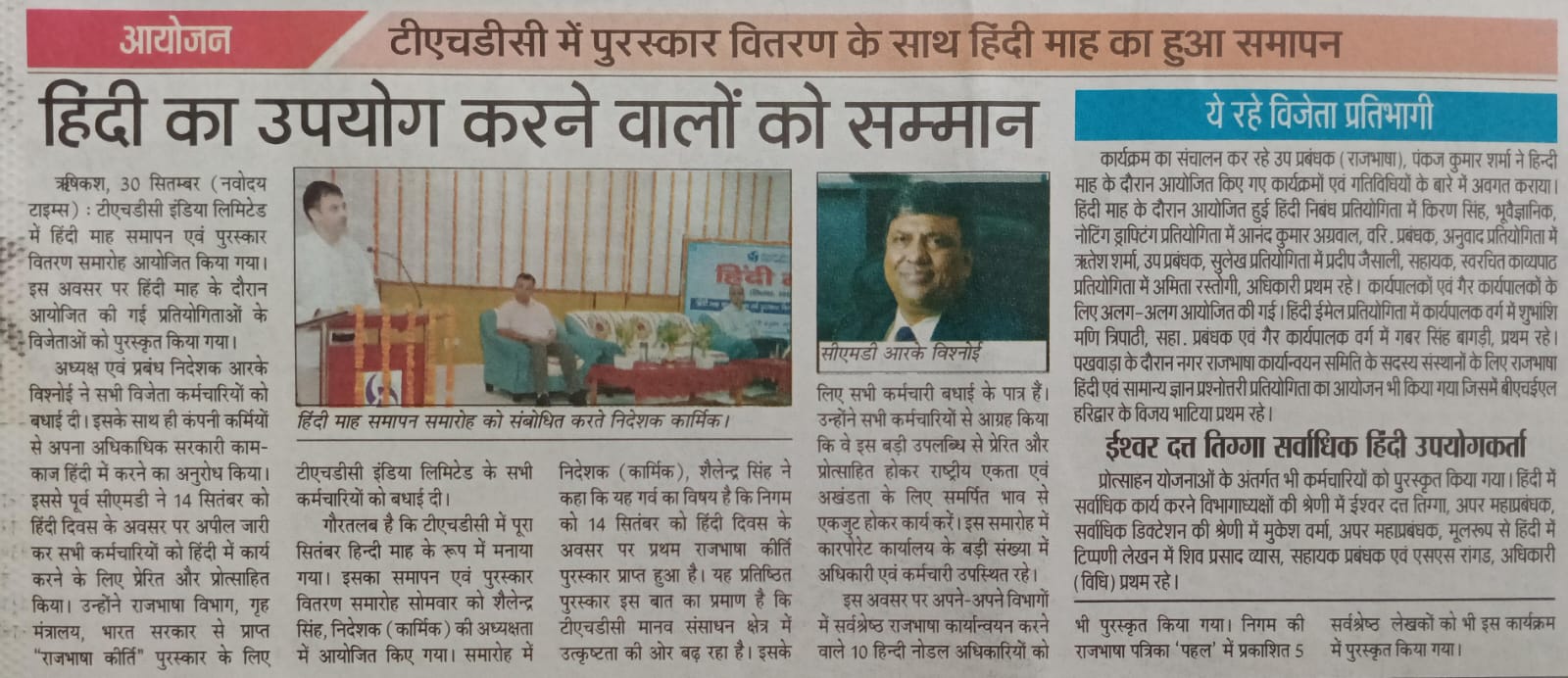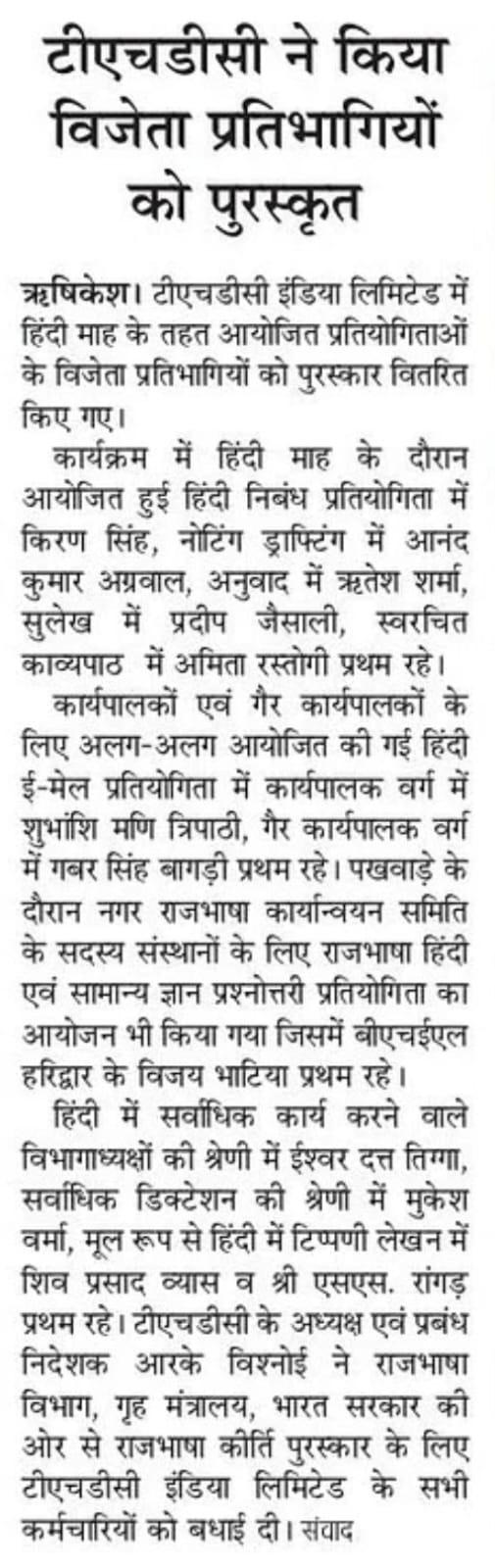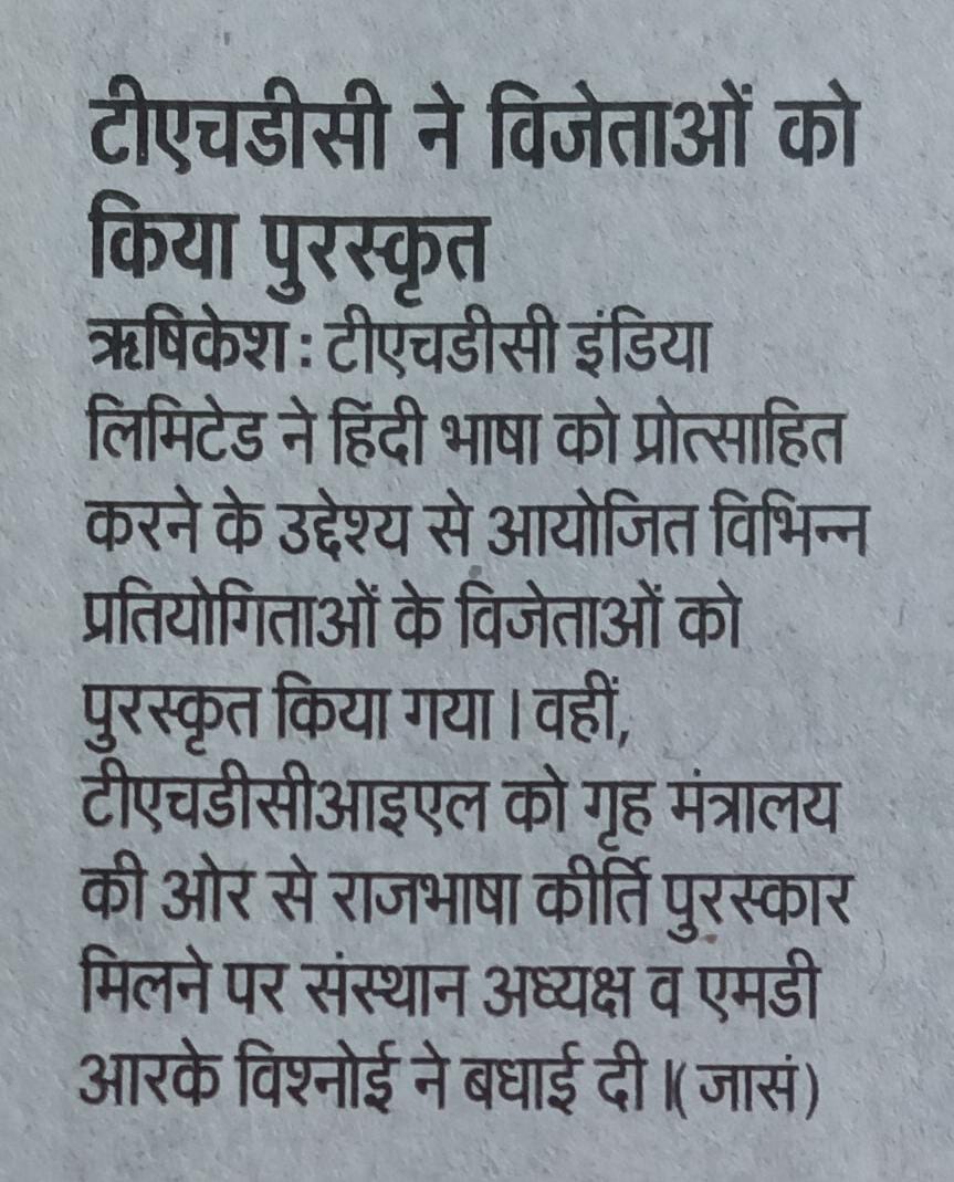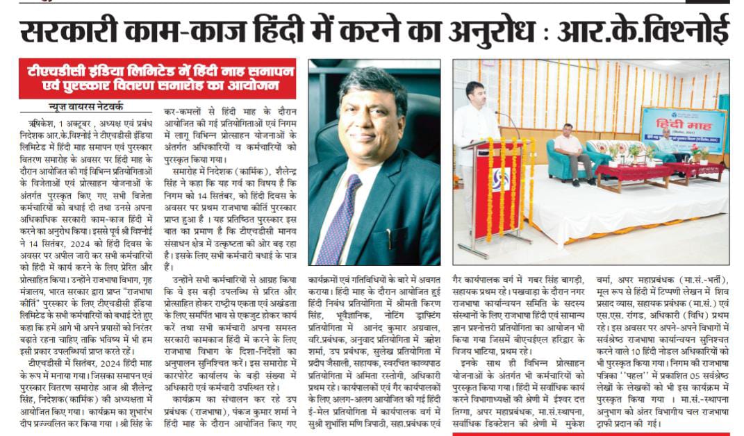 टीएचडीसी में सितंबर, 2024 हिंदी माह के रूप में मनाया गया। जिसका समापन एवं पुरस्कार वितरण समारोह आज श्री शैलेन्द्र सिंह, निदेशक(कार्मिक) की अध्यक्षता में आयोजित किए गया। कार्यक्रम का शुभारंभ दीप प्रज्ज्वलित कर किया गया । श्री सिंह के कर-कमलों से हिंदी माह के दौरान आयोजित की गई प्रतियोगिताओं एवं निगम में लागू विभिन्न प्रोत्साहन योजनाओं के अंतर्गत अधिकारियों व कर्मचारियों को पुरस्कृत किया गया।