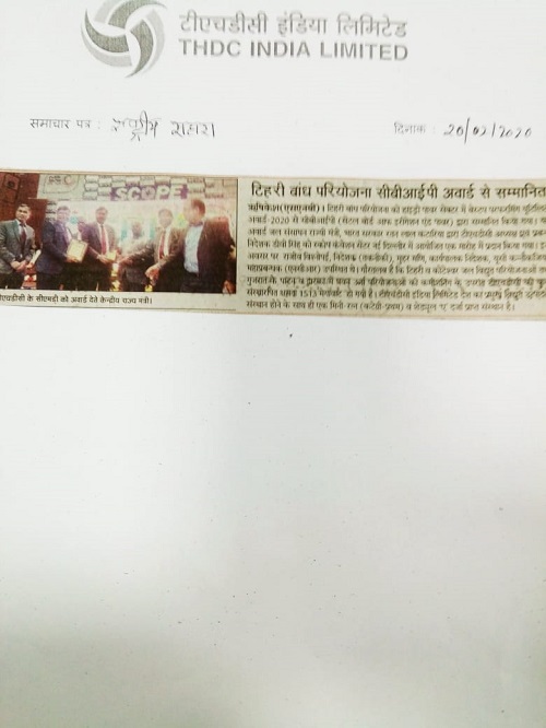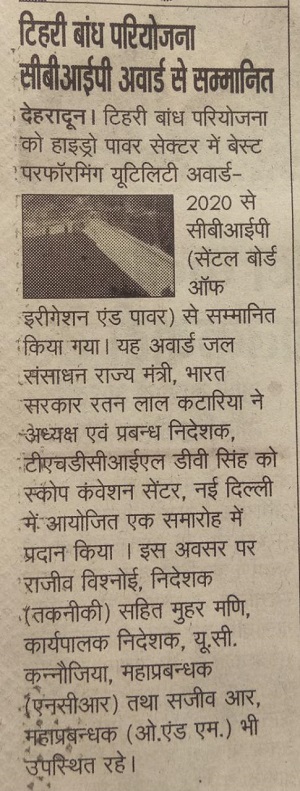 19 फरवरी, 2020 :टिहरी बांध परियोजना को हाइड्रो पावर सेक्‍टर में बेस्‍ट परफॉरमिंग यूटिलिटी अवार्ड-2020 से सीबीआईपी (सेंटल बोर्ड ऑफ इरीगेशन एंड पावर) द्वारा सम्‍मानित किया गया। यह अवार्ड माननीय जल संसाधन राज्‍य मंत्री, भारत सरकार श्री रतन लाल कटारिया द्वारा श्री डी.वी. सिंह, अध्‍यक्ष एवं प्रबन्‍ध निदेशक, टीएचडीसीआईएल को स्‍कोप कंवेशन सेंटर, नई दिल्‍ली में आयोजित एक भब्‍य समारोह में प्रदान किया गया। इस अवसर पर श्री राजीव विश्‍नोई, निदेशक (तकनीकी) सहित श्री मुहर मणि, कार्यपालक निदेशक, श्री यू.सी. कन्‍नौजिया, महाप्रबन्‍धक (एनसीआर) तथा सजीव आर, महाप्रबन्‍धक (ओ.एंड एम.) भी उपस्‍थित रहे।