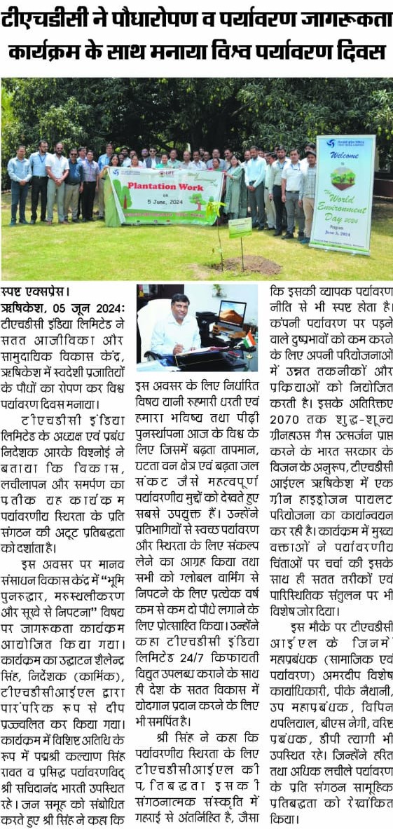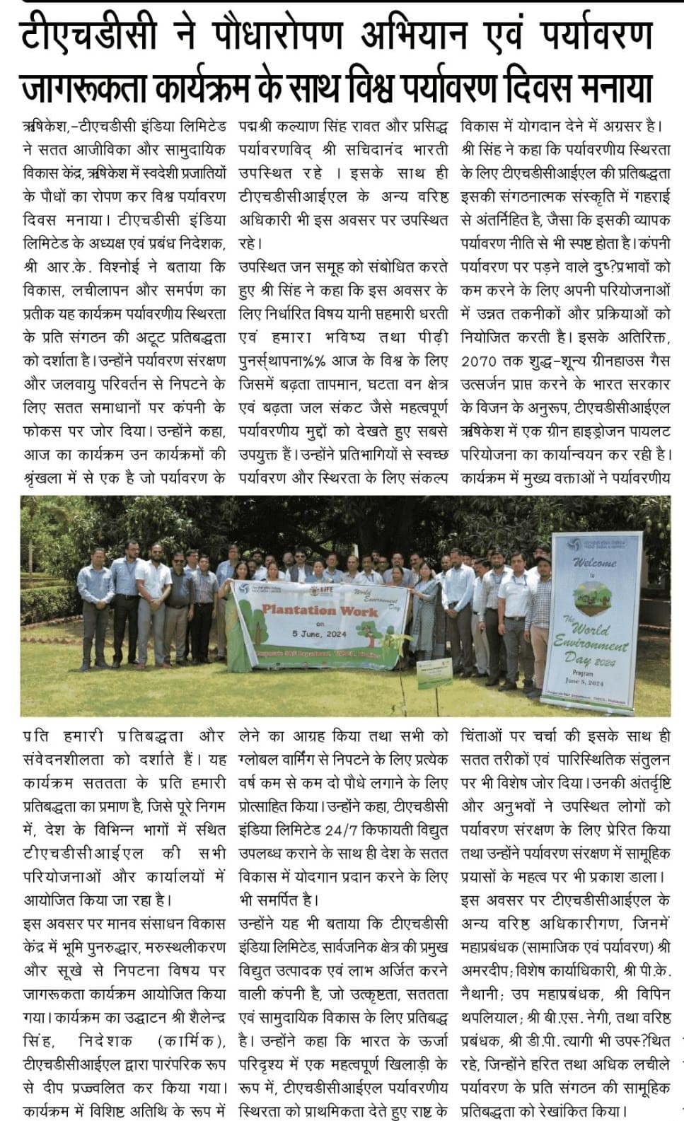 Rishikesh, 05 June 2024- THDC India Limited (THDCIL) celebrated World Environment Day by planting saplings of indigenous species at the Sustainable Livelihood and Community Development Center in Rishikesh. Sh. R. K. Vishnoi, Chairman and Managing Director, THDC India Limited informed that the event, symbolizing growth, resilience, and dedication, reflects the organization’s unwavering commitment to environmental sustainability. He emphasized the company’s focus on environmental stewardship and sustainable solutions to combat climate change. “Today’s event is amongst a series of events which exemplifies our commitment and sensitivity towards the environment. This event is a testament to our dedication to sustainability, which is being organized across the organization, in all our projects and offices throughout the country,” he stated.