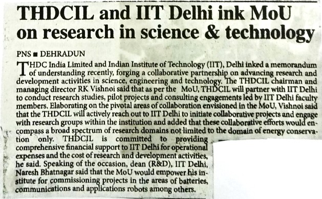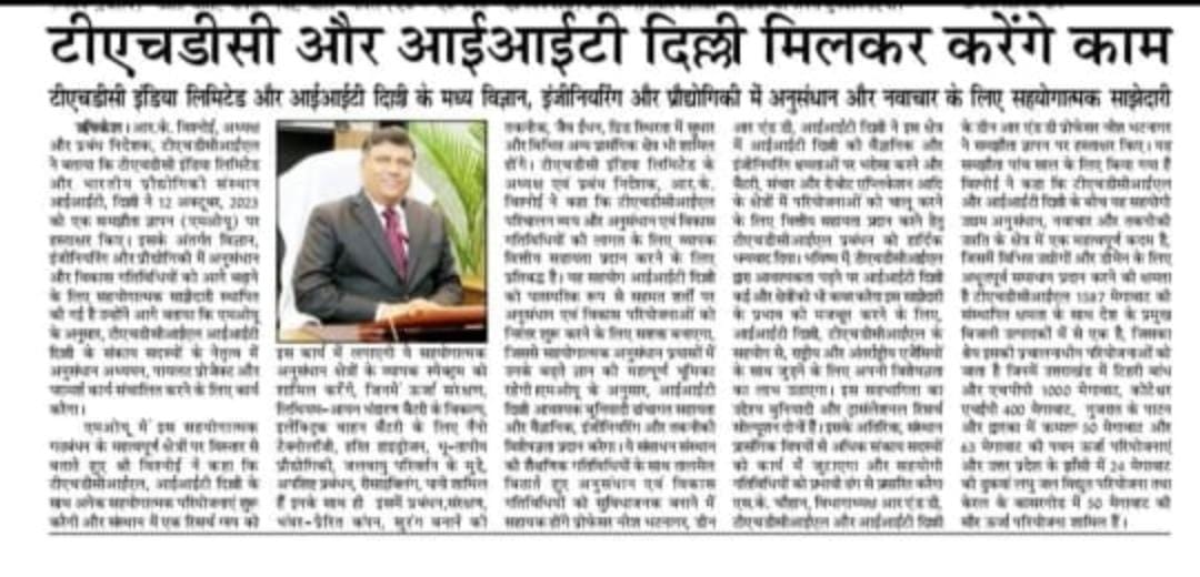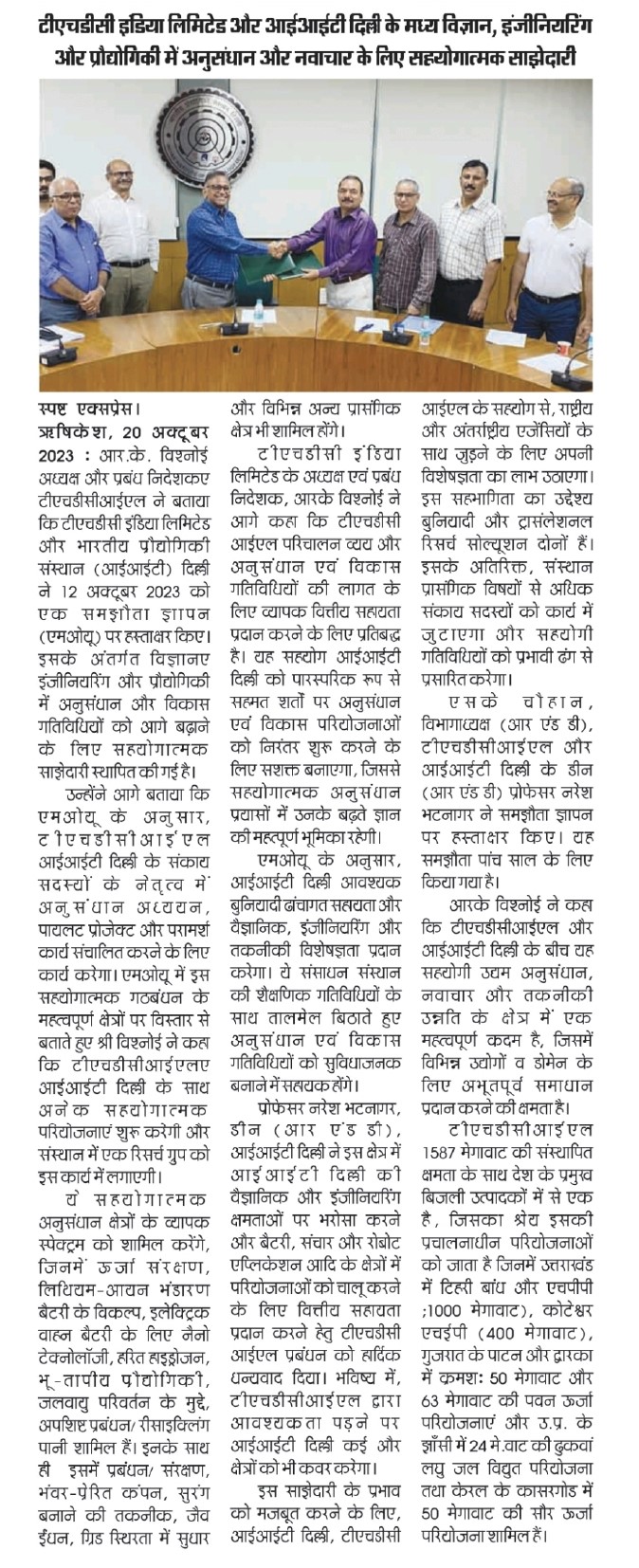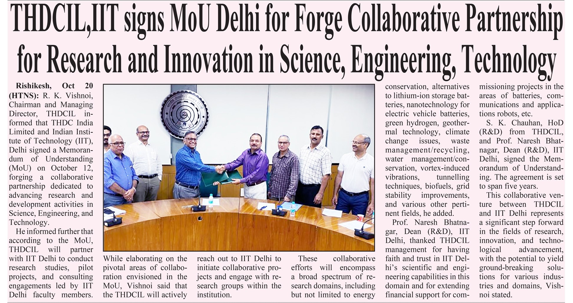 Rishikesh: 20.10.2023:- Sh. R. K. Vishnoi, Chairman and Managing Director, THDCIL informed that THDC India Limited and Indian Institute of Technology (IIT), Delhi signed a Memorandum of Understanding (MoU) on October 12, 2023, forging a collaborative partnership dedicated to advancing research and development activities in Science, Engineering, and Technology. He informed further that according to the MoU, THDCIL will partner with IIT Delhi to conduct research studies, pilot projects, and consulting engagements led by IIT Delhi faculty members. While elaborating on the pivotal areas of collaboration envisioned in the MoU, Sh. Vishnoi said that the THDCIL will actively reach out to IIT Delhi to initiate collaborative projects and engage with research groups within the institution. These collaborative efforts will encompass a broad spectrum of research domains, including but not limited to energy conservation, alternatives to lithium-ion storage batteries, nanotechnology for electric vehicle batteries, green hydrogen, geothermal technology, climate change issues, waste management/recycling, water management/conservation, vortex-induced vibrations, tunnelling techniques, biofuels, grid stability improvements, and various other pertinent fields, he added. “THDCIL has committed to providing comprehensive financial support for operational expenses and the cost of research and development activities. This support will empower IIT Delhi to continuously undertake RD projects on mutually agreed terms, cementing their role as a knowledge partner in collaborative research efforts”, Sh. R. K. Vishnoi, Chairman and Managing Director, THDC India Limited, said. According to the MoU, IIT Delhi will offer essential infrastructural support and access to scientific, engineering and technical expertise. These resources will be instrumental in facilitating RD activities, aligning with the academic pursuits of the institute. Prof. Naresh Bhatnagar, Dean (RD), IIT Delhi, expressed his sincere thanks to THDCIL management for having faith and trust in IIT Delhi’s scientific and engineering capabilities in this domain and for extending financial support for commissioning projects in the areas of batteries, communications and applications robots, etc. In the future, IIT Delhi will also cover many more areas, if needed by the THDCIL. In a bid to fortify the impact of this partnership, IIT Delhi, with the backing of THDCIL, will leverage its expertise to engage with national and international agencies. This engagement is aimed at both basic and translational research solutions. Additionally, the institute will involve more faculty members from relevant disciplines and disseminate the collaborative activities effectively. Sh. S. K. Chauhan, HoD (RD) from THDCIL, and Prof. Naresh Bhatnagar, Dean (RD), IIT Delhi, signed the Memorandum of Understanding. The agreement is set to span five years. This collaborative venture between THDCIL and IIT Delhi represents a significant step forward in the fields of research, innovation, and technological advancement, with the potential to yield ground-breaking solutions for various industries and domains, Sh. Vishnoi stated. THDCIL is one of the premier power generators in the country with an installed capacity of 1587 MW, with commissioning of Tehri Dam and HPP (1000 MW), Koteshwar HEP (400 MW) in Uttarakhand, wind power projects of 50 MW at Patan and 63 MW at Dwarka in Gujarat, the 24 MW Dhukwan Small Hydro Project in Jhansi, Uttar Pradesh, and the 50 MW Solar Power Project at Kasaragod, Kerala, to its credit.