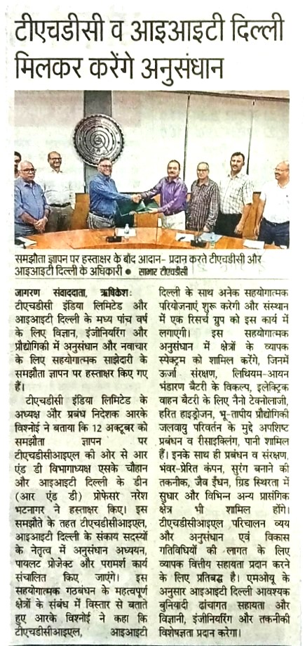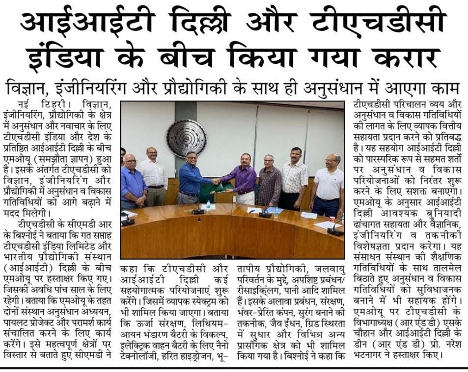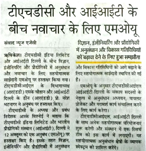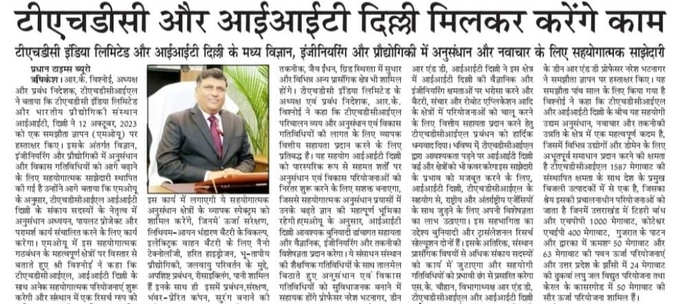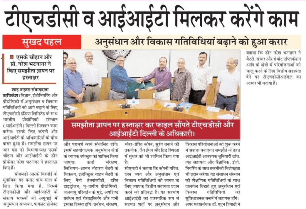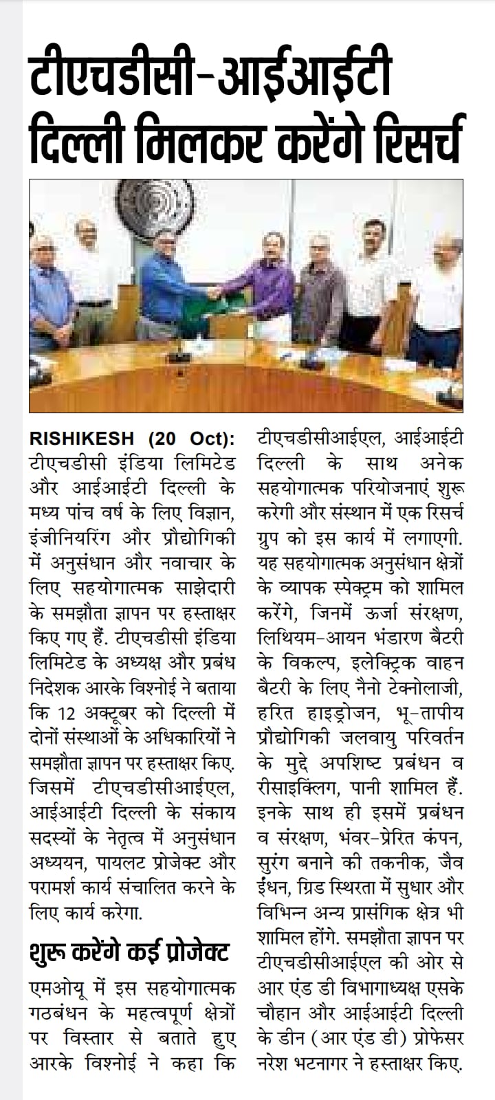 Rishikesh: 20.10.2023:- Sh. R. K. Vishnoi, Chairman and Managing Director, THDCIL informed that THDC India Limited and Indian Institute of Technology (IIT), Delhi signed a Memorandum of Understanding (MoU) on October 12, 2023, forging a collaborative partnership dedicated to advancing research and development activities in Science, Engineering, and Technology. He informed further that according to the MoU, THDCIL will partner with IIT Delhi to conduct research studies, pilot projects, and consulting engagements led by IIT Delhi faculty members. While elaborating on the pivotal areas of collaboration envisioned in the MoU, Sh. Vishnoi said that the THDCIL will actively reach out to IIT Delhi to initiate collaborative projects and engage with research groups within the institution. These collaborative efforts will encompass a broad spectrum of research domains, including but not limited to energy conservation, alternatives to lithium-ion storage batteries, nanotechnology for electric vehicle batteries, green hydrogen, geothermal technology, climate change issues, waste management/recycling, water management/conservation, vortex-induced vibrations, tunnelling techniques, biofuels, grid stability improvements, and various other pertinent fields, he added. “THDCIL has committed to providing comprehensive financial support for operational expenses and the cost of research and development activities. This support will empower IIT Delhi to continuously undertake RD projects on mutually agreed terms, cementing their role as a knowledge partner in collaborative research efforts”, Sh. R. K. Vishnoi, Chairman and Managing Director, THDC India Limited, said. According to the MoU, IIT Delhi will offer essential infrastructural support and access to scientific, engineering and technical expertise. These resources will be instrumental in facilitating RD activities, aligning with the academic pursuits of the institute. Prof. Naresh Bhatnagar, Dean (RD), IIT Delhi, expressed his sincere thanks to THDCIL management for having faith and trust in IIT Delhi’s scientific and engineering capabilities in this domain and for extending financial support for commissioning projects in the areas of batteries, communications and applications robots, etc. In the future, IIT Delhi will also cover many more areas, if needed by the THDCIL. In a bid to fortify the impact of this partnership, IIT Delhi, with the backing of THDCIL, will leverage its expertise to engage with national and international agencies. This engagement is aimed at both basic and translational research solutions. Additionally, the institute will involve more faculty members from relevant disciplines and disseminate the collaborative activities effectively. Sh. S. K. Chauhan, HoD (RD) from THDCIL, and Prof. Naresh Bhatnagar, Dean (RD), IIT Delhi, signed the Memorandum of Understanding. The agreement is set to span five years. This collaborative venture between THDCIL and IIT Delhi represents a significant step forward in the fields of research, innovation, and technological advancement, with the potential to yield ground-breaking solutions for various industries and domains, Sh. Vishnoi stated. THDCIL is one of the premier power generators in the country with an installed capacity of 1587 MW, with commissioning of Tehri Dam and HPP (1000 MW), Koteshwar HEP (400 MW) in Uttarakhand, wind power projects of 50 MW at Patan and 63 MW at Dwarka in Gujarat, the 24 MW Dhukwan Small Hydro Project in Jhansi, Uttar Pradesh, and the 50 MW Solar Power Project at Kasaragod, Kerala, to its credit.