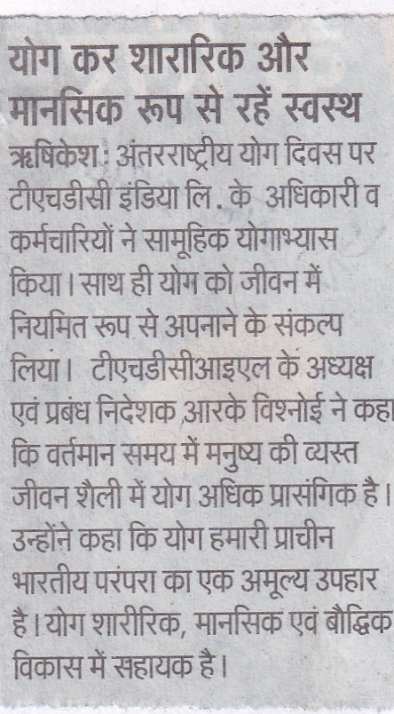 During the occasion Sh. Sandeep Singhal, ED (Technical), Dr. A. N. Tripathy, CGM (HR &A and CC), and other senior officials of THDCIL were present. International Yoga Day was celebrated with fervour at all the projects and unit offices of THDCIL.