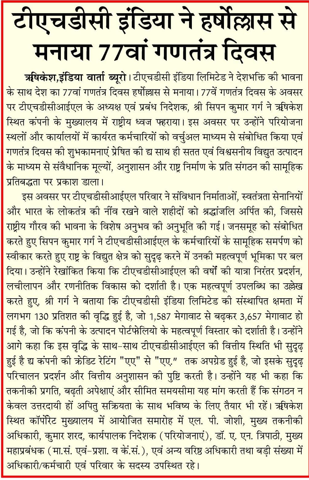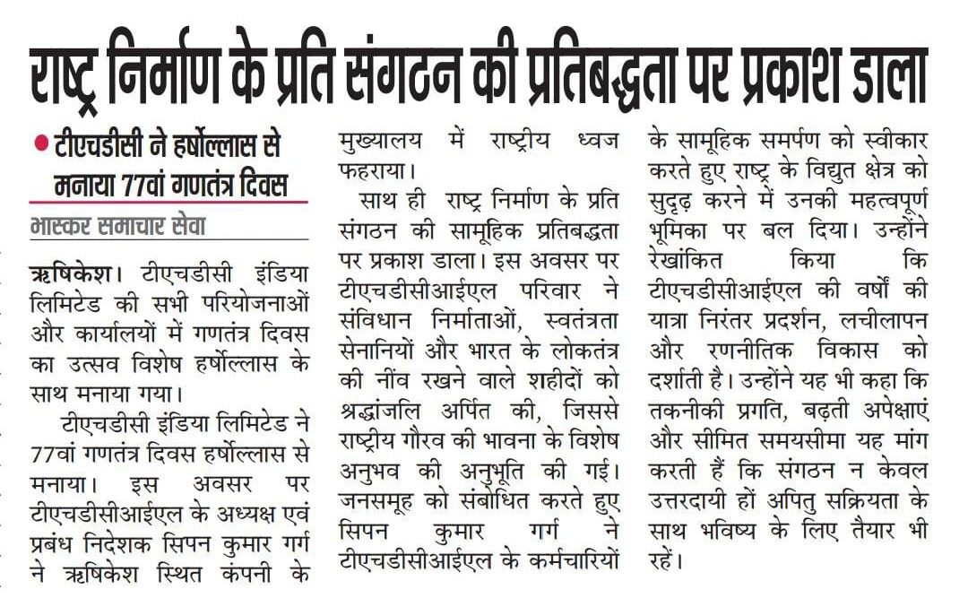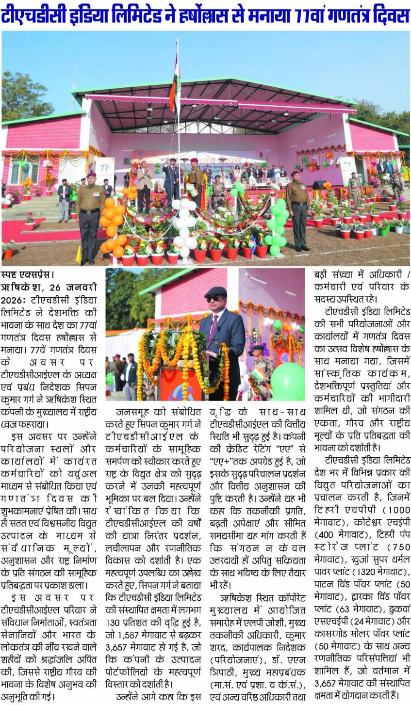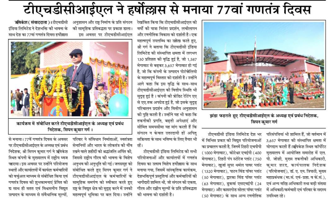 Rishikesh, 26-01-2026: THDC India Limited celebrated the 77th Republic Day with great patriotic fervour. Shri Sipan Kumar Garg, Chairman & Managing Director, THDCIL, unfurled the National Flag at its Corporate Headquarters in Rishikesh. On the occasion, he addressed employees across project sites and offices through virtual platform, extending his Republic Day greetings and highlighting the organisation’s collective commitment to constitutional values, discipline, and nation-building through sustainable and reliable power generation.