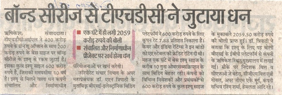 Rishikesh- 24.12.2022 :THDCIL has successfully raised the funds through issue of Unsecured Bonds Series -VII with a base size of Rs 200 Cr with green shoe option of Rs 400 Cr with total issue size amounting to Rs. 600 Cr having a tenor of 10 years. The issue proceeds will be utilised to partly meet debt requirement of on going and under construction projects of the company as company is in its expansion phase.