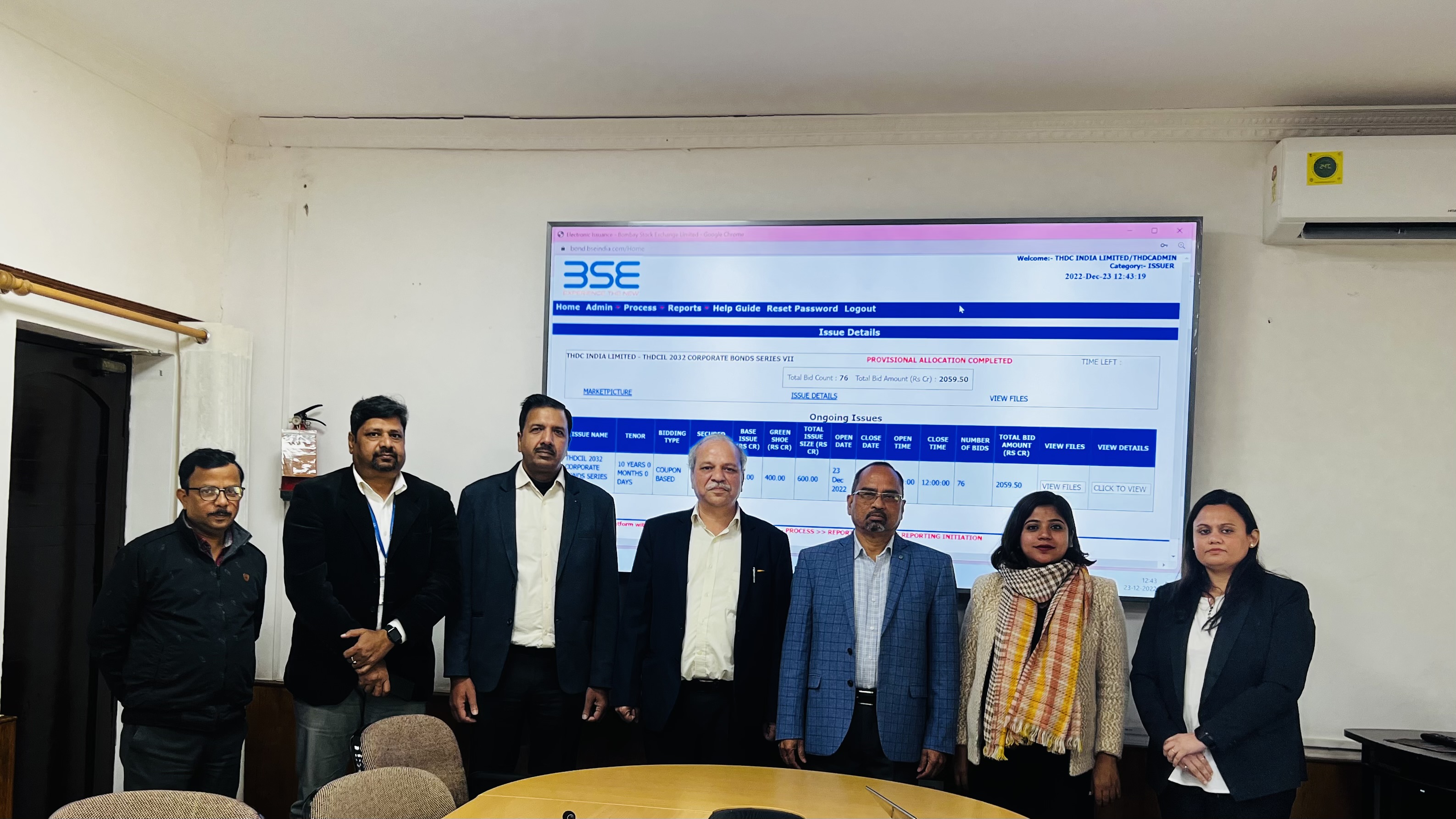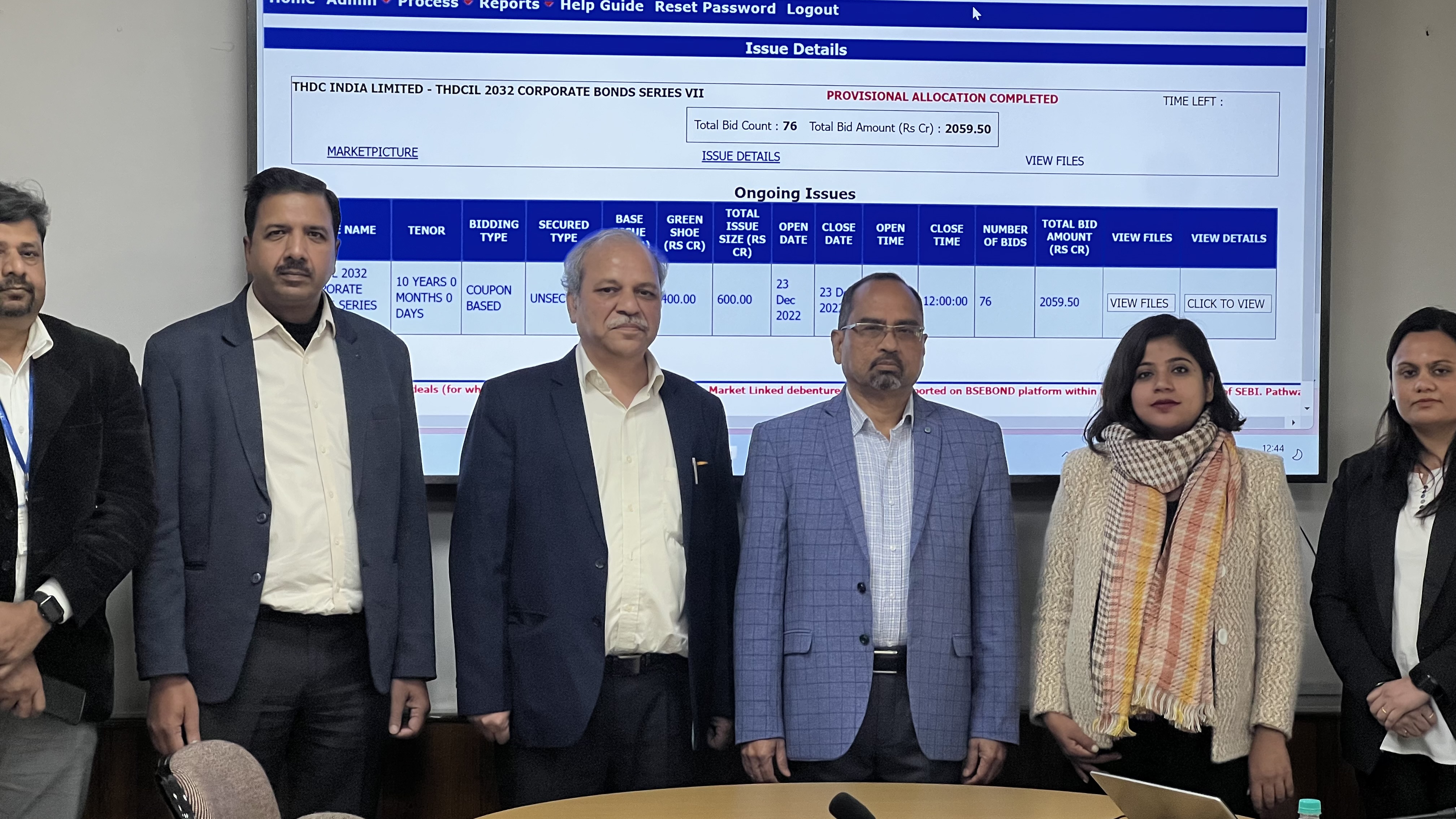 The bidding for the above issue was done through BSE’s EBP Platform, on 23rd Dec 2022 at THDCIL's Corporate Office at Rishikesh in presence of Shri J. Behera ,Director ( Finance) and CFO, Shri A.B Goel CGM (Finance), Shri A.K Garg , AGM (Finance), Ms. Rashmi Sharma , Company Secretary and Ms Hemlata Agarwal, BSE Head Northern Region, Listing Sales .