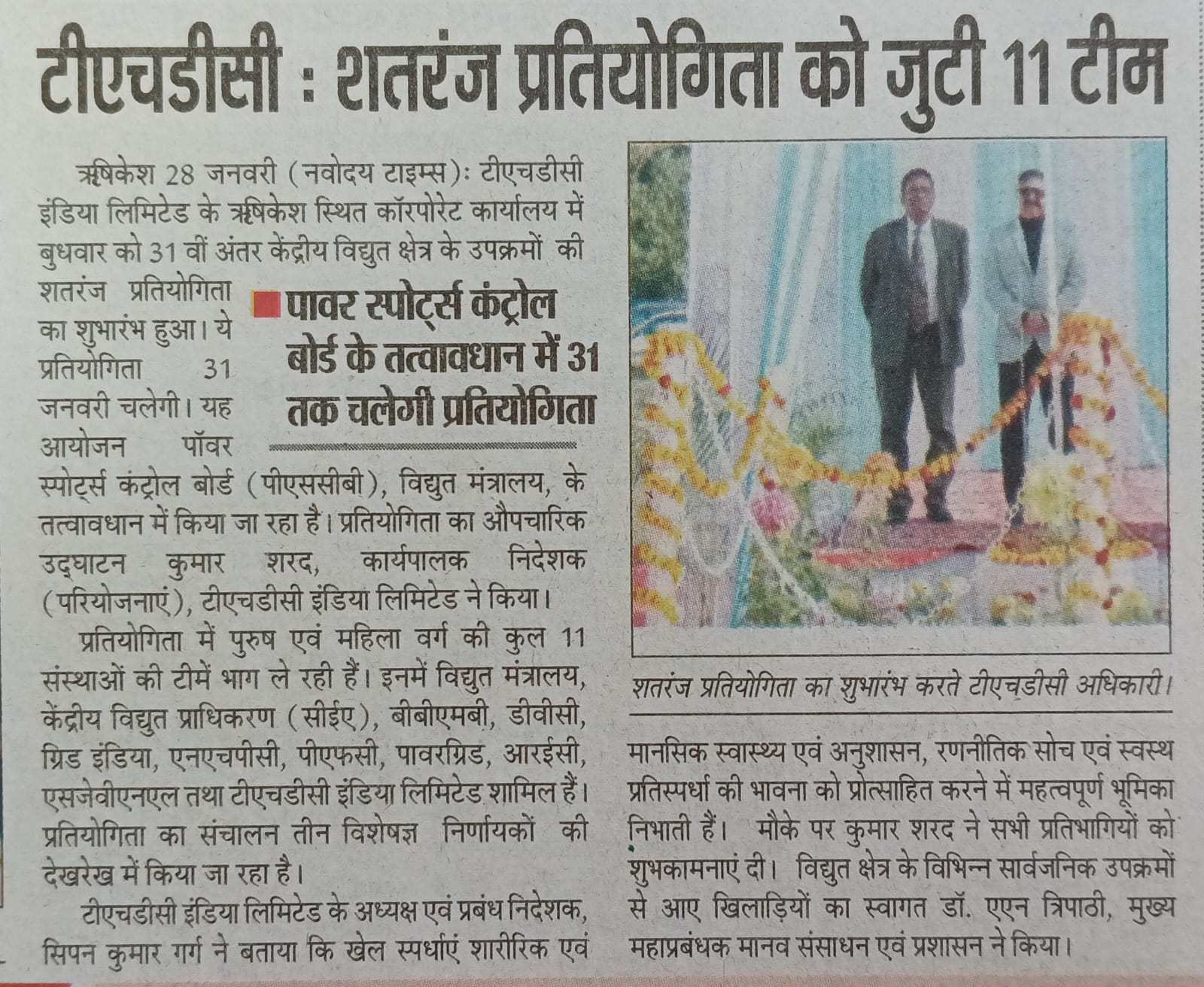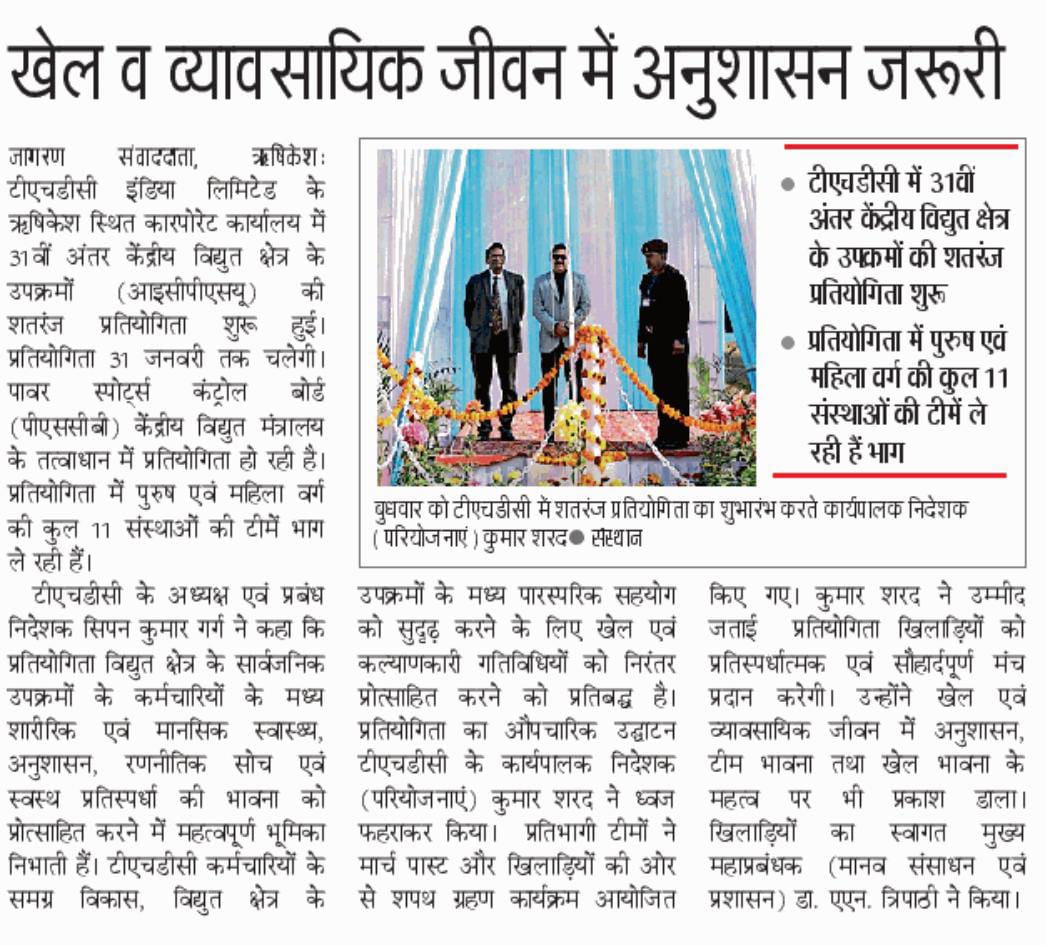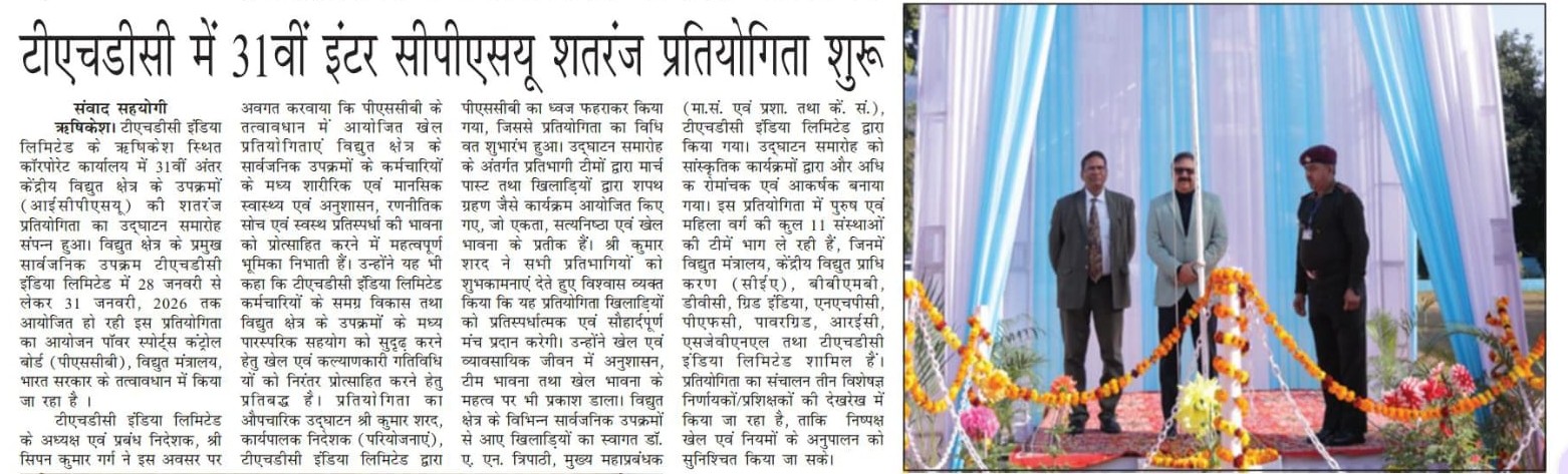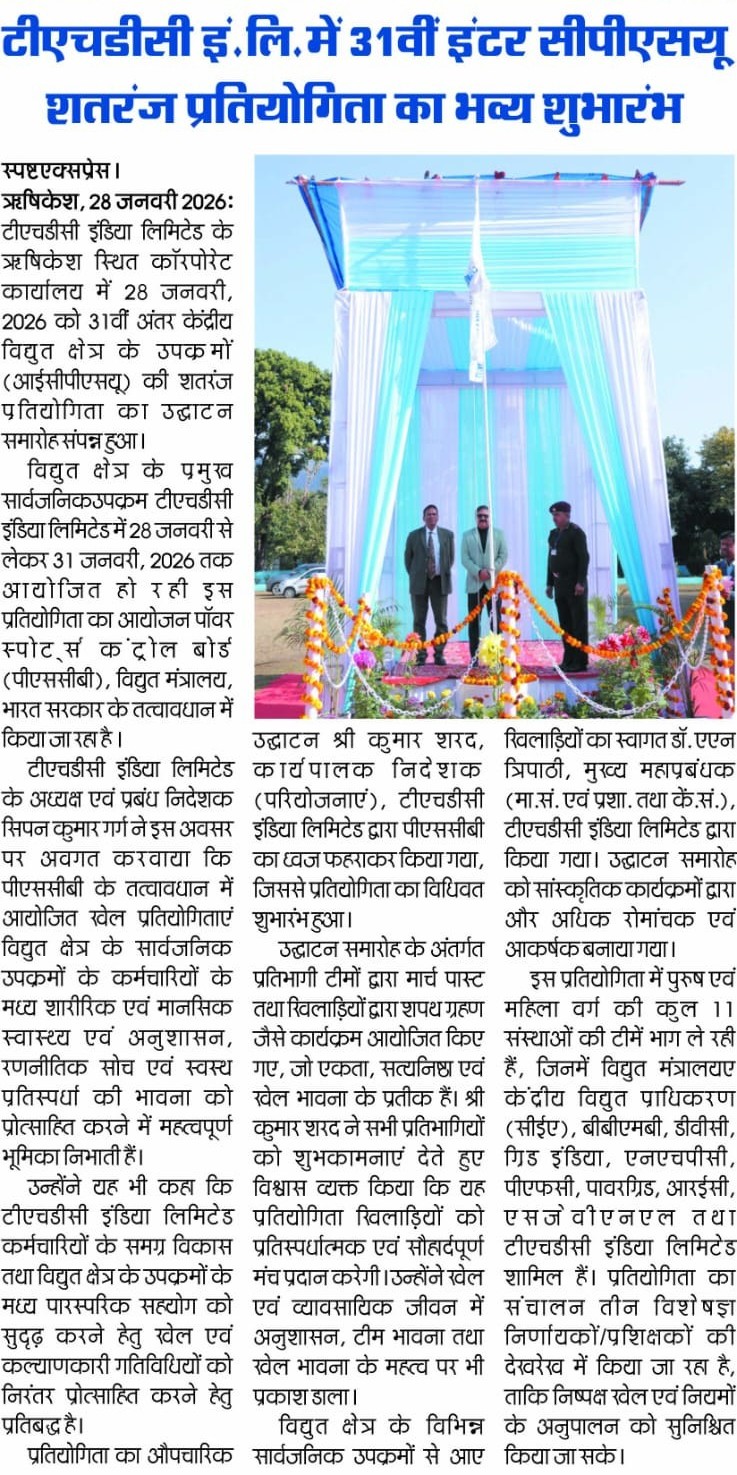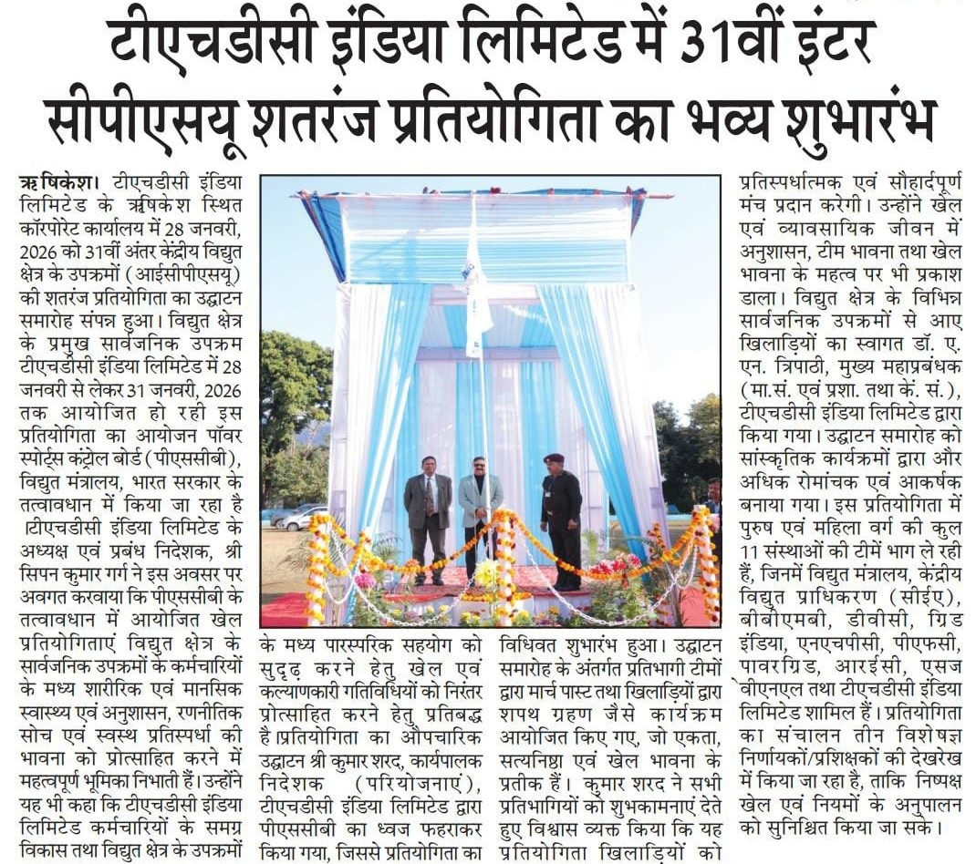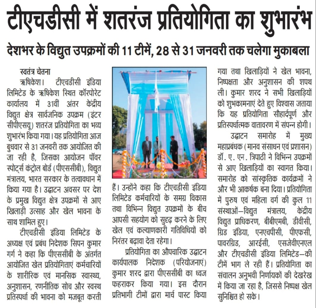 Rishikesh, 28-01-2026: THDC India Limited, a premier power sector entity is hosting the 31st Inter CPSU Chess Tournament under the aegis of the Power Sports Control Board (PSCB), Ministry of Power, Government of India, from 28th January to 31st January, 2026. The inaugural ceremony of the tournament was held today at the Corporate Office of THDC India Limited, Rishikesh.
