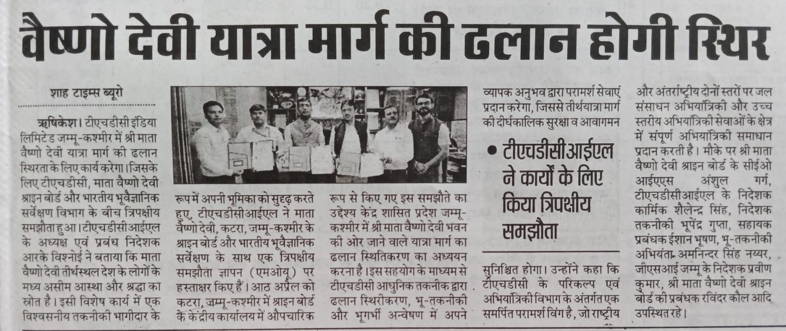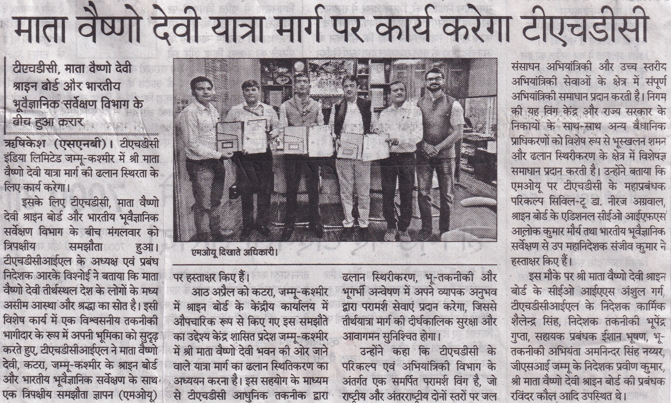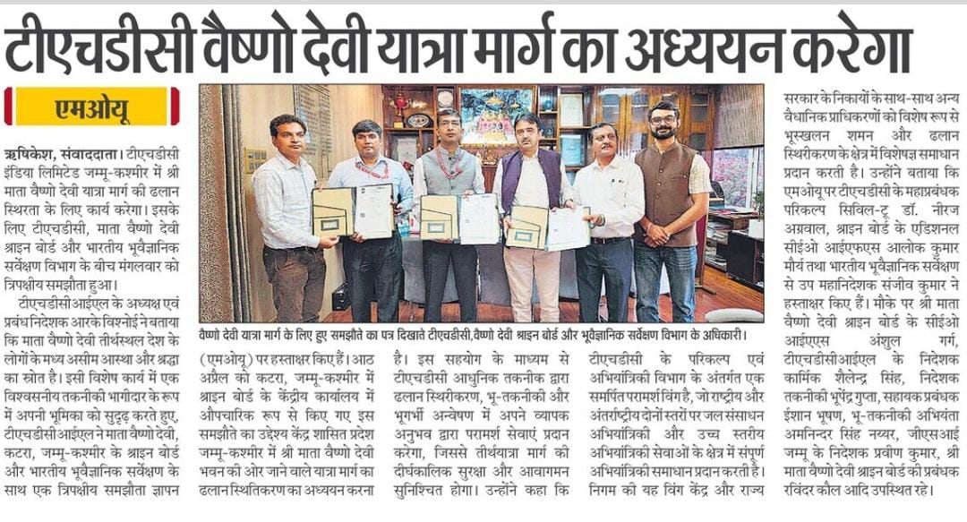 The MoU was signed by, Shri Alok Kumar Maurya, IFS, Additional Chief Executive Officer from the Shri Mata Vaishno Devi Shrine Board, Dr. Niraj Agrawal, GM, Design (Civil-II) of THDCIL and Sh. Sanjiv Kumar, Dy. Director General, GSI (NR) from the Geological Survey of India. Sh. Praveen Kumar, Director, GSI, Jammu, Sh. Ravinder Kaul, Manager, Shri Mata Vaishno Devi Shrine Board, Sh. Ishan Bhushan, Asst. Manager, (CC), THDCIL and Sh. Amninder Singh Nayyar, Geo Technical Engineer, THDCIL were also present during the occasion.