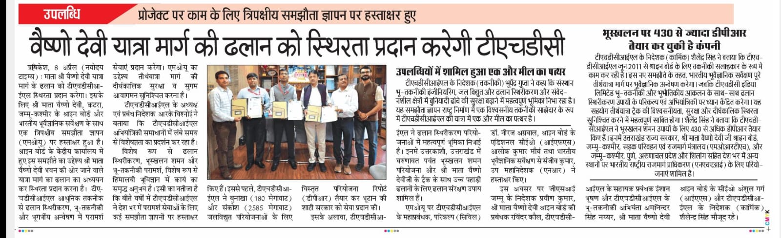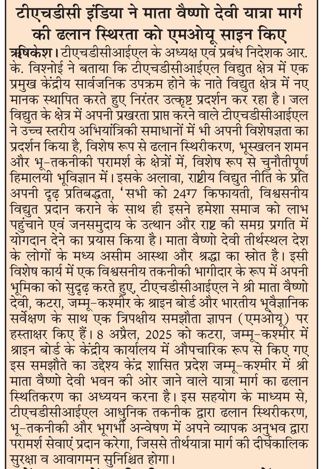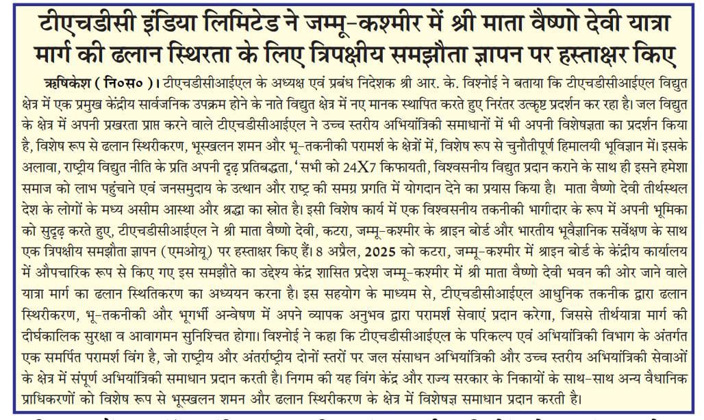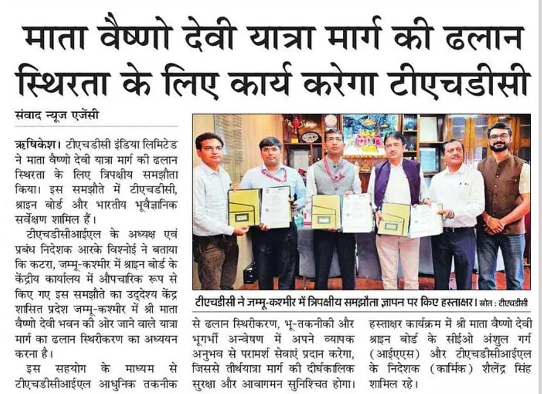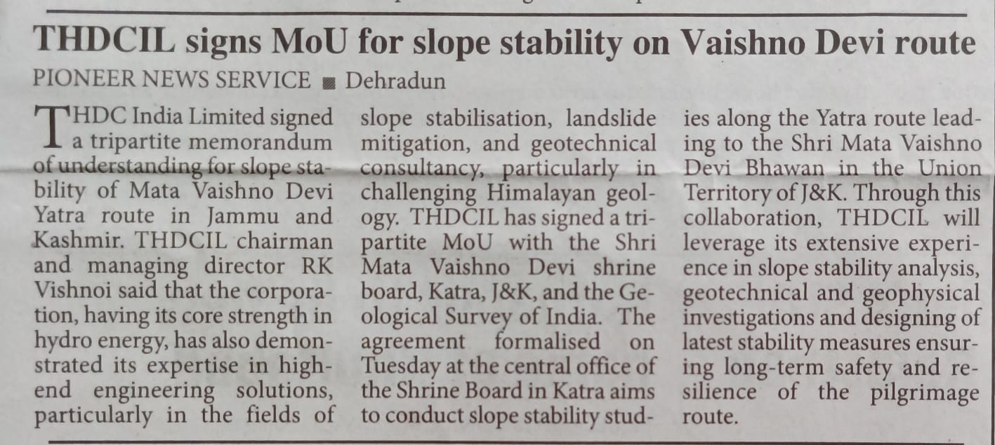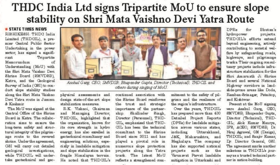 Rishikesh, 08-04-2025: Sh. R. K. Vishnoi, Chairman and Managing Director conveyed that THDCIL being a premier Central PSU in the Power Sector, has consistently displayed excellence by establishing new Bench-Marks in Energy Sector. THDCIL having its core strength in Hydro Energy, has also demonstrated its expertise in high-end engineering solutions, particularly in the fields of slope stabilization, landslide mitigation, and geotechnical consultancy, particularly in challenging Himalayan Geology. Besides, its firm commitment towards the National Power Policy, ‘for providing affordable, 24X7 reliable Power to all,’ it has always endeavoured to give back to the Society and contribute for up-liftment of masses and the over all progress of the Nation. Mata Vaishno Devi Shrine, is a source of immense faith and reverence amongst the masses in the Country and strengthening its role as a trusted technical partner, THDCIL has signed a Tripartite Memorandum of Understanding (MoU) with the Shrine Board of Shri Mata Vaishno Devi, Katra, J&K, and the Geological Survey of India. The Agreement, formalized on April 8, 2025, at the Central Office of the Shrine Board in Katra, J&K, aims to conduct Slope Stability Studies along the Yatra Route leading to the Shri Mata Vaishno Devi Bhawan in the Union Territory of J&K. Through this collaboration, THDCIL will leverage its extensive experience in Slope Stability analysis, geotechnical and geophysical investigations and designing of State-of-Art stability measures ensuring long-term safety and resilience of the pilgrimage route.