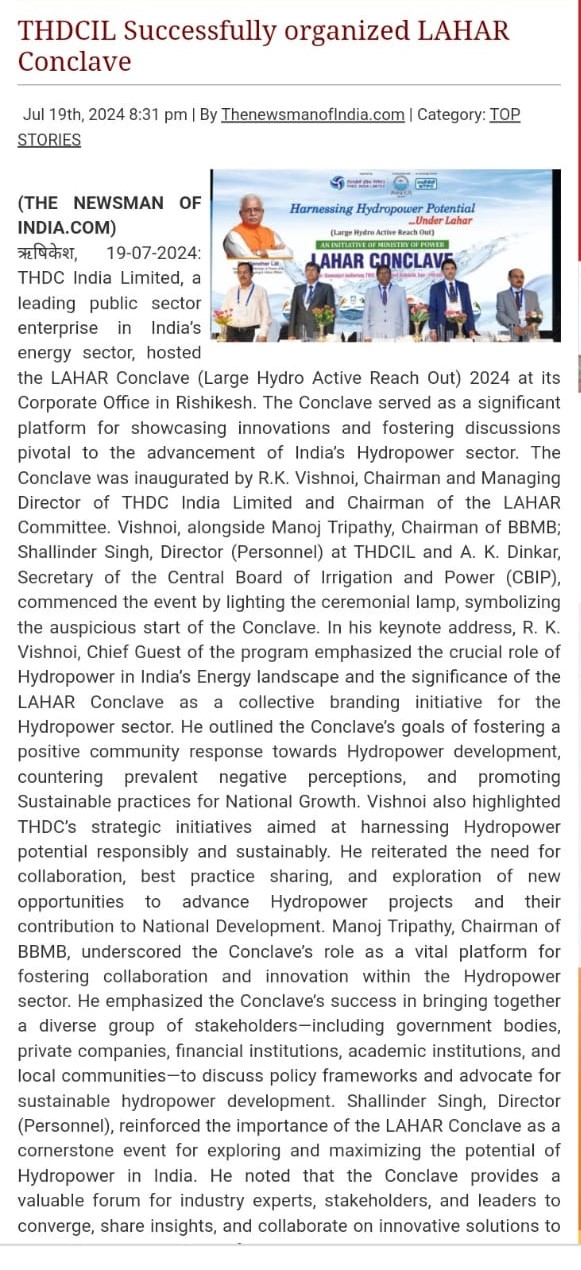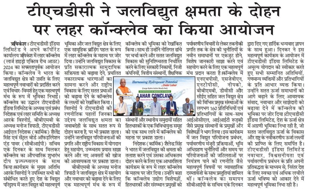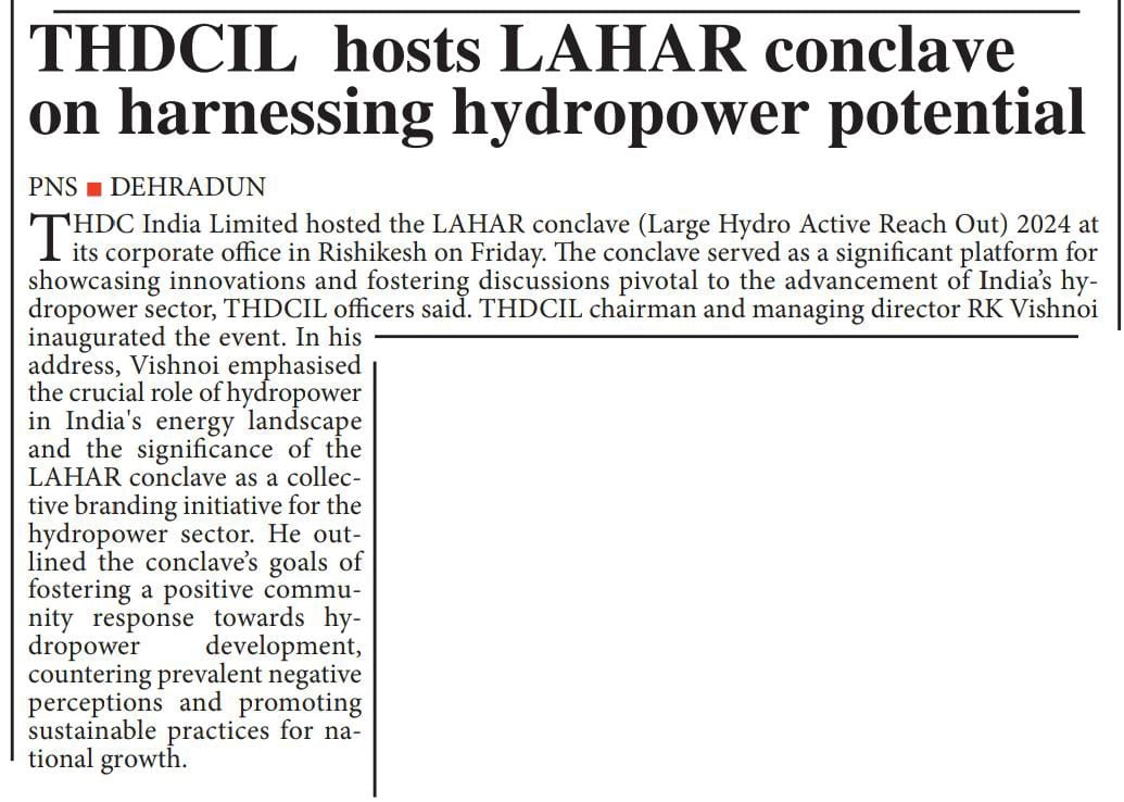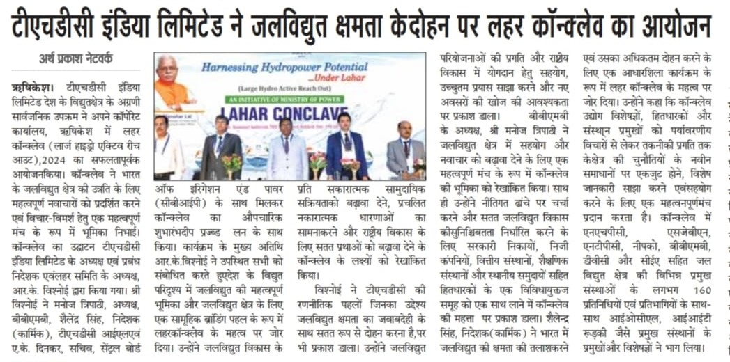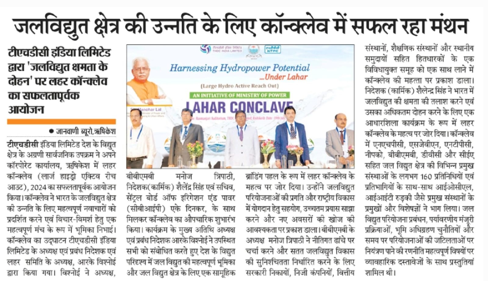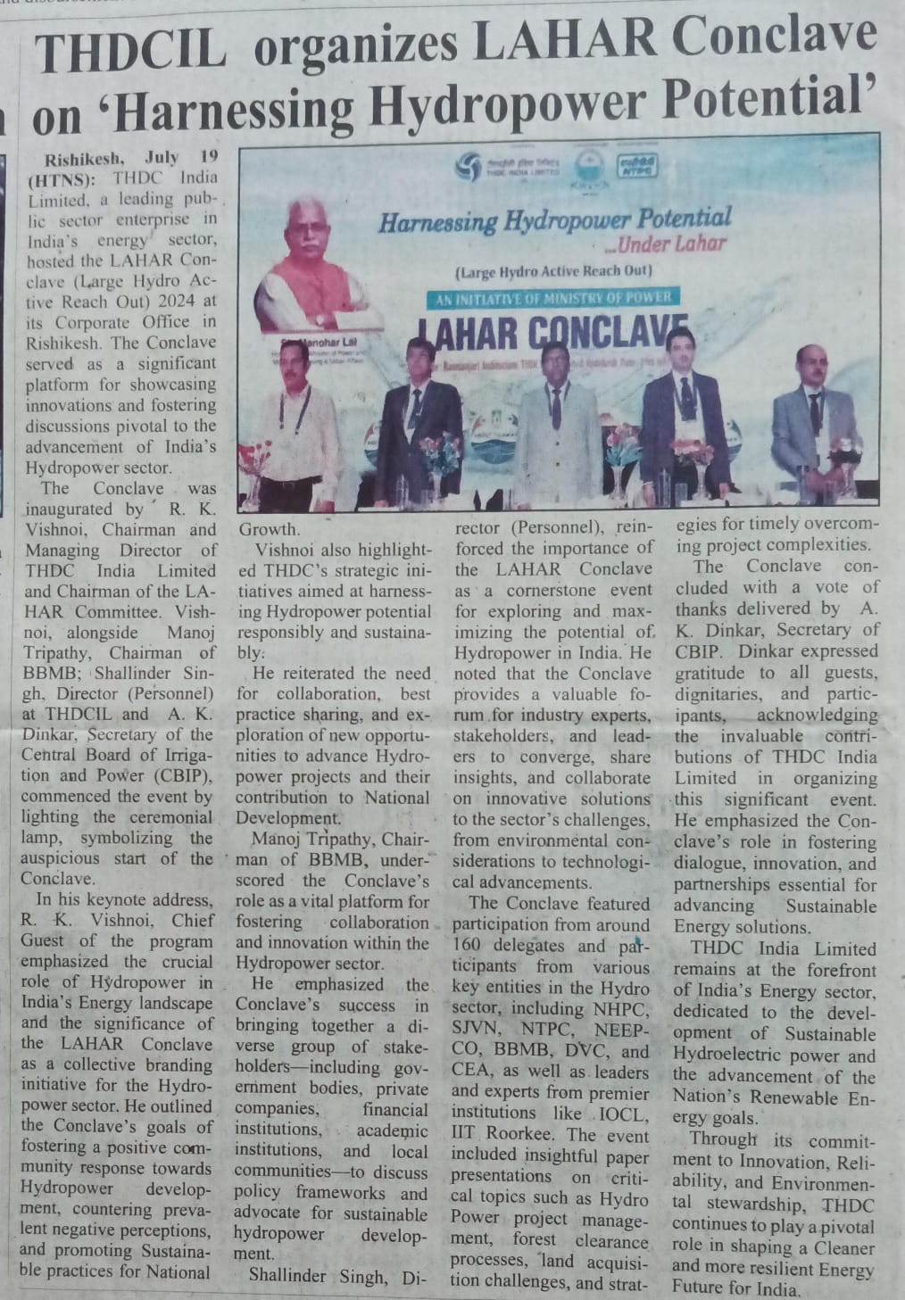 Rishikesh, 19-07-2024: THDC India Limited, a leading public sector enterprise in India’s energy sector, hosted the LAHAR Conclave (Large Hydro Active Reach Out) 2024 at its Corporate Office in Rishikesh. The Conclave served as a significant platform for showcasing innovations and fostering discussions pivotal to the advancement of India’s Hydropower sector.