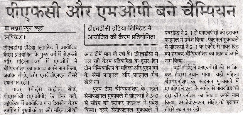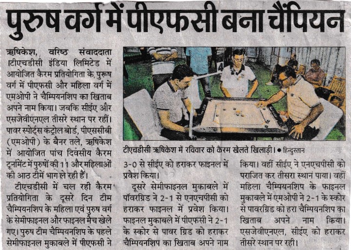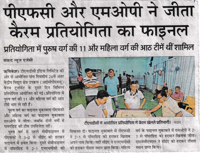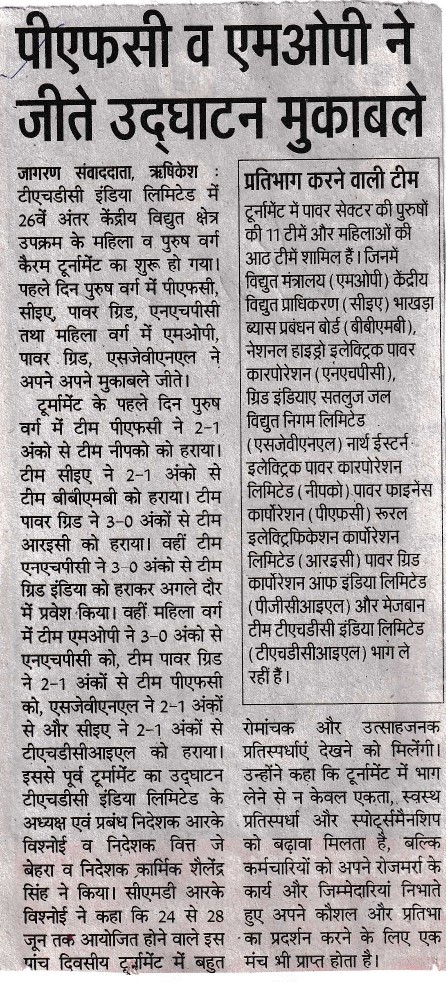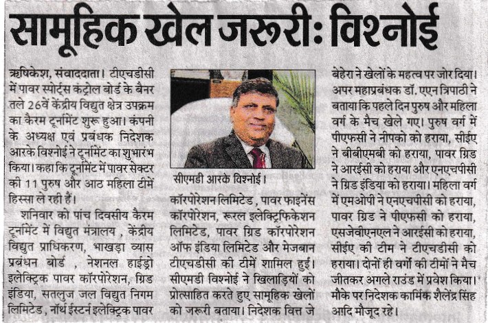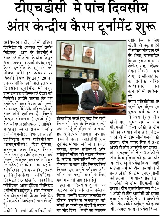 Rishikesh, June 24, 2023 - Sh. R. K. Vishnoi, Chairman and Managing Director of THDC India Limited (THDCIL), announced commencement of 26th Inter Central Power Sector Undertakings (ICPSU) Carrom Tournament organized under the prestigious banner of the Power Sports Control Board, PSCB (MOP), at Rishikesh. Sh. Vishnoi stated that this Five-day event promised thrilling matches and spirited competitions, to be held from 24th to 28th June, 2023. He informed that total 11 Male teams and 08 Female teams of Power Sector viz. Ministry of Power(MOP), Central Electricity Authority (CEA), Bhakhra Beas Management Board (BBMB), National Hydro Electric Power Corporation(NHPC), Grid India, Satluj Jal Vidyut Nigam Ltd (SJVNL), North Eastern Electric Power Corporation Limited (NEEPCO), Power Finance Corporation (PFC), Rural Electrification Corporation Ltd. (REC), Power Grid Corporation of India Limited (PGCIL) and host team THDC India Limited (THDCIL) are participating in this tournament. Sh. Vishnoi encouraged all the participants to embrace competitive spirit while upholding the values of fair play and sportsmanship and urged everyone to collectively promote sports for the wider national interest. Sh. Vishnoi further added that participating in ICPSU Tournaments not only promoted unity, sense of healthy competition and sportsmanship but also provided a platform for the employees to showcase their skills and talents beyond their regular work and responsibilities. Sh. J. Behera, Director (Finance) inaugurated this 05-Day tournament. Addressing the gathering during the inaugural ceremony, he emphasized the importance of sports and encouraged everyone to proactively contribute in promoting sports for wider National Interest. Sh. Shallinder Singh, Director (Personnel) graced the occasion, which was attended by senior officers and employees of THDCIL. On the first day of the Carrom Tournament, team championship matches for men and women were played. In the men's section, team PFC defeated team NEEPCO by 2-1 points, team CEA defeated team BBMB by 2-1 points, team Power Grid defeated team REC by 3-0 points and team NHPC defeated Grid India by 3-0 points and entered in the next round. Whereas in women's section team MOP defeated team NHPC by 3-0 points, teamPower Grid defeated team PFCby 2-1 points, teamSJVNL defeated team REC by 2-1 points and team CEA defeated team THDCIL by 2-1 pointsand entered the next round. THDCIL is one of the premier power generators in the country with installed capacity of 1587 MW with commissioning of Tehri Dam & HPP (1000MW), Koteshwar HEP (400MW) in Uttarakhand, Wind Power Projects of 50MW at Patan & 63MW at Dwarka in Gujarat, 24MW Dhukwan Small Hydro Project, Jhansi, Uttar Pradesh and 50 MW Solar Power Project at Kasaragod, Kerala to its credit.
