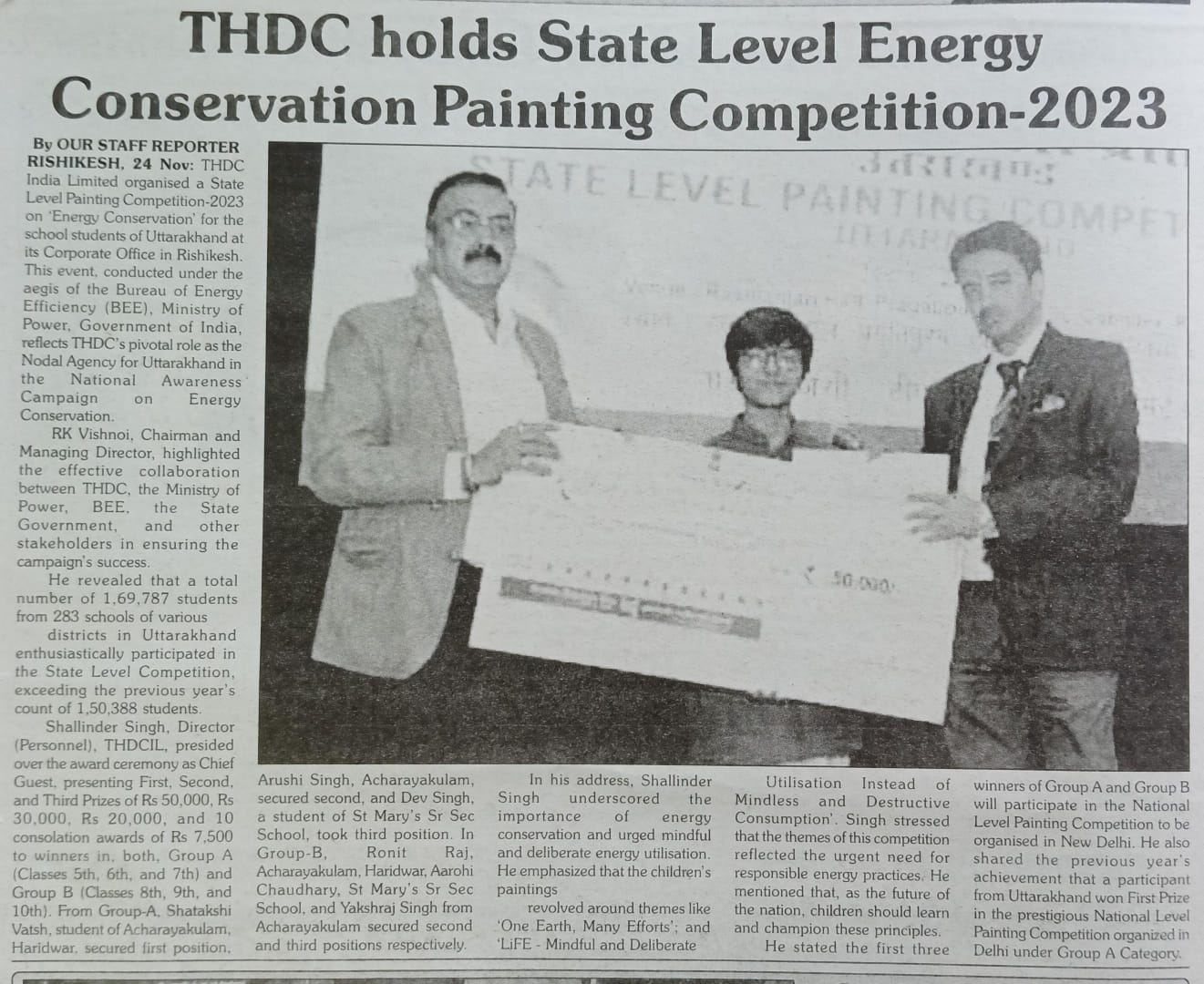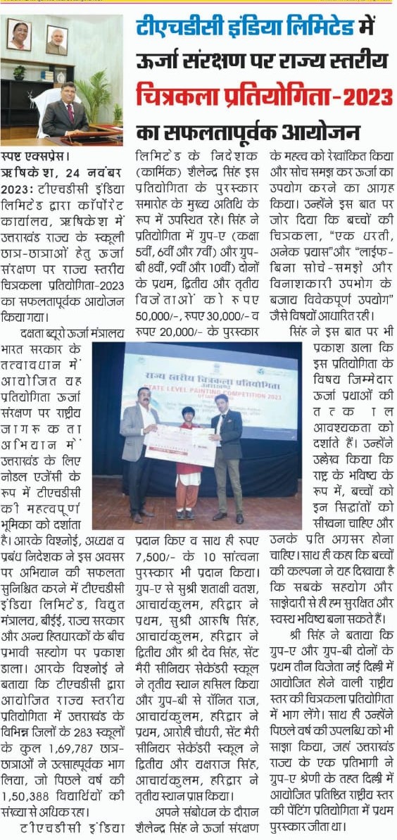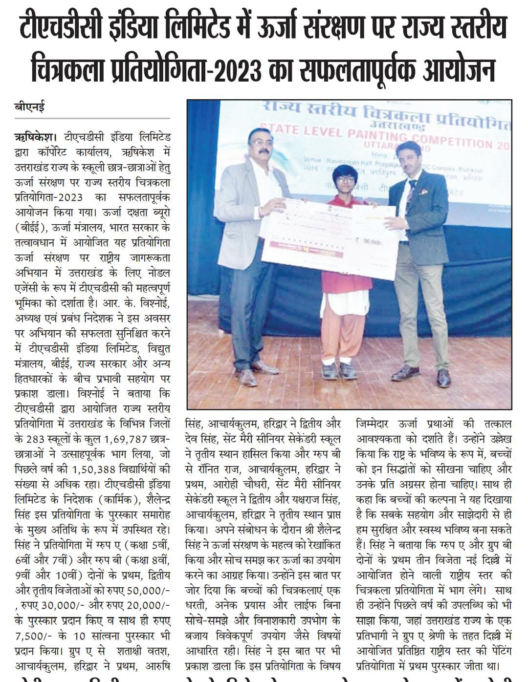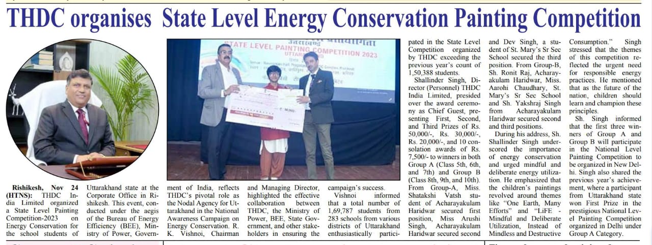 Rishikesh-24.11.2023:THDC India Limited organized a State Level Painting Competition-2023 on Energy Conservation for the school students of Uttarakhand state at the Corporate Office in Rishikesh. This event, conducted under the aegis of the Bureau of Energy Efficiency (BEE), Ministry of Power, Government of India, reflects THDC's pivotal role as the Nodal Agency for Uttarakhand in the National Awareness Campaign on Energy Conservation. Sh. R. K. Vishnoi, Chairman and Managing Director, highlighted the effective collaboration between THDC, the Ministry of Power, BEE, State Government, and other stakeholders in ensuring the campaign's success. Sh. Vishnoi informed that a total number of 1,69,787students from 283 schools from various districts of Uttarakhand enthusiastically participated in the State Level Competition organized by THDC exceeding the previous year’s count of 1,50,388 students. Sh. Shallinder Singh, Director (Personnel) THDC India Limited, presided over the award ceremony as Chief Guest, presenting First, Second, and Third Prizes of Rs. 50,000/-, Rs. 30,000/-, Rs. 20,000/-,and 10 consolation awards of Rs. 7,500/- to winners in both Group A (Class 5th, 6th, and 7th) and Group B (Class 8th, 9th, and 10th). From Group-A, Miss. Shatakshi Vatsh student of Acharayakulam Haridwar secured first position, Miss Arushi Singh, Acharayakulam Haridwar secured second and Sh. Dev Singh, a student of St. Mary’s Sr Sec School secured the third position. From Group-B, Sh. Ronit Raj, Acharayakulam Haridwar, Miss. Aarohi Chaudhary, St. Mary’s Sr Sec School and Sh. Yakshraj Singh from Acharayakulam Haridwar secured second and third positions. During his address, Sh. Shallinder Singh underscored the importance of energy conservation and urged mindful and deliberate energy utilization. He emphasized that the children's paintings revolved around themes like "One Earth, Many Efforts" and "LiFE - Mindful and Deliberate Utilization, Instead of Mindless and Destructive Consumption." Sh. Singh stressed that the themes of this competition reflected the urgent need for responsible energy practices. He mentioned that as the future of the nation, children should learn and champion these principles. Sh. Singh informed that the first three winners of Group A and Group B will participate in the National Level Painting Competition to be organized in New Delhi. Sh. Singh also shared the previous year’s achievement, where a participant from Uttarakhand state won First Prize in the prestigious National Level Painting Competition organized in Delhi under Group A Category.