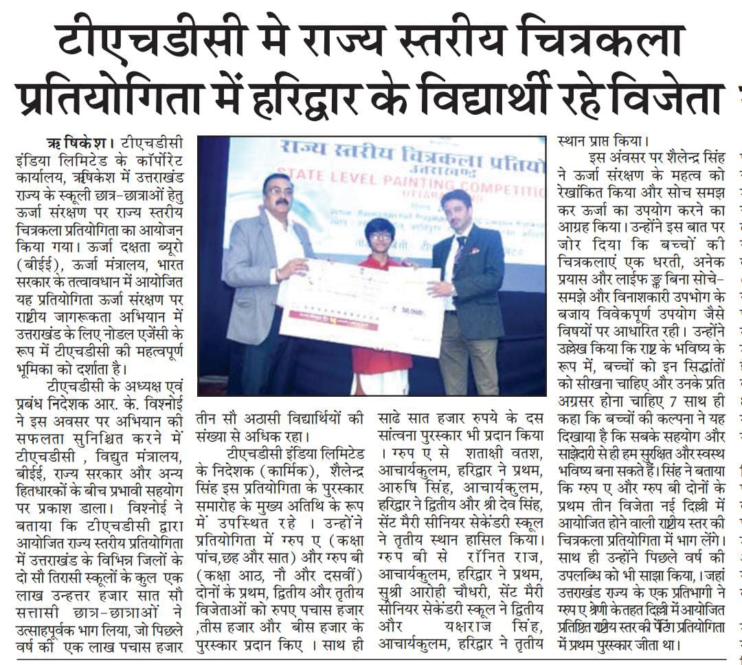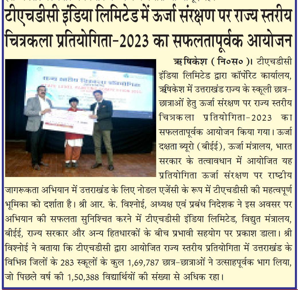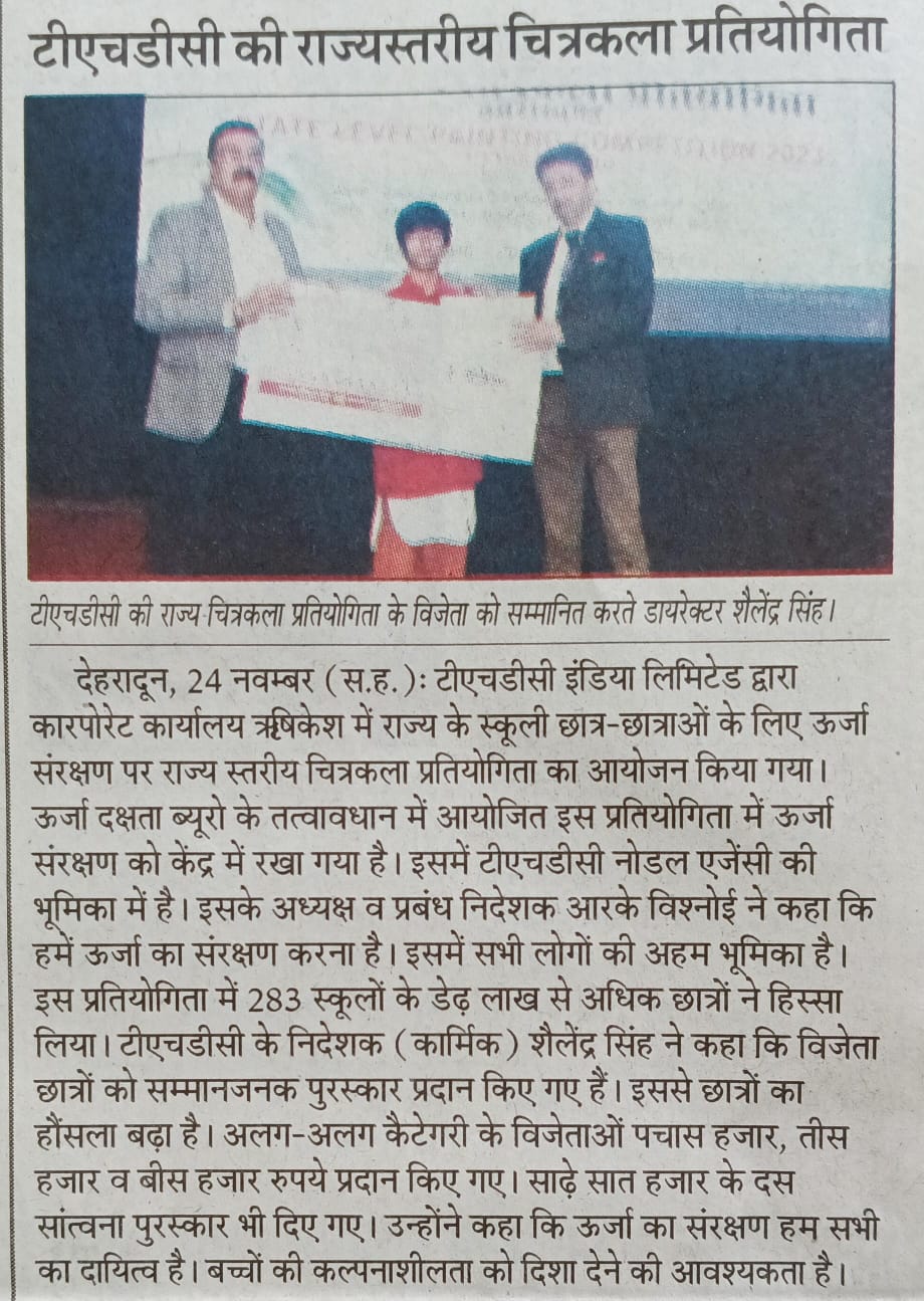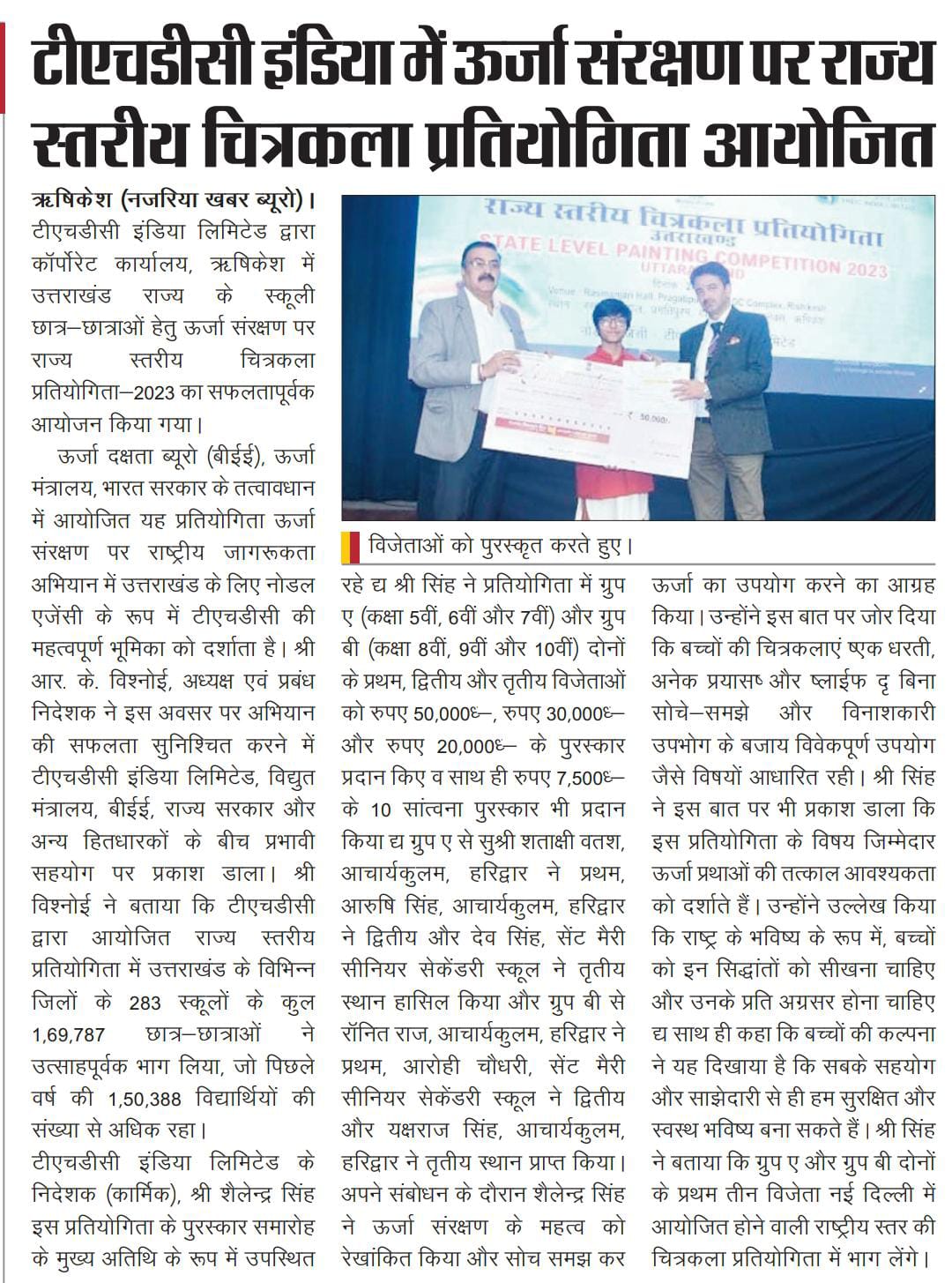 Rishikesh-24.11.2023:THDC India Limited organized a State Level Painting Competition-2023 on Energy Conservation for the school students of Uttarakhand state at the Corporate Office in Rishikesh. This event, conducted under the aegis of the Bureau of Energy Efficiency (BEE), Ministry of Power, Government of India, reflects THDC's pivotal role as the Nodal Agency for Uttarakhand in the National Awareness Campaign on Energy Conservation. Sh. R. K. Vishnoi, Chairman and Managing Director, highlighted the effective collaboration between THDC, the Ministry of Power, BEE, State Government, and other stakeholders in ensuring the campaign's success. Sh. Vishnoi informed that a total number of 1,69,787students from 283 schools from various districts of Uttarakhand enthusiastically participated in the State Level Competition organized by THDC exceeding the previous year’s count of 1,50,388 students. Sh. Shallinder Singh, Director (Personnel) THDC India Limited, presided over the award ceremony as Chief Guest, presenting First, Second, and Third Prizes of Rs. 50,000/-, Rs. 30,000/-, Rs. 20,000/-,and 10 consolation awards of Rs. 7,500/- to winners in both Group A (Class 5th, 6th, and 7th) and Group B (Class 8th, 9th, and 10th). From Group-A, Miss. Shatakshi Vatsh student of Acharayakulam Haridwar secured first position, Miss Arushi Singh, Acharayakulam Haridwar secured second and Sh. Dev Singh, a student of St. Mary’s Sr Sec School secured the third position. From Group-B, Sh. Ronit Raj, Acharayakulam Haridwar, Miss. Aarohi Chaudhary, St. Mary’s Sr Sec School and Sh. Yakshraj Singh from Acharayakulam Haridwar secured second and third positions. During his address, Sh. Shallinder Singh underscored the importance of energy conservation and urged mindful and deliberate energy utilization. He emphasized that the children's paintings revolved around themes like "One Earth, Many Efforts" and "LiFE - Mindful and Deliberate Utilization, Instead of Mindless and Destructive Consumption." Sh. Singh stressed that the themes of this competition reflected the urgent need for responsible energy practices. He mentioned that as the future of the nation, children should learn and champion these principles. Sh. Singh informed that the first three winners of Group A and Group B will participate in the National Level Painting Competition to be organized in New Delhi. Sh. Singh also shared the previous year’s achievement, where a participant from Uttarakhand state won First Prize in the prestigious National Level Painting Competition organized in Delhi under Group A Category.