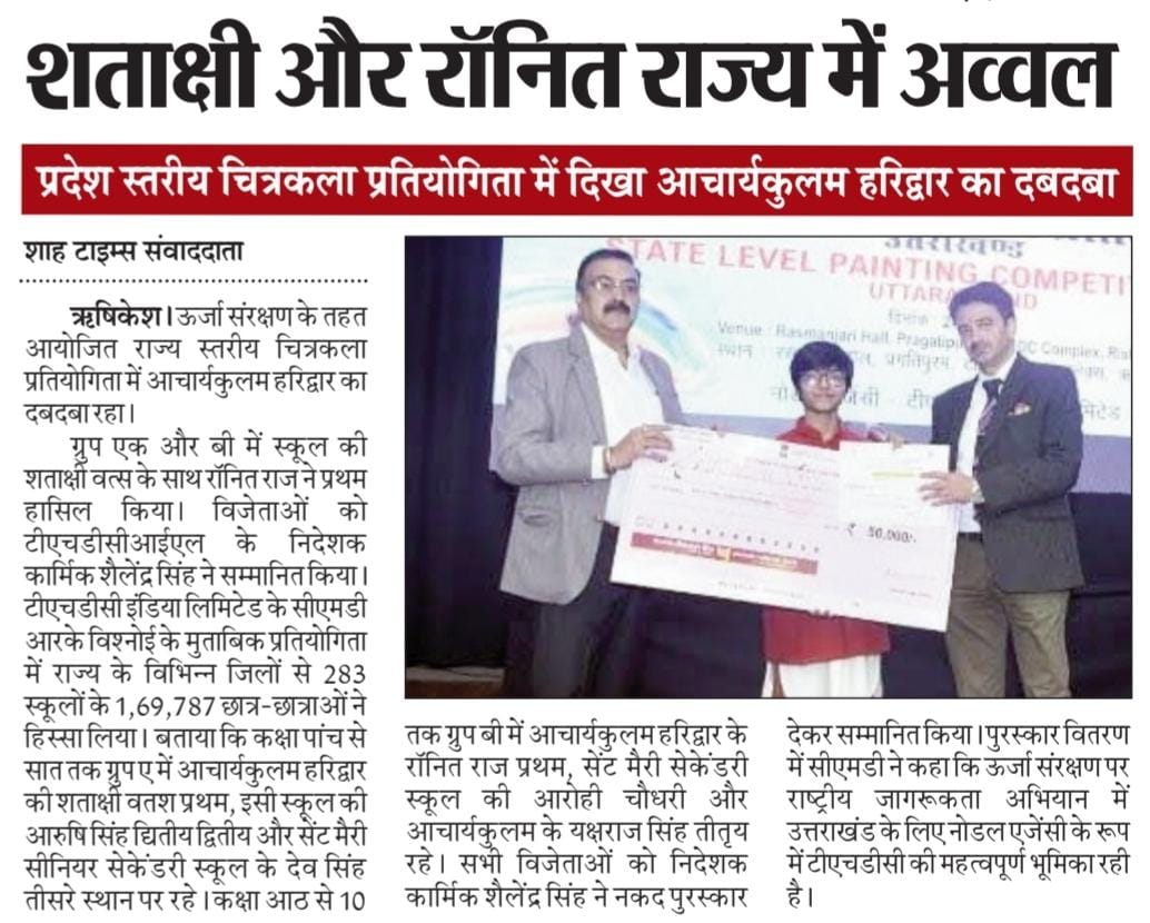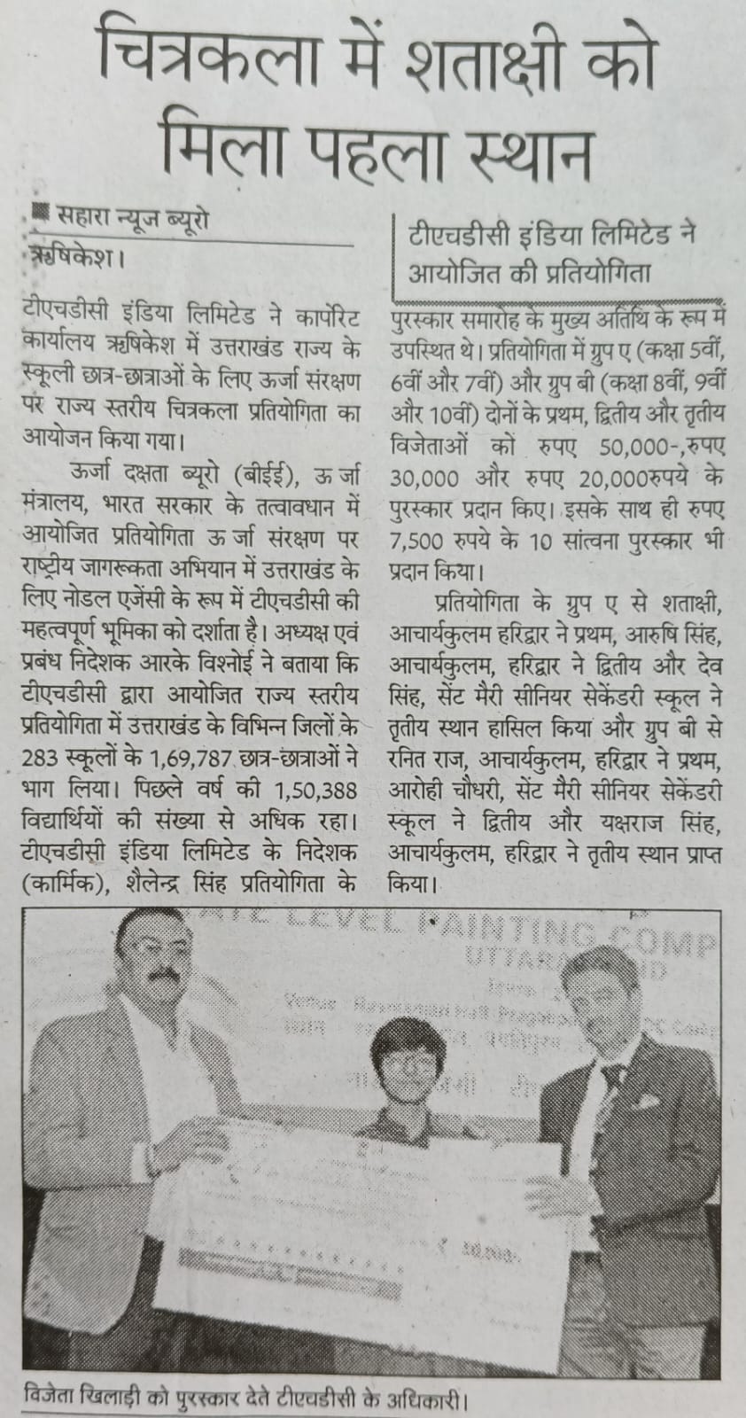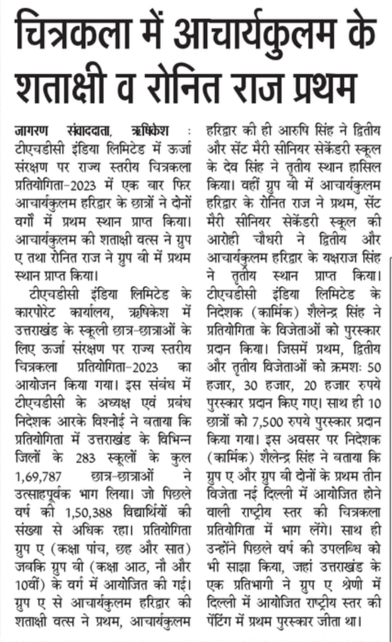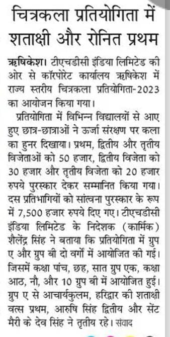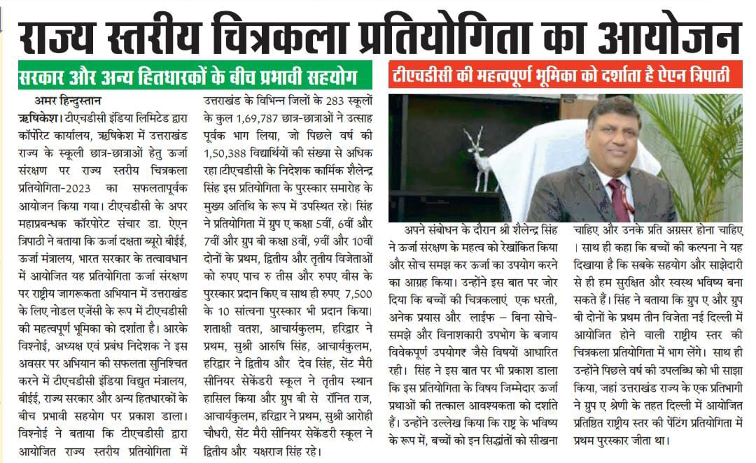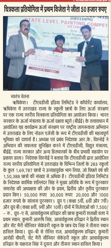 Rishikesh-24.11.2023:THDC India Limited organized a State Level Painting Competition-2023 on Energy Conservation for the school students of Uttarakhand state at the Corporate Office in Rishikesh. This event, conducted under the aegis of the Bureau of Energy Efficiency (BEE), Ministry of Power, Government of India, reflects THDC's pivotal role as the Nodal Agency for Uttarakhand in the National Awareness Campaign on Energy Conservation. Sh. R. K. Vishnoi, Chairman and Managing Director, highlighted the effective collaboration between THDC, the Ministry of Power, BEE, State Government, and other stakeholders in ensuring the campaign's success. Sh. Vishnoi informed that a total number of 1,69,787students from 283 schools from various districts of Uttarakhand enthusiastically participated in the State Level Competition organized by THDC exceeding the previous year’s count of 1,50,388 students. Sh. Shallinder Singh, Director (Personnel) THDC India Limited, presided over the award ceremony as Chief Guest, presenting First, Second, and Third Prizes of Rs. 50,000/-, Rs. 30,000/-, Rs. 20,000/-,and 10 consolation awards of Rs. 7,500/- to winners in both Group A (Class 5th, 6th, and 7th) and Group B (Class 8th, 9th, and 10th). From Group-A, Miss. Shatakshi Vatsh student of Acharayakulam Haridwar secured first position, Miss Arushi Singh, Acharayakulam Haridwar secured second and Sh. Dev Singh, a student of St. Mary’s Sr Sec School secured the third position. From Group-B, Sh. Ronit Raj, Acharayakulam Haridwar, Miss. Aarohi Chaudhary, St. Mary’s Sr Sec School and Sh. Yakshraj Singh from Acharayakulam Haridwar secured second and third positions. During his address, Sh. Shallinder Singh underscored the importance of energy conservation and urged mindful and deliberate energy utilization. He emphasized that the children's paintings revolved around themes like "One Earth, Many Efforts" and "LiFE - Mindful and Deliberate Utilization, Instead of Mindless and Destructive Consumption." Sh. Singh stressed that the themes of this competition reflected the urgent need for responsible energy practices. He mentioned that as the future of the nation, children should learn and champion these principles. Sh. Singh informed that the first three winners of Group A and Group B will participate in the National Level Painting Competition to be organized in New Delhi. Sh. Singh also shared the previous year’s achievement, where a participant from Uttarakhand state won First Prize in the prestigious National Level Painting Competition organized in Delhi under Group A Category.