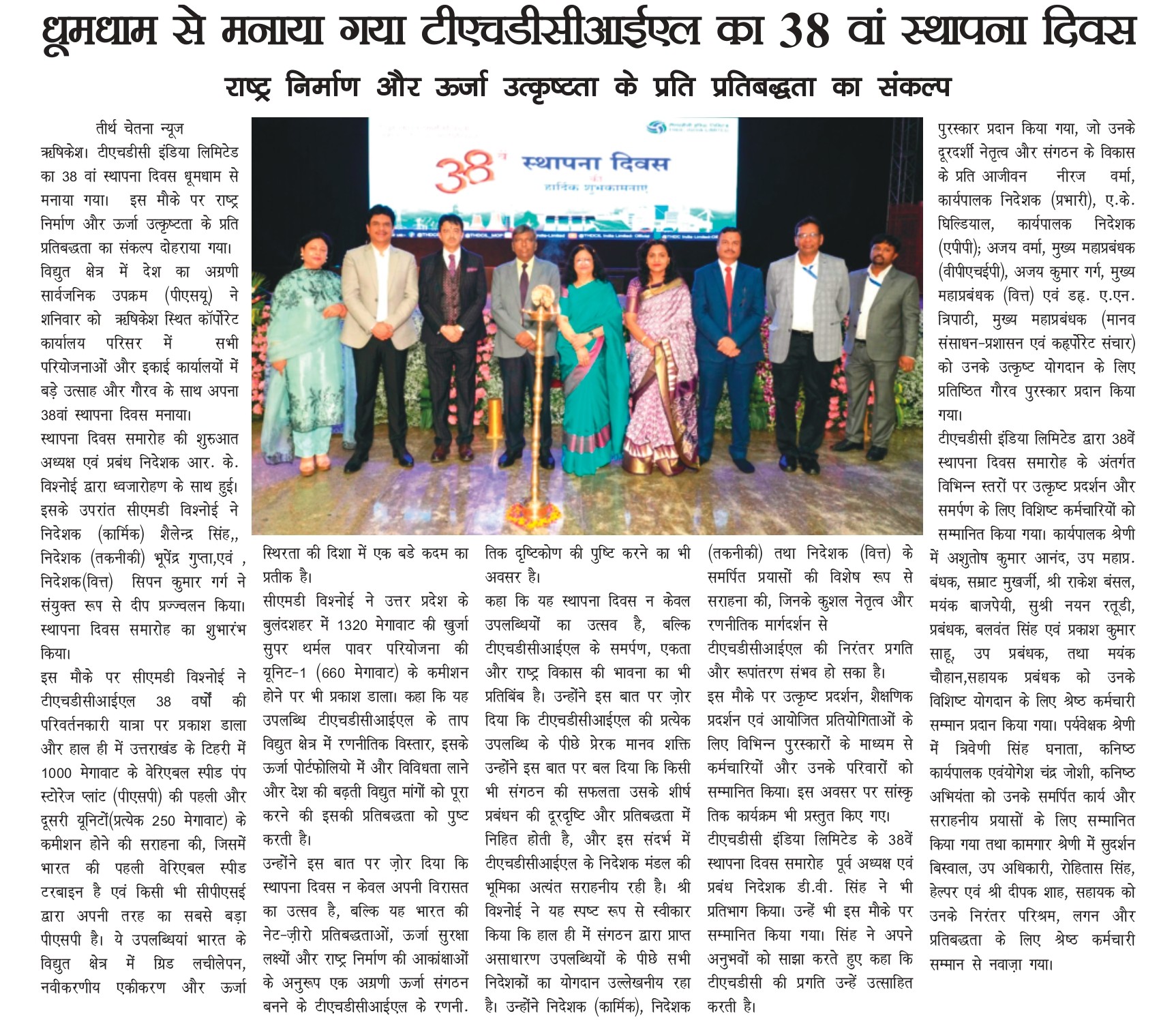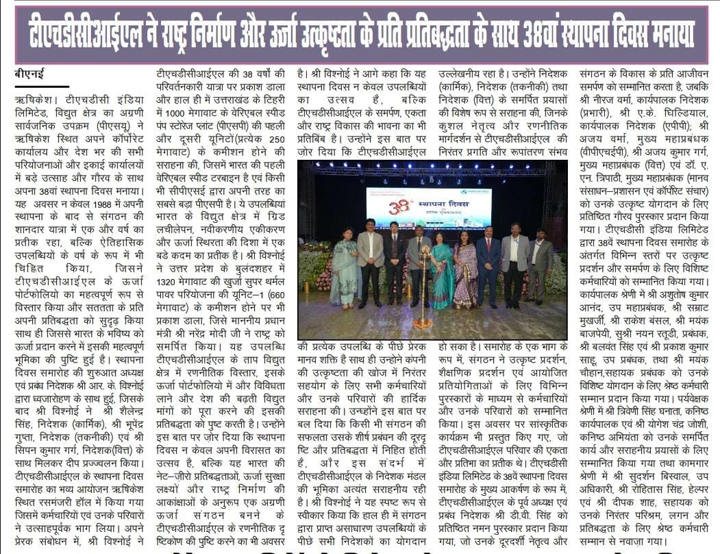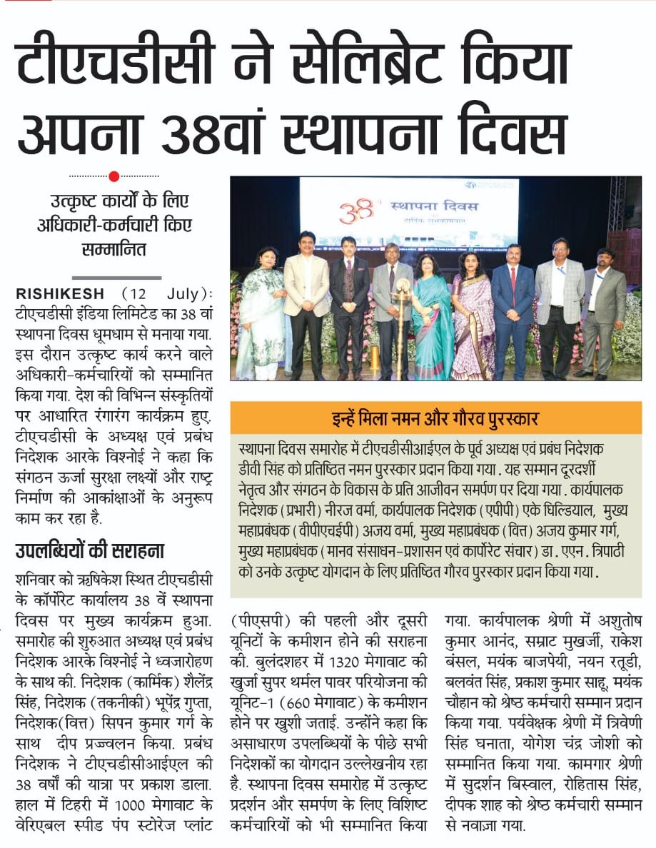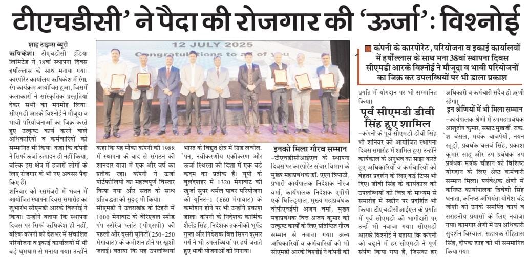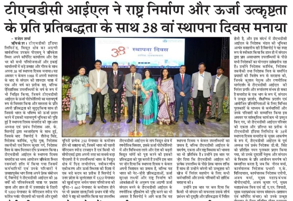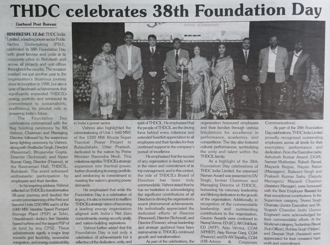 Rishikesh, 12-07-2025: THDC India Limited, a leading power sector Public Sector Undertaking (PSU), celebrated its 38th Foundation Day with great fervour and pride at its Corporate Office in Rishikesh and across all Projects and Unit offices throughout the country. The occasion marked not just another year in the organization's illustrious journey since its inception in 1988, but also a year of landmark achievements that significantly expanded THDCIL’s energy portfolio and reinforced its commitment to sustainability, reaffirming its pivotal role in powering India’s future.