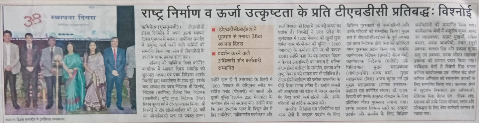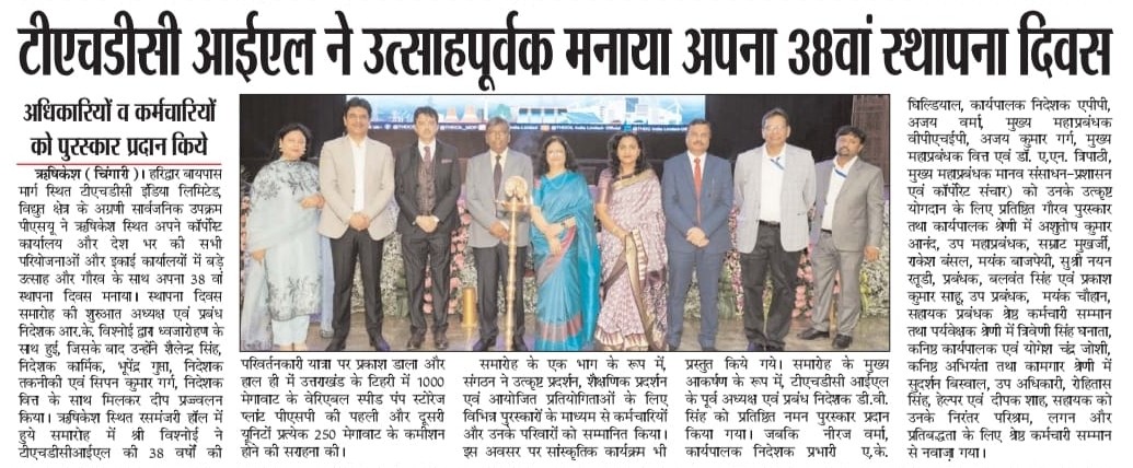 As part of the 38th Foundation Day celebrations, THDC India Limited proudly recognized outstanding employees across all levels for their exemplary performance and dedication. From the Executive cadre, Sh. Ashutosh Kumar Anand (DGM), Sh. Samrat Mukherjee, Sh. Rakesh Bansal, Sh. Mayank Bajpai, Ms. Nayan Raturi (Managers), Sh. Balwant Singh and Sh. Prakash Kumar Sahu (Deputy Managers) Sh. Mayank Chauhan (Assistant Manager), were honoured with the Best Employee Reward for their exceptional contributions. In the Supervisor category, Sh. Triveni Singh Ghanata (Junior Executive) and Sh. Yogesh Chandra Joshi (Junior Engineer) were acknowledged for their commendable efforts. At the Workmen category, Sh. Sudarshan Biswal (Sub Officer), Sh. Rohitas Singh (Helper), and Sh. Deepak Shah (Assistant) were appreciated for their consistent hard work and commitment.