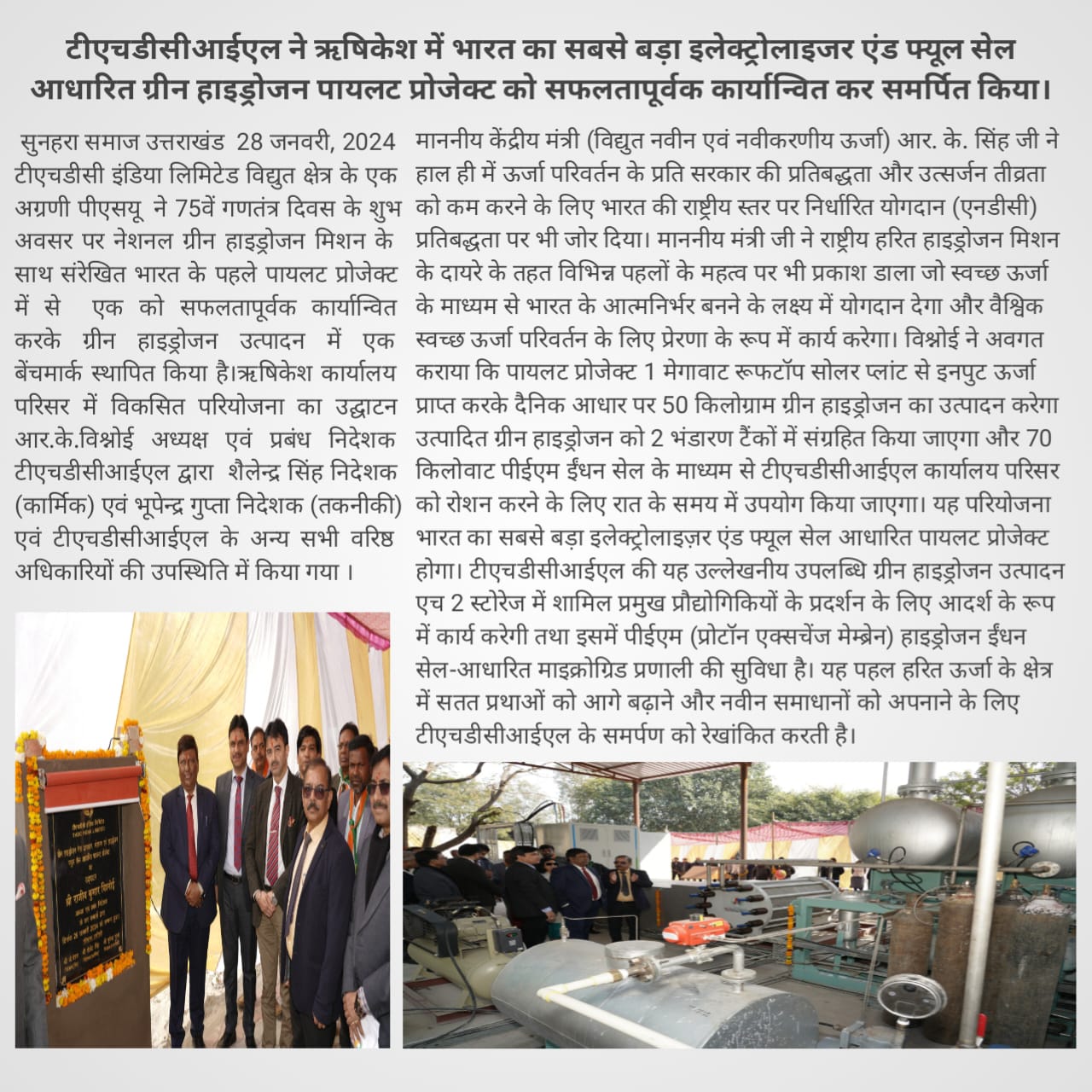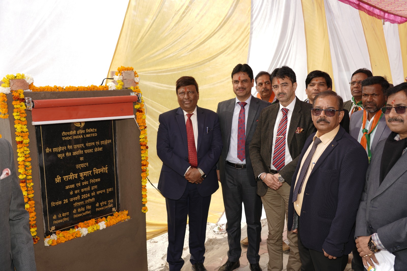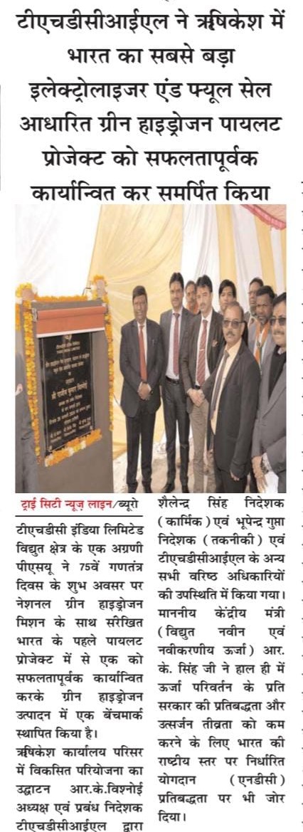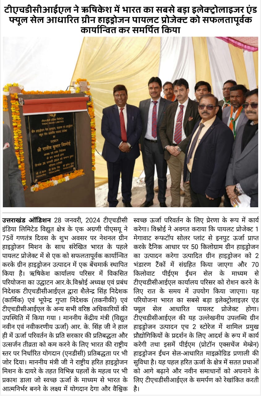 Rishikesh, 26 जनवरी, 2024: THDC India Limited, a leading Power Sector PSU, has also established a benchmark in the Green Hydrogen production, by successfully implementing India's one of the First Pilot Project aligned with the "National Green Hydrogen Mission" on the auspicious occasion of 75th Republic Day. The project developed at the office complex in Rishikesh was inaugurated by Sh. R. K. Vishnoi, Chairman and Managing Director, THDCIL in the presence of Sh. Shallinder Singh, Director (Personnel) and Sh. Bhupender Gupta, Director (Technical), along with all other senior officers of THDCIL. Hon’ble Cabinet Minister for Power, New and Renewable Energy, Sh. R. K. Singh also recently emphasized the government's commitment to energy transition and India's Nationally Determined Contributions (NDC) commitment to reduce emissions intensity. Hon’ble Minister also highlighted upon the Importance of Various Initiatives under the Ambit of National Green Hydrogen Mission which will contribute to India’s aim to become Aatmanirbhar through clean energy and serve as an inspiration for the global Clean Energy Transition. Sh. Vishnoi informed that the Pilot Project will produce 50KG of Green Hydrogen on daily basis sourcing input energy from 1MW Rooftop Solar Plant, the produced Green Hydrogen will be stored in 2nos of Storage Tanks and shall be utilized in night hours for illumination of THDCIL office Complex though a 70 Kw PEM Fuel Cell. The Project will be India's Largest Electrolyser End Fuel Cell based Pilot Project. This notable achievement by THDCIL serves as a demonstration of key technologies involved in Green Hydrogen Production, H2 storage, and features a PEM (Proton Exchange Membrane) Hydrogen fuel cell-based microgrid system. This initiative underscores THDCIL's dedication to advancing sustainable practices and embracing innovative solutions in the realm of Green Energy.