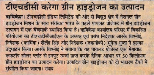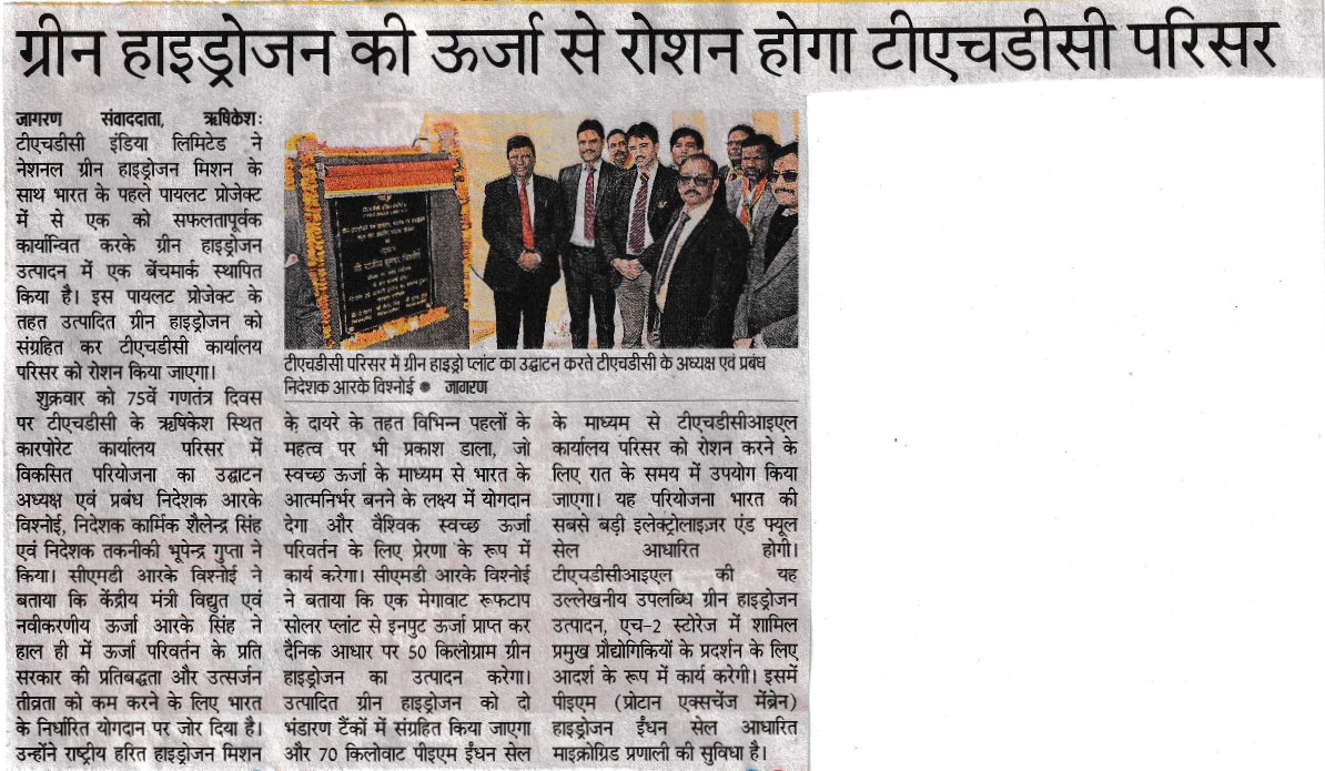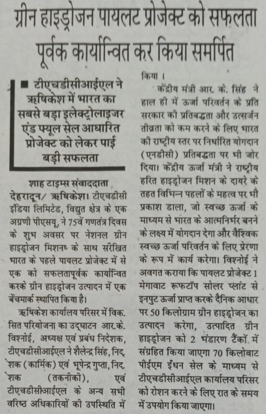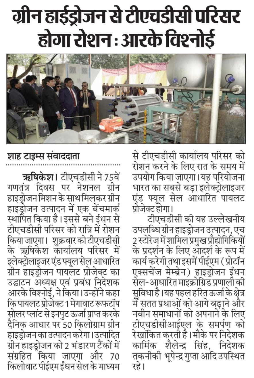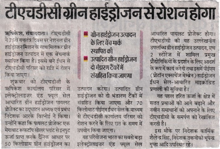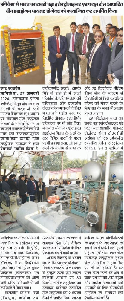 Rishikesh, 26 जनवरी, 2024: THDC India Limited, a leading Power Sector PSU, has also established a benchmark in the Green Hydrogen production, by successfully implementing India's one of the First Pilot Project aligned with the "National Green Hydrogen Mission" on the auspicious occasion of 75th Republic Day. The project developed at the office complex in Rishikesh was inaugurated by Sh. R. K. Vishnoi, Chairman and Managing Director, THDCIL in the presence of Sh. Shallinder Singh, Director (Personnel) and Sh. Bhupender Gupta, Director (Technical), along with all other senior officers of THDCIL. Hon’ble Cabinet Minister for Power, New and Renewable Energy, Sh. R. K. Singh also recently emphasized the government's commitment to energy transition and India's Nationally Determined Contributions (NDC) commitment to reduce emissions intensity. Hon’ble Minister also highlighted upon the Importance of Various Initiatives under the Ambit of National Green Hydrogen Mission which will contribute to India’s aim to become Aatmanirbhar through clean energy and serve as an inspiration for the global Clean Energy Transition. Sh. Vishnoi informed that the Pilot Project will produce 50KG of Green Hydrogen on daily basis sourcing input energy from 1MW Rooftop Solar Plant, the produced Green Hydrogen will be stored in 2nos of Storage Tanks and shall be utilized in night hours for illumination of THDCIL office Complex though a 70 Kw PEM Fuel Cell. The Project will be India's Largest Electrolyser End Fuel Cell based Pilot Project. This notable achievement by THDCIL serves as a demonstration of key technologies involved in Green Hydrogen Production, H2 storage, and features a PEM (Proton Exchange Membrane) Hydrogen fuel cell-based microgrid system. This initiative underscores THDCIL's dedication to advancing sustainable practices and embracing innovative solutions in the realm of Green Energy.