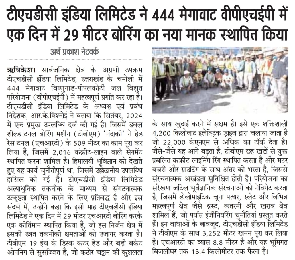 Rishikesh, 01.10.2024: THDC India Limited, a leading PSU, is making significant progress on the 444 MW Vishnugad-Pipalkoti Hydro Electric Project (VPHEP) in Chamoli, Uttarakhand. Sh. R. K. Vishnoi, CMD, THDCIL, informed that a major milestone was reached in September 2024 when the Double Shield Tunnel Boring Machine (TBM) "NANDAKI" completed 509 meters of the Head Race Tunnel (HRT), which involves installing 2,016 concrete-lined segments—a notable feat given the challenging Himalayan geology.