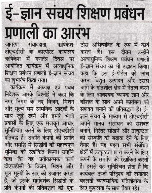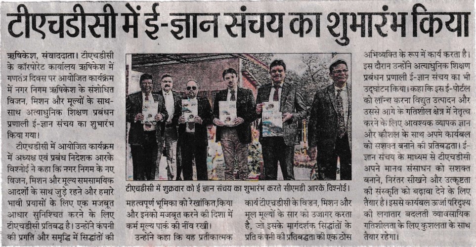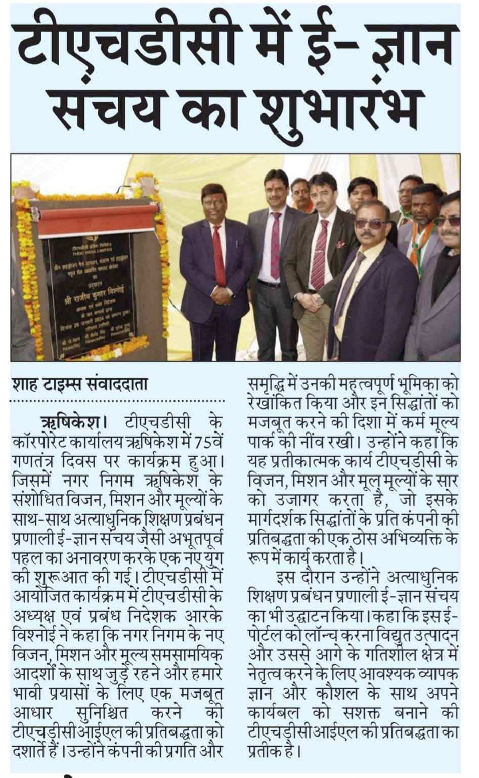 Rishikesh, 26 January, 2024: On the momentous occasion of the 75th Republic Day, THDCIL Management ushered in a new era by unveiling groundbreaking initiatives including the Launching of Revised Vision, Mission and Values of the Corporation and the Launching of E-learning Management System at Corporate Office, Rishikesh. Sh. R. K. Vishnoi, Chairman and Managing Director, THDC India Limited during the unveiling ceremony said that THDCIL’s new Vision, Mission, and Values reflects THDCIL's commitment to stay aligned with contemporary ideals and ensuring a robust foundation for its future endeavors. Sh. Vishnoi further underlines their crucial role in the company’s progress and prosperity. In a significant move towards manifesting these principles, Sh. Vishnoi also laid the foundation for the Karm Mulya Park at the Corporate Office in Rishikesh. This symbolic gesture highlights the essence of THDCIL's Vision, Mission, and Core Values, serving as a tangible manifestation of the company's commitment to its guiding principles. During the occasion, Sh. J. Behera, Director(Finance), Sh. Shallinder Singh, Director(Personnel), Sh. Bhupender Gupta, Director(Technical) were present along with other senior officers and employees of the corporation. State-Of-The-Art Learning Management System, E-Gyan Sanchay was also inaugurated on this prestigious occasion. Sh. Vishnoi during the launch of this E-portal said that E-Gyan Sanchay symbolizes THDCIL's commitment to empower its workforce with comprehensive knowledge and skills essential for leading in the dynamic realm of Power Generation and beyond. Through E-Gyan Sanchay, THDCIL is poised to empower its Human Resource with the latest insights and strengths, fostering a culture of continuous learning and excellence. This initiative underscores the company's dedication to attain excellence in all concerned sectoral areas ensuring that its workforce remains adept and well-prepared for the ever-changing business dynamics of the energy landscape. Highlighting THDC’s core competency in harnessing Energy across diverse verticals such as Hydro, Wind, Thermal, Solar, and PSP, THDCIL is consistently establishing new benchmarks through its unique State-of-the-Art technologies. THDCIL is one of the premier power generators in the country with installed capacity of 1587 MW with commissioning of Tehri Dam HPP (1000MW), Koteshwar HEP (400MW) in Uttarakhand, Wind Power Projects of 50MW at Patan 63MW at Dwarka in Gujarat, 24MW Dhukwan Small Hydro Project, Jhansi, Uttar Pradesh and 50 MW Solar Power Project at Kasaragod, Kerala to its credit.