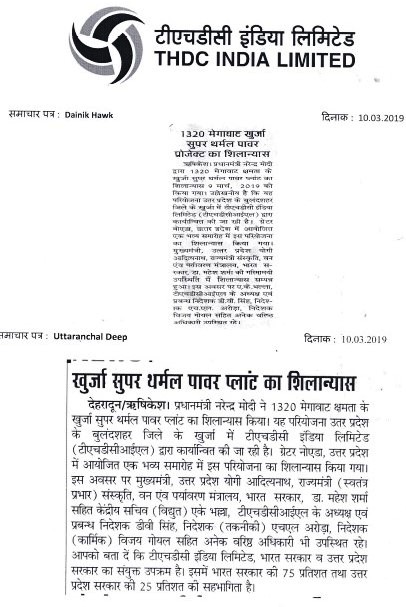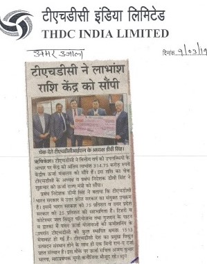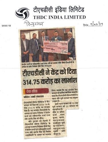 Sh. D.V. Singh, CMD, THDCIL presented the cheque of the Dividend for Financial Year 2018-19 to Hon’ble Minister of State (IC), Power and NRE, Govt. of India Sh. R.K. Singh at Ministry of Power on 07.03.2019 in the presence of Sh. A.K. Bhalla, Secretary Power, GoI. THDC India Limited has paid dividend of Rs. 314.75 Cr. to Ministry of Power, Government of India for Financial Year 2018-19.