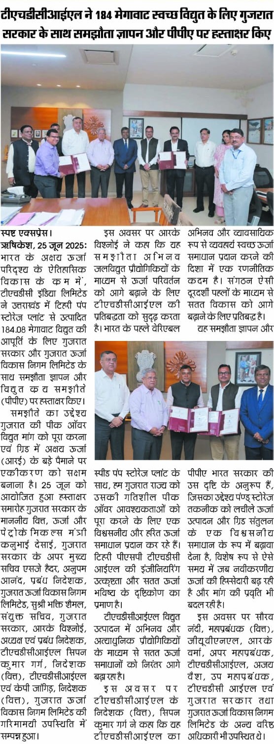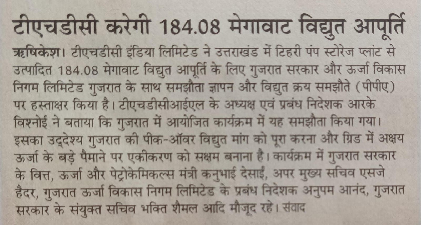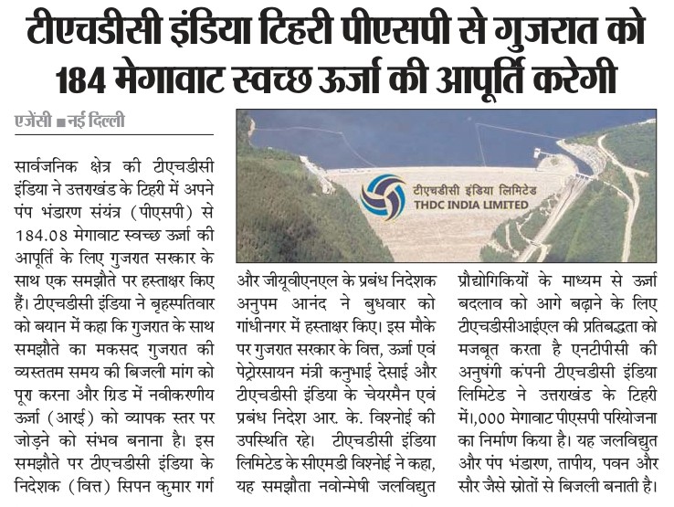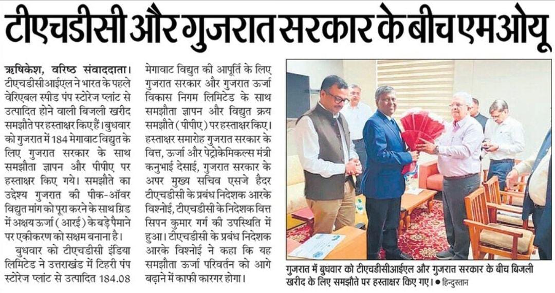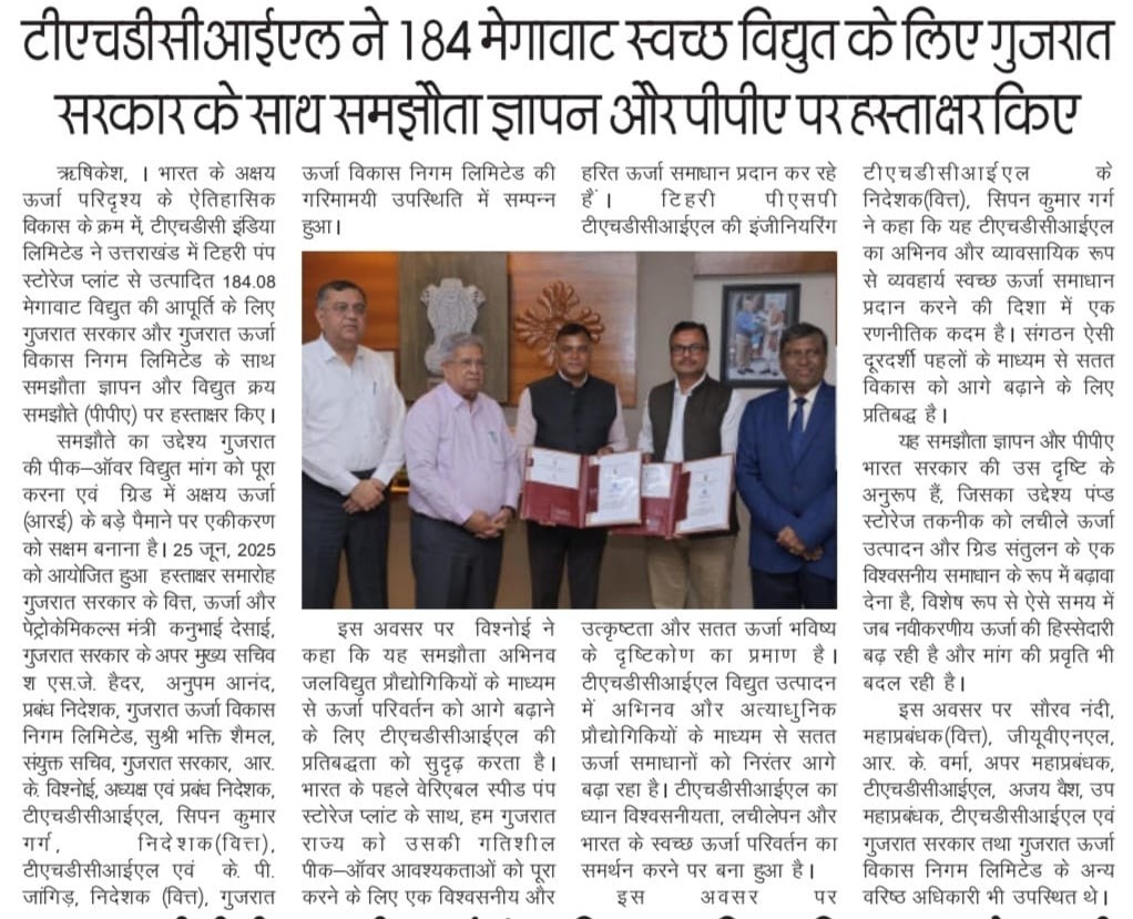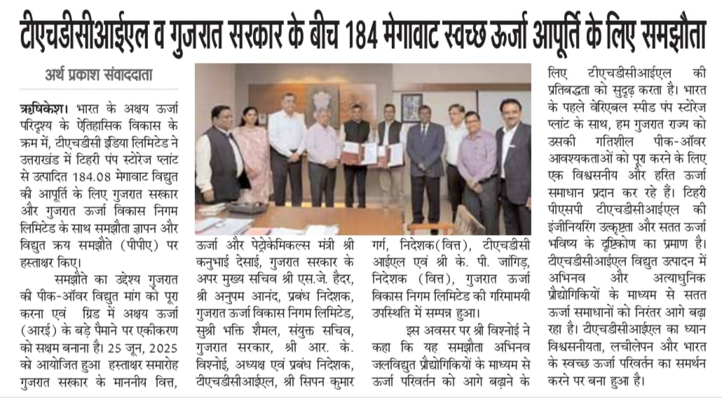 Rishikesh, 25-06-2025: In a landmark development for India’s renewable energy landscape, THDC India Limited signed a Memorandum of Understanding and Power Purchase Agreement (PPA) with the Government of Gujarat and Gujarat Urja Vikas Nigam Limited for the supply of 184.08 MW of power from Tehri Pumped Storage Plant in Uttarakhand.