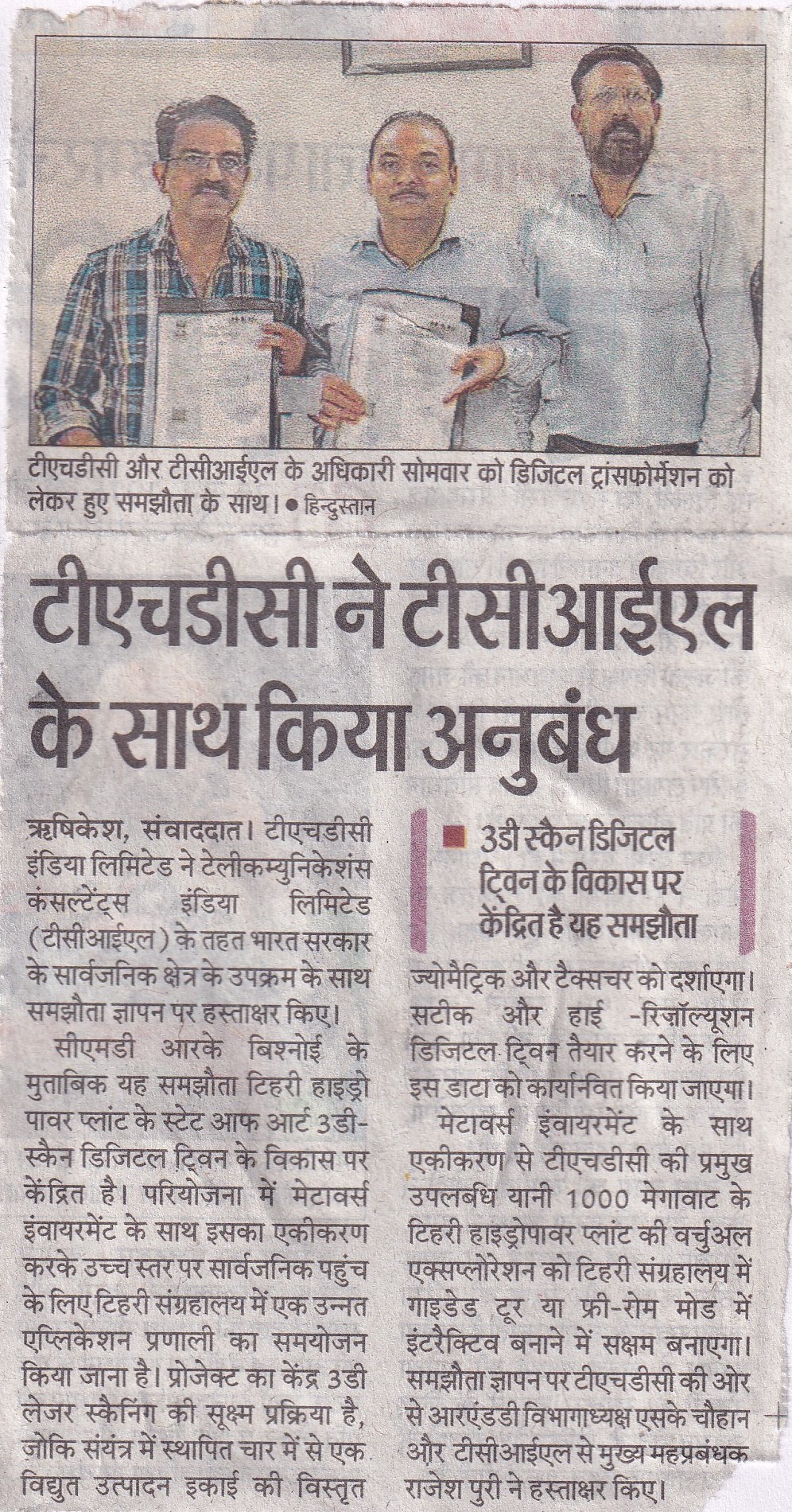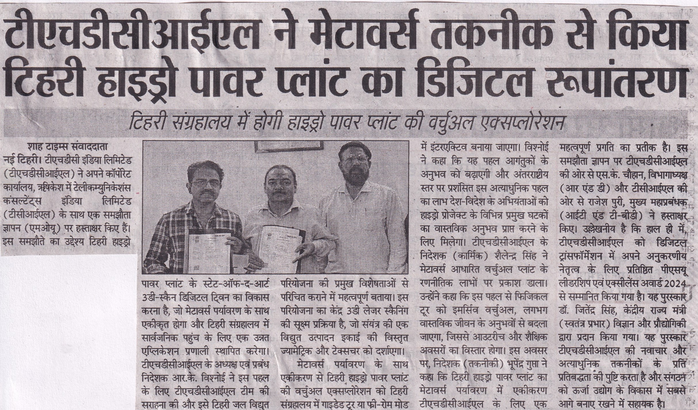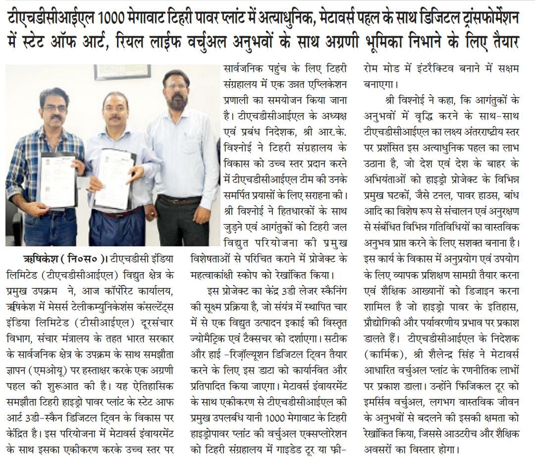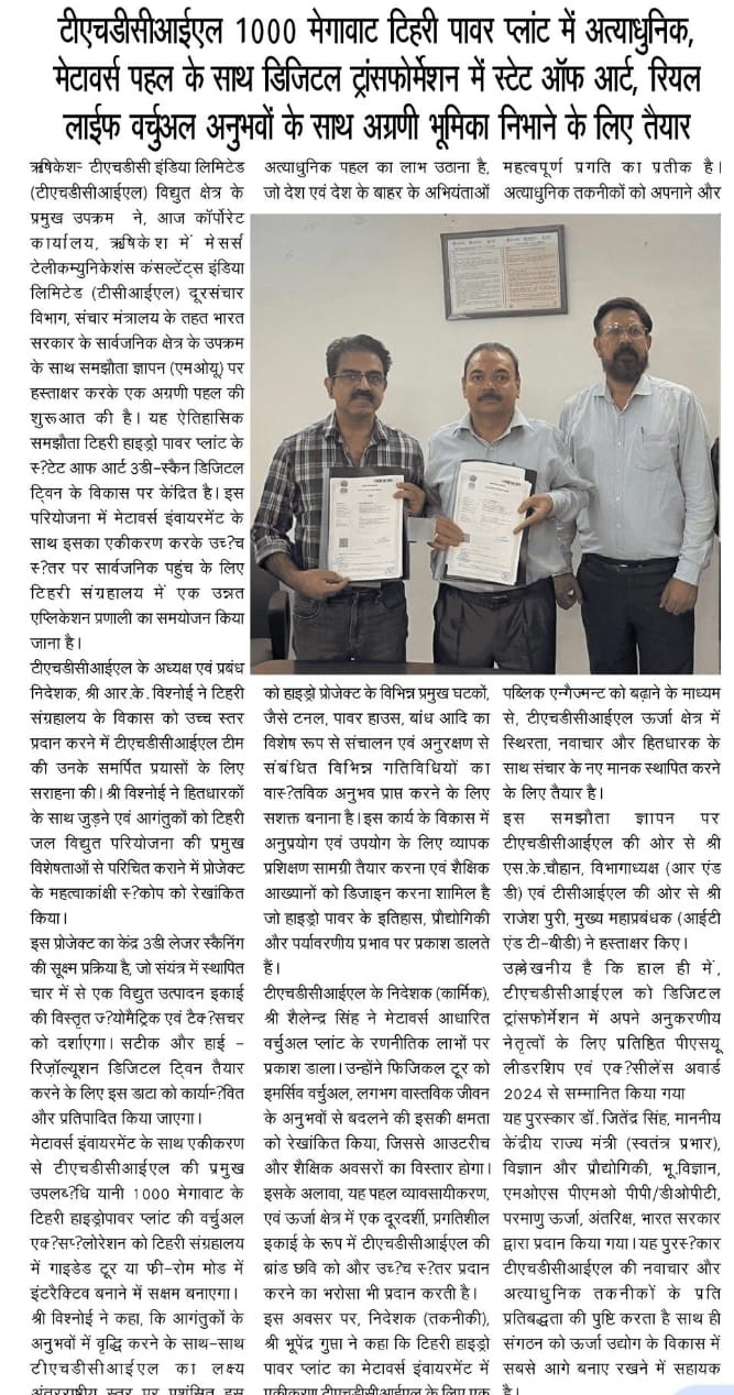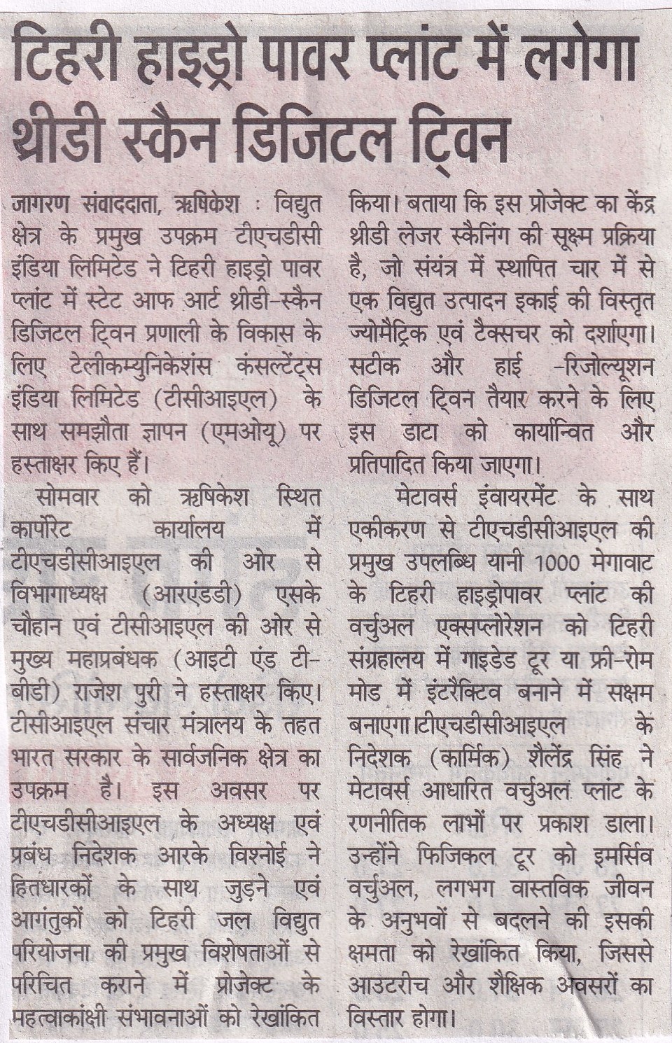 Rishikesh, 24-06-2024: THDC India Limited (THDCIL), a prominent leader in the Power Sector, has embarked on a pioneering initiative by signing a Memorandum of Understanding (MOU) with M/s Telecommunications Consultants India Limited (TCIL), a Public Sector Undertaking of Government of India under Department of Telecommunication, Ministry of Communications today at Corporate Office, Rishikesh. This landmark agreement focuses on the development of a state-of-the-art 3D-scanned digital twin of the Tehri Hydro Power Plant. The project also includes its integration into a metaverse environment and the deployment of an advanced application system within the Tehri Museum for public access.
