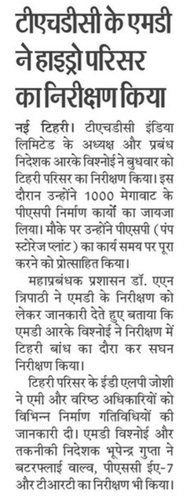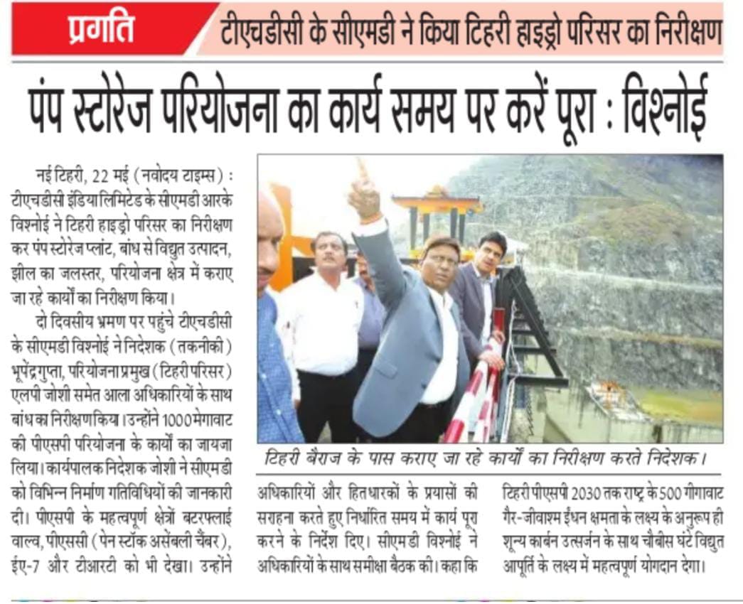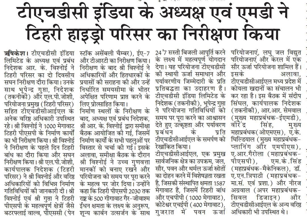 During the first day, Sh. Vishnoi visited Tehri Dam, and conducted an extensive inspection. Sh. L.P. Joshi, Executive Director (Tehri Complex) provided updates on various construction activities. Later, Sh. Vishnoi and Sh. Bhupender Gupta inspected critical areas such as the Butterfly Valve, PSC (Pen Stock Assembly Chamber), EA-7, and TRT of Tehri PSP along with Koteshwar Dam and its outlet area. Following the inspection, Sh. Vishnoi commended the efforts of the officials and stakeholders, and motivated them to maintain momentum to achieve the desired results within the set timeframe.