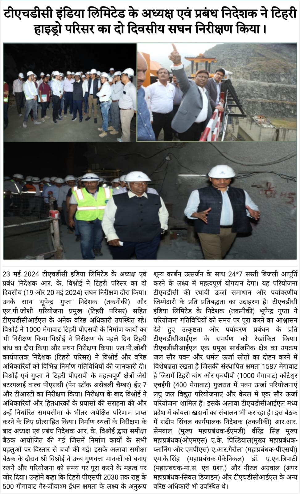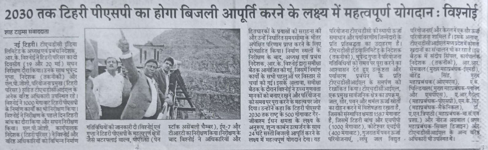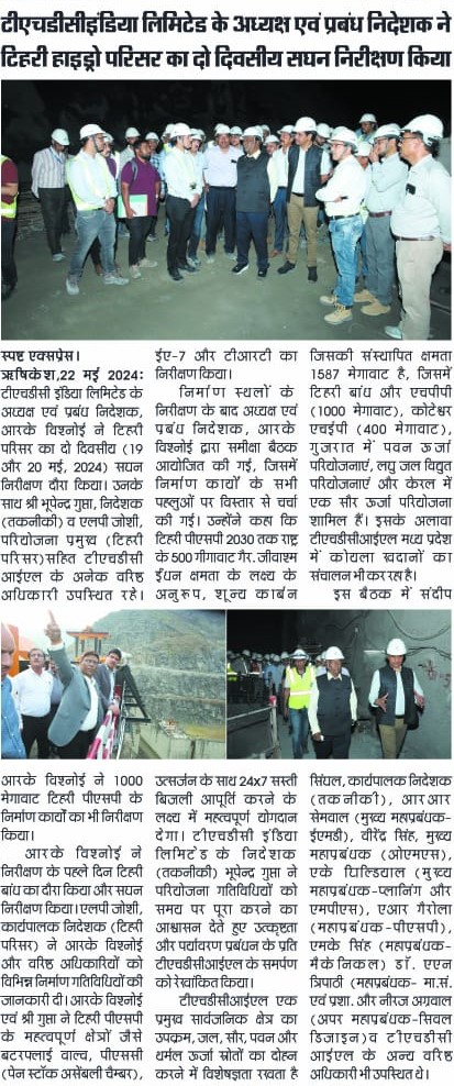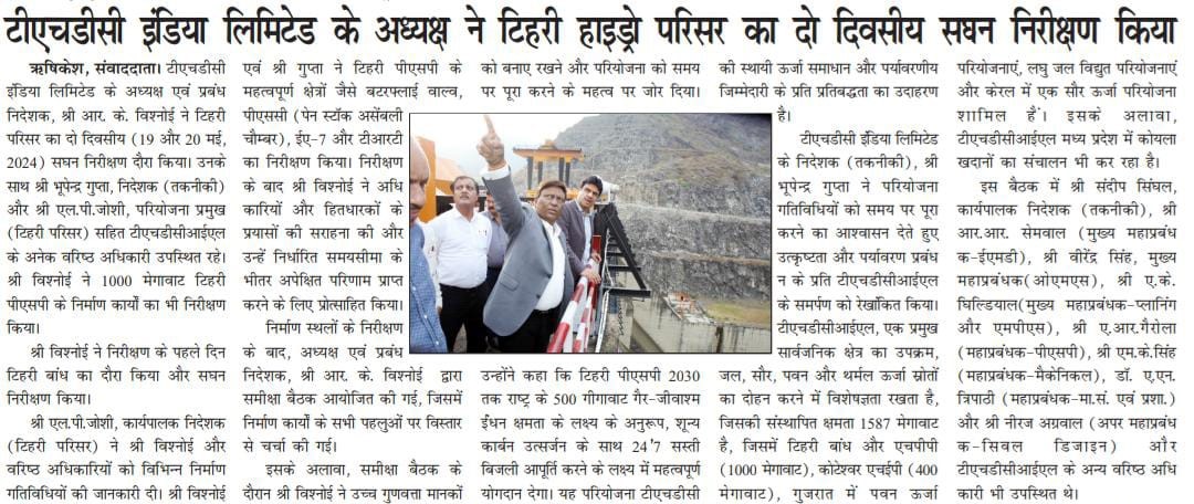 Rishikesh,22-05-2024: Sh. R. K. Vishnoi, Chairman and Managing Director of THDC India Limited, led a comprehensive two-day inspection visit at Tehri Complex on May 19th and May 20th, 2024. Accompanied by Sh. Bhupender Gupta, Director (Technical), and Sh. L. P. Joshi, Head of Project (Tehri Complex), among other senior officers of THDCIL, Sh. Vishnoi meticulously inspected the ongoing construction works of 1000 MW Tehri PSP.