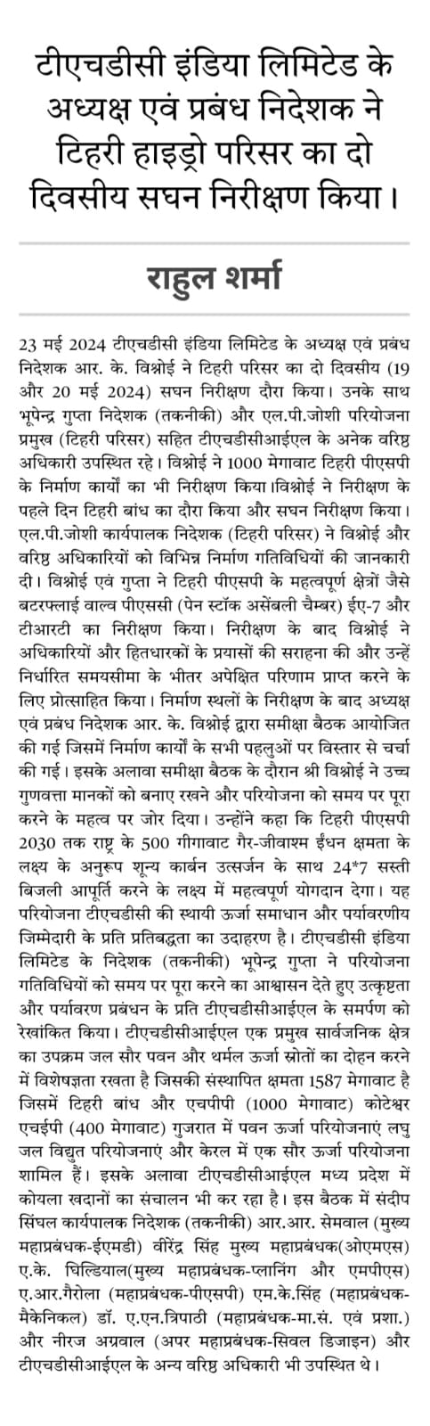 Sh. Bhupender Gupta, Director (Technical), reiterated THDCIL's dedication to excellence and environmental stewardship, assuring the timely completion of project activities.