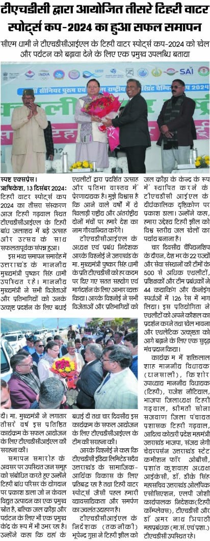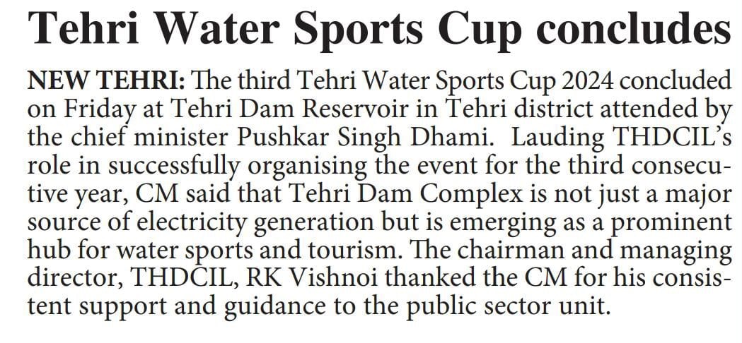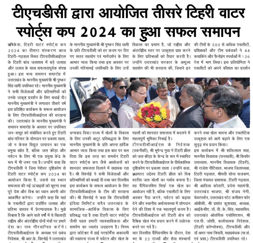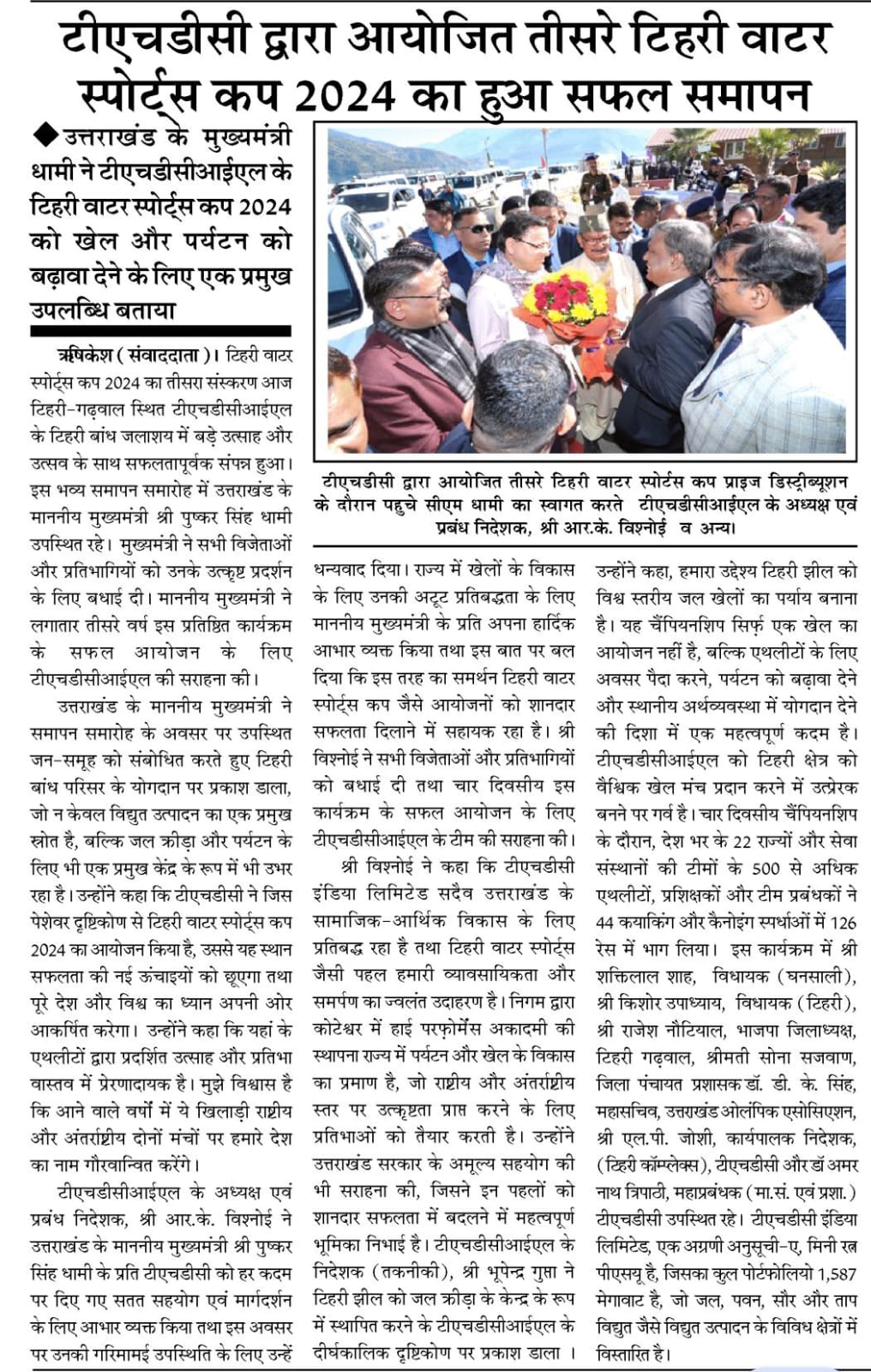 Hon’ble Chief Minister of Uttarakhand, Sh. Pushkar Singh Dhami, addressing the gathering during the closing ceremony highlighted the contribution of Tehri Dam Complex which is not only a major source of Electricity Generation but is also emerging as a prominent hub for Water Sports and Tourism. He appreciated, the professional approach displayed by THDC in organizing, Tehri Water Sports Cup 2024, stating that organizing such Mega Events in this location would enable it to scale new Heights of Success, attracting attention across the Nation and the World."
