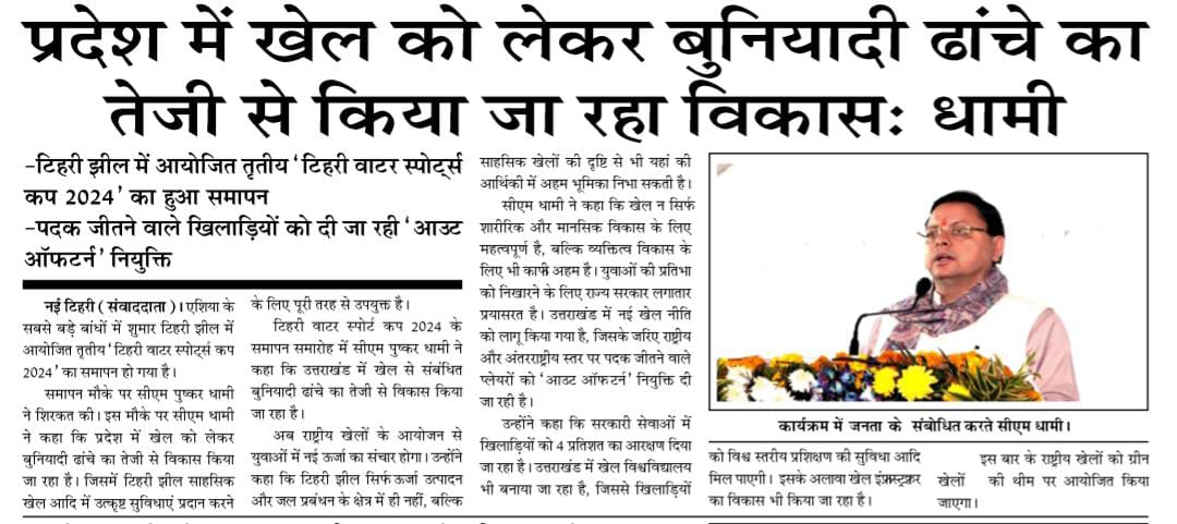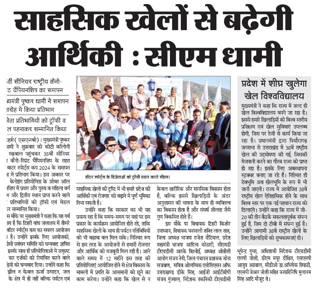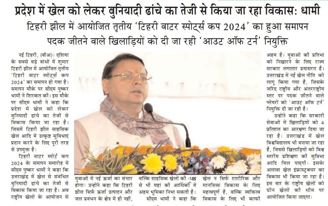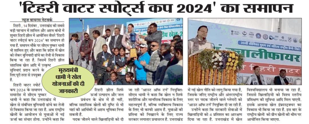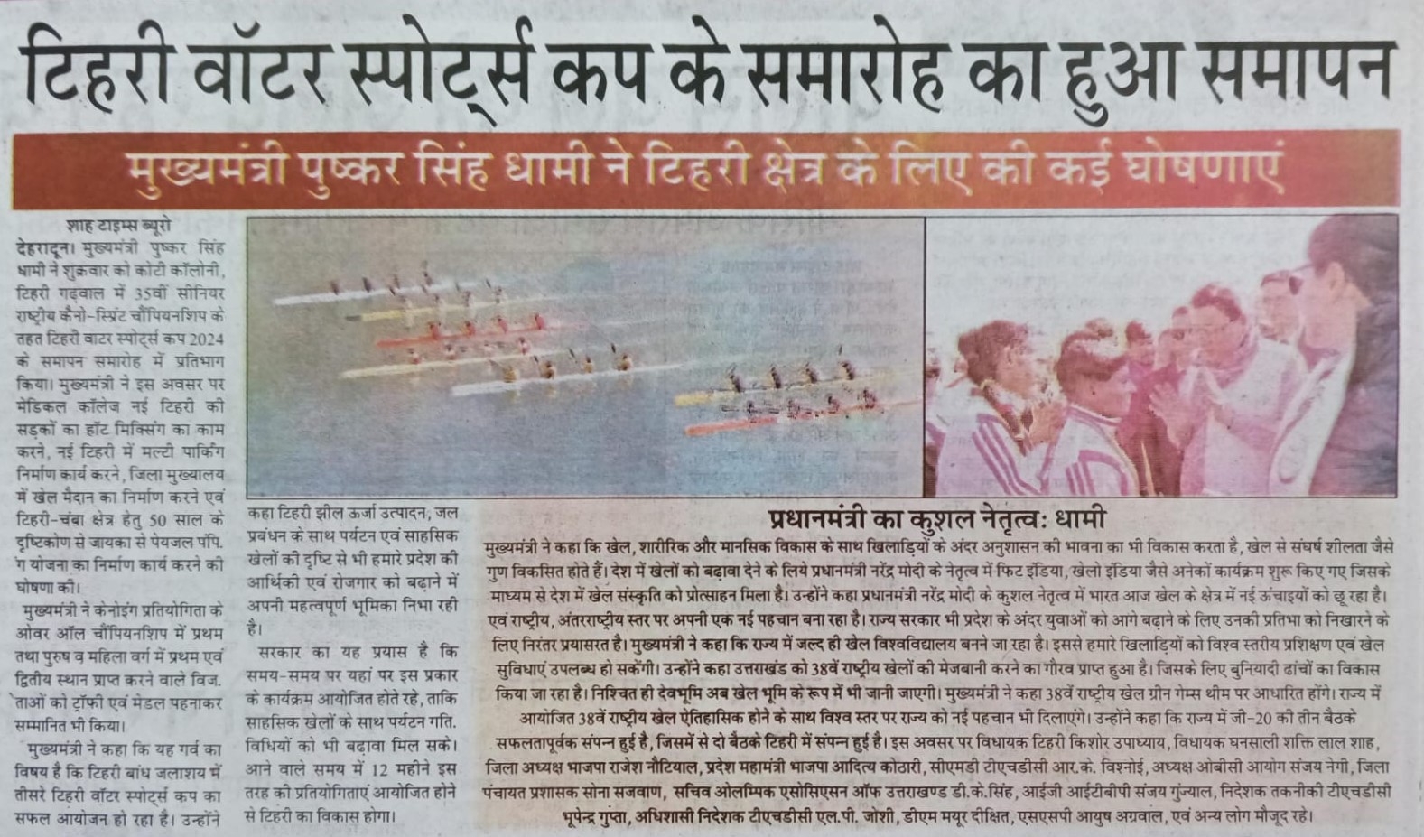 Hon’ble Chief Minister of Uttarakhand, Sh. Pushkar Singh Dhami, addressing the gathering during the closing ceremony highlighted the contribution of Tehri Dam Complex which is not only a major source of Electricity Generation but is also emerging as a prominent hub for Water Sports and Tourism. He appreciated, the professional approach displayed by THDC in organizing, Tehri Water Sports Cup 2024, stating that organizing such Mega Events in this location would enable it to scale new Heights of Success, attracting attention across the Nation and the World."