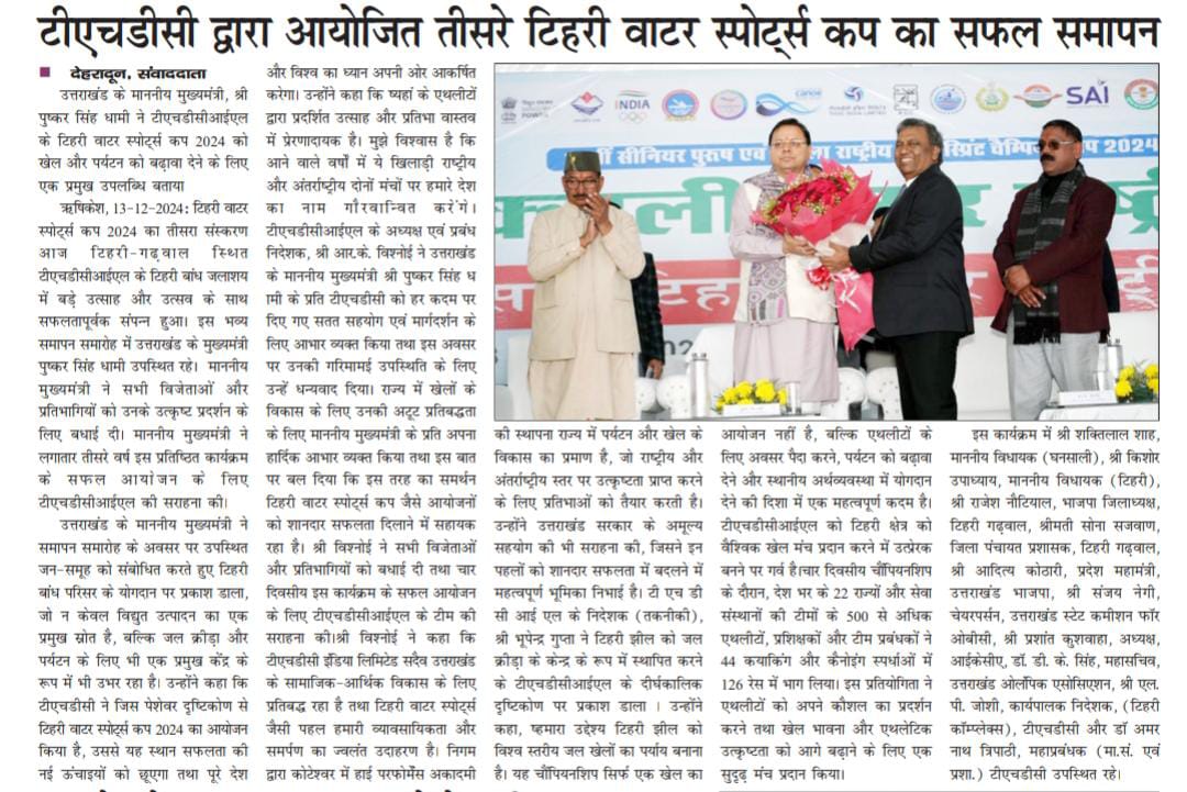 Rishikesh, 13-12-2024: The 3rd Edition of the Tehri Water Sports Cup 2024, successfully concluded today at THDCIL- Tehri Dam Reservoir at Tehri-Garhwal, with great enthusiasm and celebration. The Grand Closing ceremony was graced by the Hon’ble Chief Minister of Uttarakhand, Sh. Pushkar Singh Dhami. Hon’ble CM congratulated all the winners and participants for their outstanding performances. Sh. Dhami appreciated the role of THDC in successfully organizing of this prestigious event for the third consecutive year.