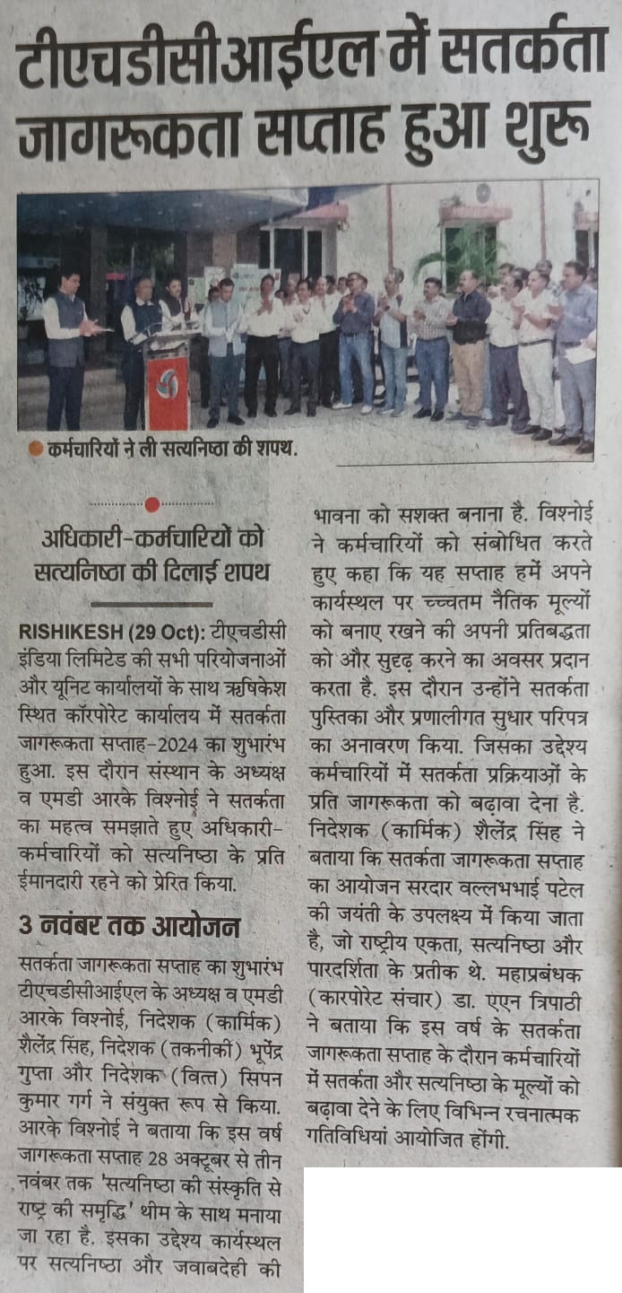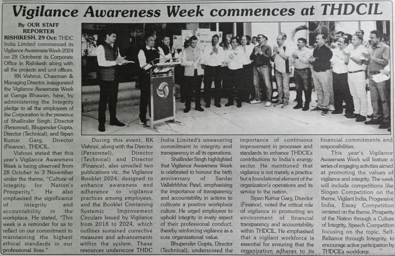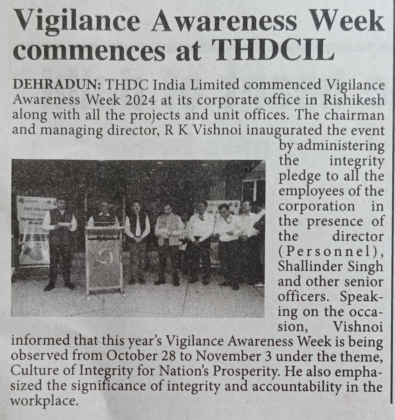 This year’s Vigilance Awareness Week, observed from October 28 to November 3, 2024, will feature a series of engaging activities aimed at promoting the values of vigilance and integrity. The week will include competitions like Slogan Competition on the theme “सतर्क भारत, उन्नत भारत” (Vigilant India, Progressive India), Essay Competition centered on the theme “सत्यनिष्ठा की संस्कृति से राष्ट्र की समृद्धि” (Prosperity of the Nation through a Culture of Integrity), Speech Competition focusing on the topic “सत्यनिष्ठा से आत्मनिर्भरता” (Self-Reliance through Integrity) to encourage active participation from THDCIL’s workforce.