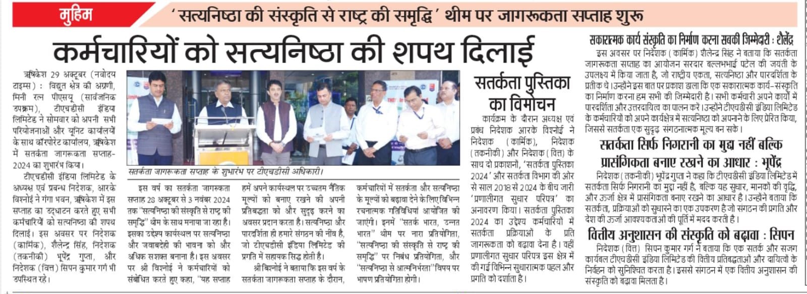 Rishikesh, 29 October 2024: THDC India Limited, a leading Public Sector Enterprise in India’s Energy Sector, commenced Vigilance Awareness Week 2024 on 28th October 2024, at its Corporate Office in Rishikesh along with all the projects and unit offices. Sh. R. K. Vishnoi, Chairman & Managing Director, inaugurated the Vigilance Awareness Week at Ganga Bhawan, Rishikesh by administering the Integrity pledge to all the employees of the Corporation in the gracious presence of Sh. Shallinder Singh, Director (Personnel), Sh. Bhupender Gupta, Director (Technical) and Sh. Sipan Kumar Garg, Director (Finance) THDCIL.