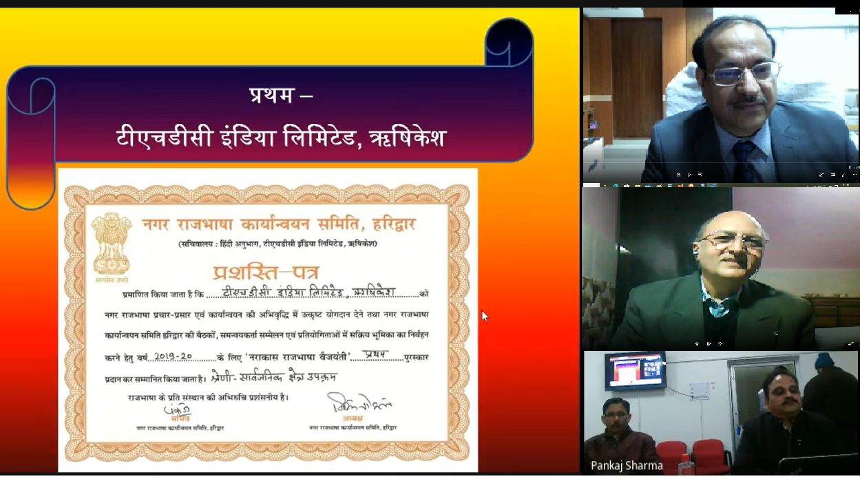 टीएचडीसी इंडिया लिमिटेड के कारपोरेट कार्यालय, ऋषिकेश को वर्ष 2019-20 के लिए सार्वजनिक क्षेत्र उपक्रमों की श्रेणी में नराकास राजभाषा वैजयंती के प्रथम पुरस्कार से सम्मानित किया गया । इस पुरस्कार की घोषणा नगर राजभाषा कार्यान्वयन समिति, हरिद्वार की 21 जनवरी, 2021 को आयोजित हुई 31 वीं अर्द्धवार्षिक बैठक में की गई । नगर राजभाषा कार्यान्वयन समिति, हरिद्वार देश की बड़ी नराकासों में से एक है जिसके सदस्य संस्थानों की संख्या 66 है। इस नराकास में रुड़की, हरिद्वार, ऋषिकेश एवं पौड़ी में स्थित केंद्र सरकार के कार्यालय/विभाग/पीएसयू/संस्थान/बैंक शामिल हैं । नगर राजभाषा कार्यान्वैयन समिति, हरिद्वार की 31वीं अर्धवार्षिक बैठक वीडियो क्रांफेंसिंग के माध्यम से आयोजित की गई । जिसमें श्री विजय गोयल, निदेशक(कार्मिक) एवं अध्यक्ष नराकास एवं श्री अजय मलिक, उप निदेशक (कार्यान्वयन), राजभाषा विभाग, गृह मंत्रालय, भारत सरकार के साथ नराकास, हरिद्वार के सदस्य संस्थानों के प्रमुख एवं प्रतिनिधि एवं अनेक गणमान्य व्यक्ति ऑनलाइन जुड़े हुए थे । बैठक का संचालन श्री पंकज कुमार शर्मा, वरि.हिंदी अधिकारी एवं सचिव, नराकास हरिद्वार द्वारा किया गया । संचालन कक्ष में श्री ईश्वरदत्त तिग्गा, उप महाप्रबंधक (कार्मिक-स्थापना/हिंदी) एवं हिंदी अनुभाग के अधिकारी एवं कर्मचारी उपस्थित थे ।