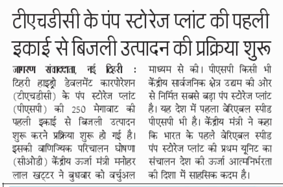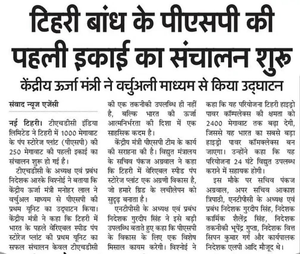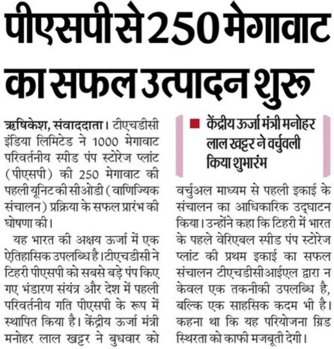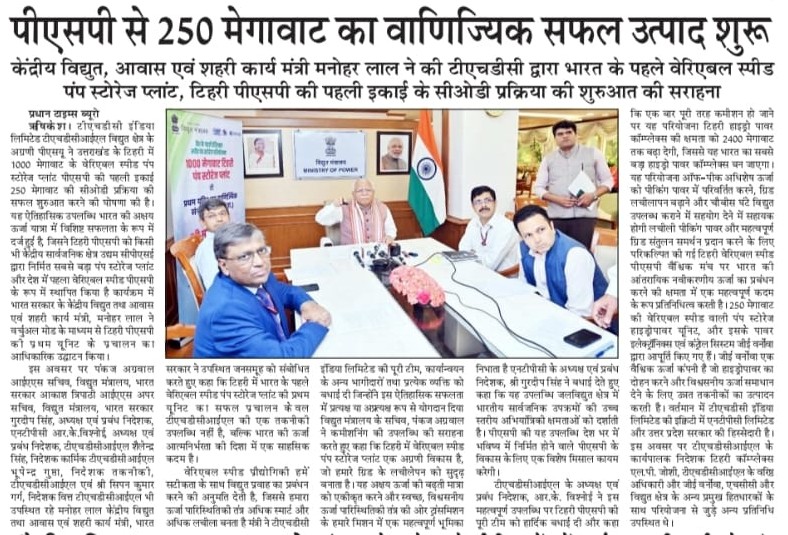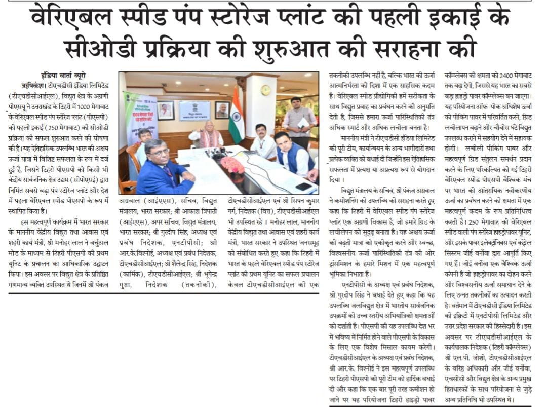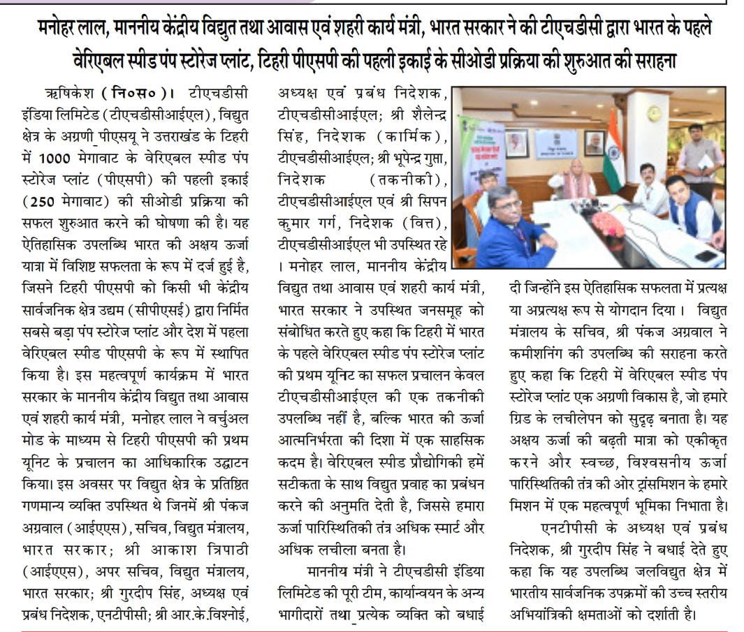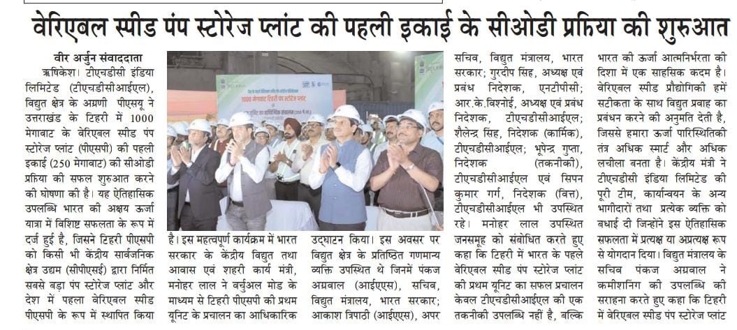 ऋषिकेश, 4 जून 2025: टीएचडीसी इंडिया लिमिटेड (टीएचडीसीआईएल), विद्युत क्षेत्र के अग्रणी पीएसयू ने उत्तराखंड के टिहरी में 1000 मेगावाट के वेरिएबल स्पीड पंप स्टोरेज प्लांट (पीएसपी) की पहली इकाई (250 मेगावाट) की सीओडी प्रक्रिया की सफल शुरुआत करने की घोषणा की है। यह ऐतिहासिक उपलब्धि भारत की अक्षय ऊर्जा यात्रा में विशिष्ट सफलता के रूप में दर्ज हुई है, जिसने टिहरी पीएसपी को किसी भी केंद्रीय सार्वजनिक क्षेत्र उद्यम (सीपीएसई) द्वारा निर्मित सबसे बड़ा पंप स्टोरेज प्लांट और देश में पहला वेरिएबल स्पीड पीएसपी के रूप में स्थापित किया है।