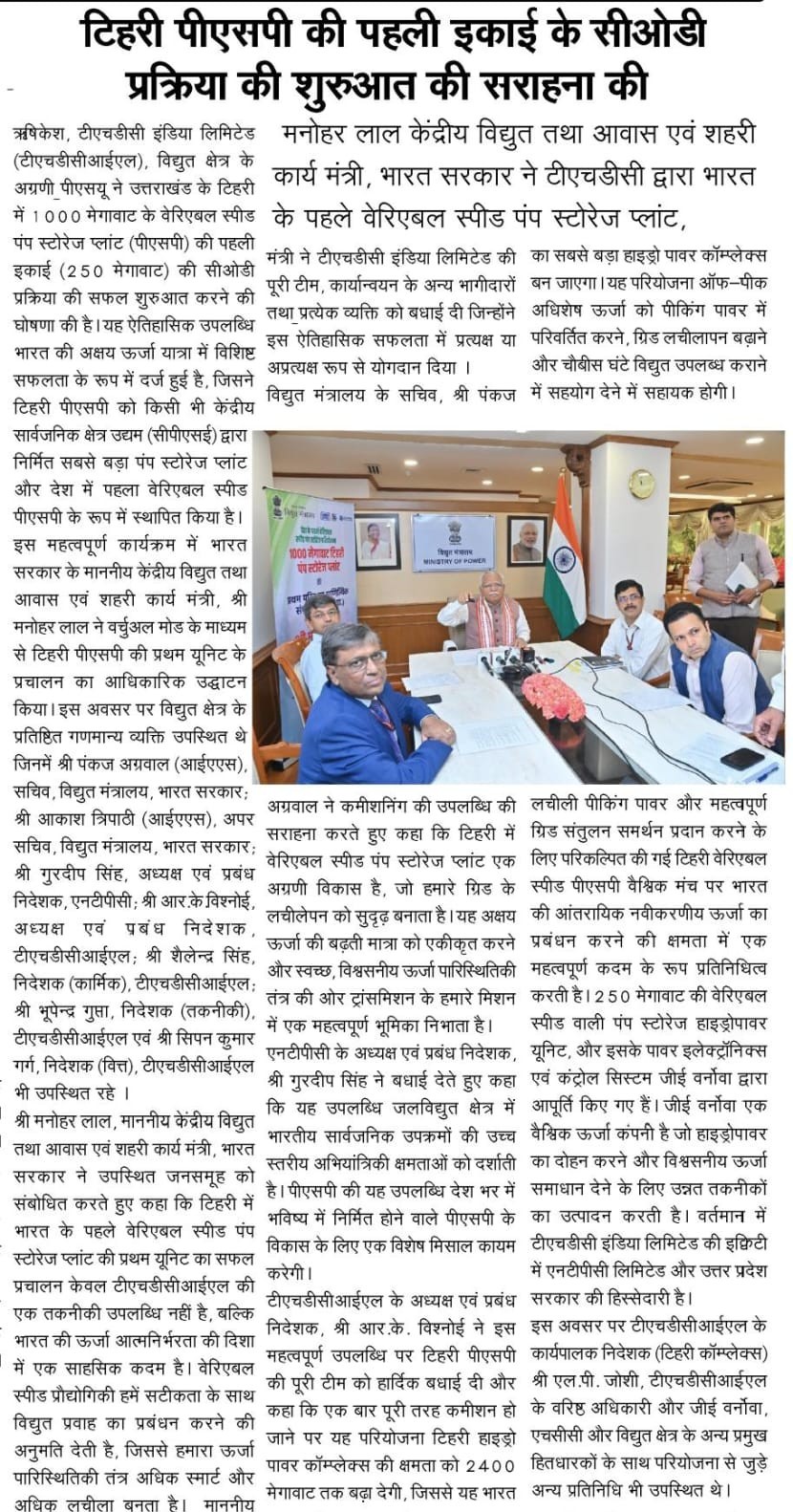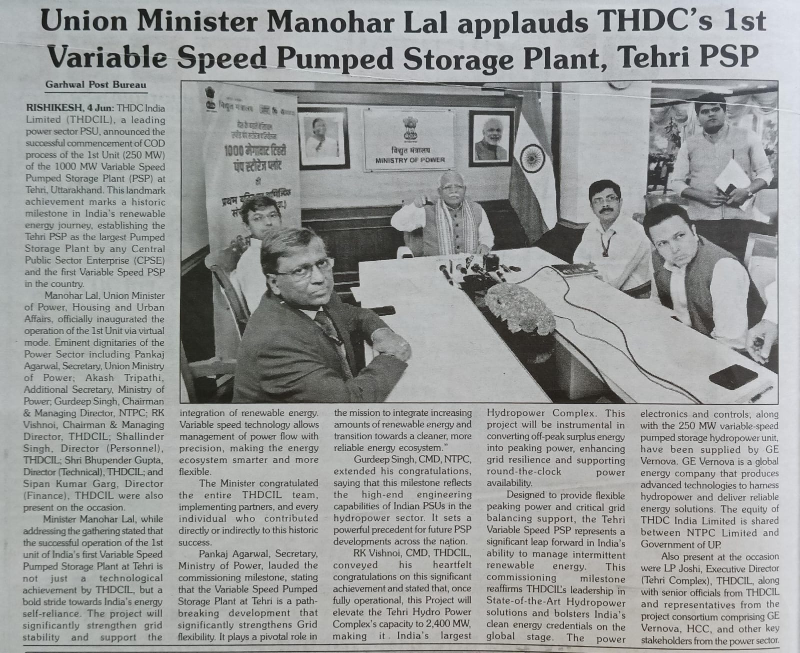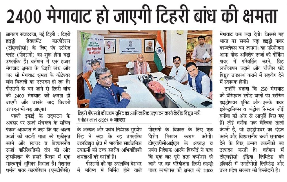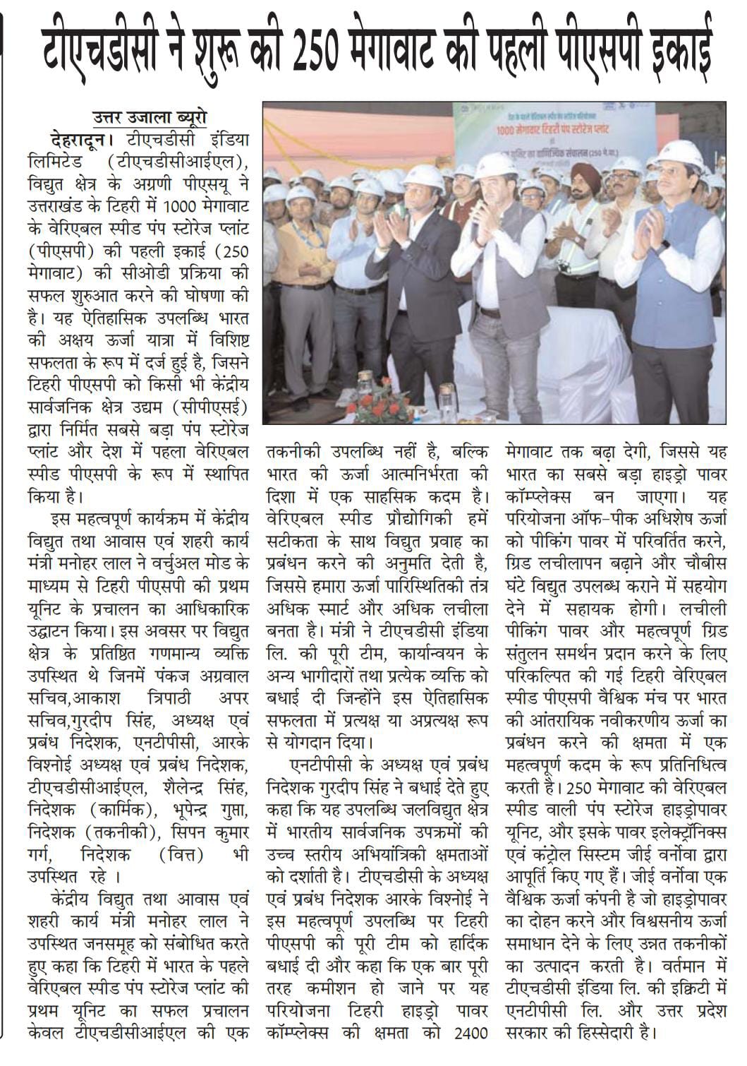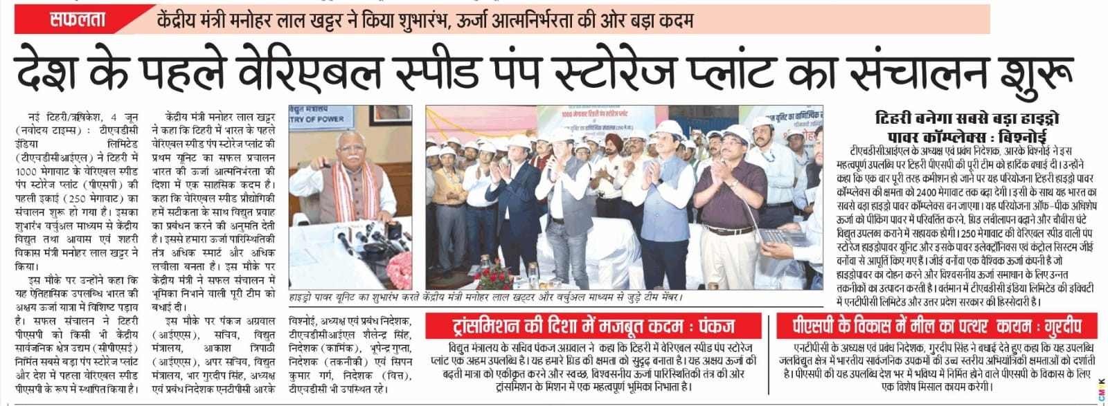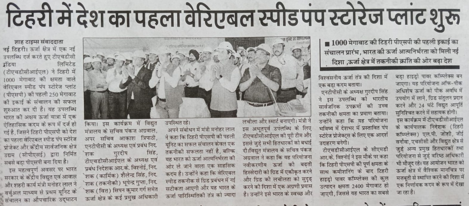 ऋषिकेश, 4 जून 2025: टीएचडीसी इंडिया लिमिटेड (टीएचडीसीआईएल), विद्युत क्षेत्र के अग्रणी पीएसयू ने उत्तराखंड के टिहरी में 1000 मेगावाट के वेरिएबल स्पीड पंप स्टोरेज प्लांट (पीएसपी) की पहली इकाई (250 मेगावाट) की सीओडी प्रक्रिया की सफल शुरुआत करने की घोषणा की है। यह ऐतिहासिक उपलब्धि भारत की अक्षय ऊर्जा यात्रा में विशिष्ट सफलता के रूप में दर्ज हुई है, जिसने टिहरी पीएसपी को किसी भी केंद्रीय सार्वजनिक क्षेत्र उद्यम (सीपीएसई) द्वारा निर्मित सबसे बड़ा पंप स्टोरेज प्लांट और देश में पहला वेरिएबल स्पीड पीएसपी के रूप में स्थापित किया है।
