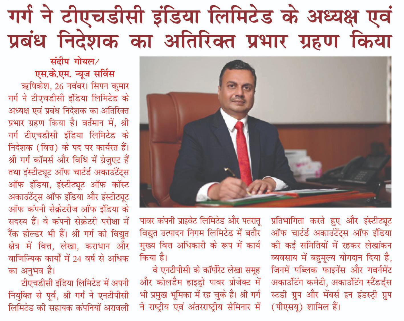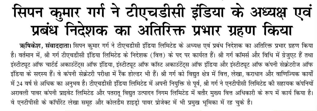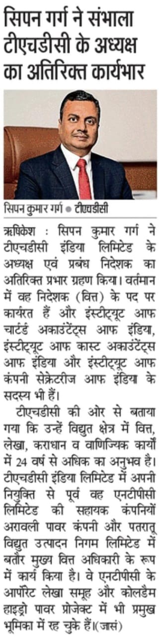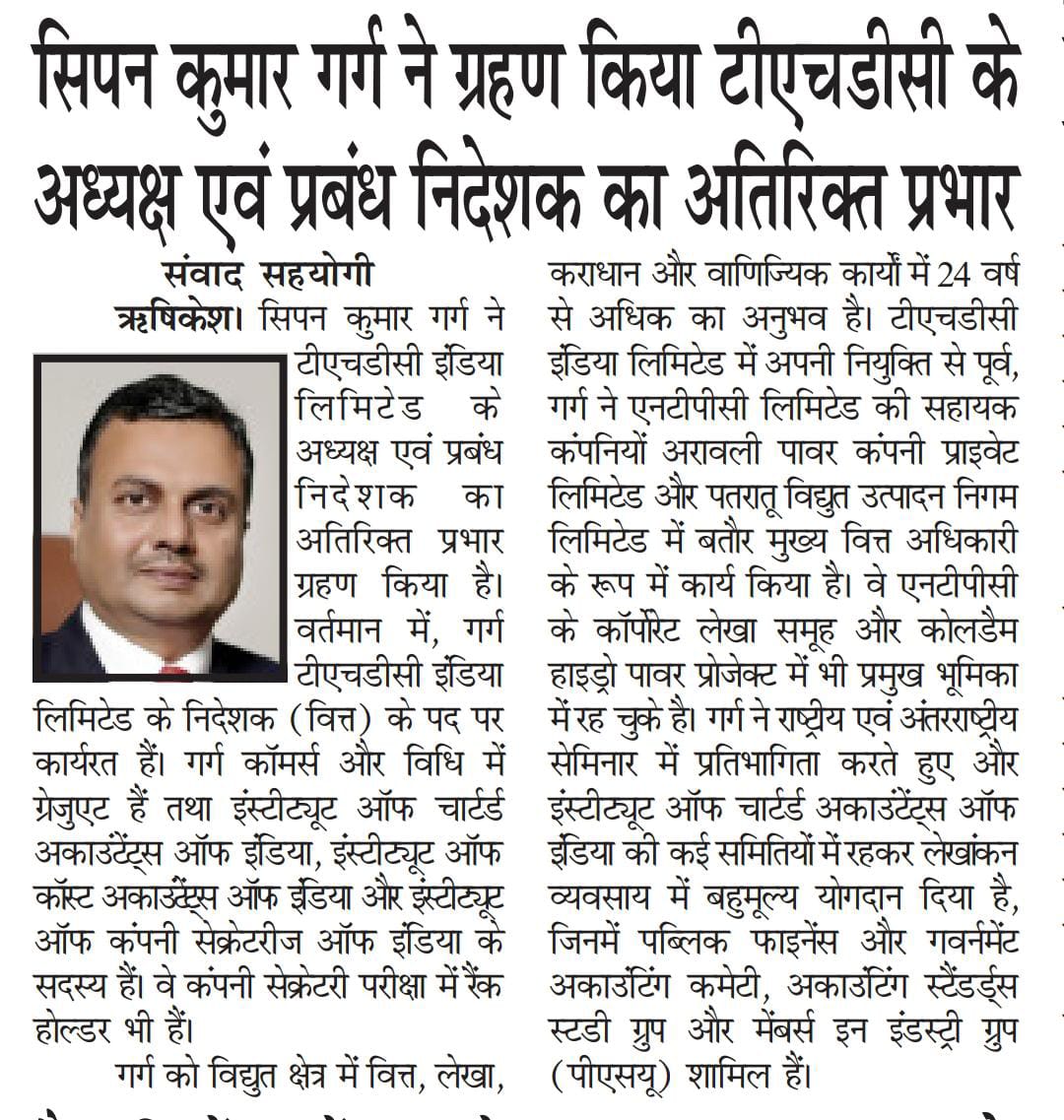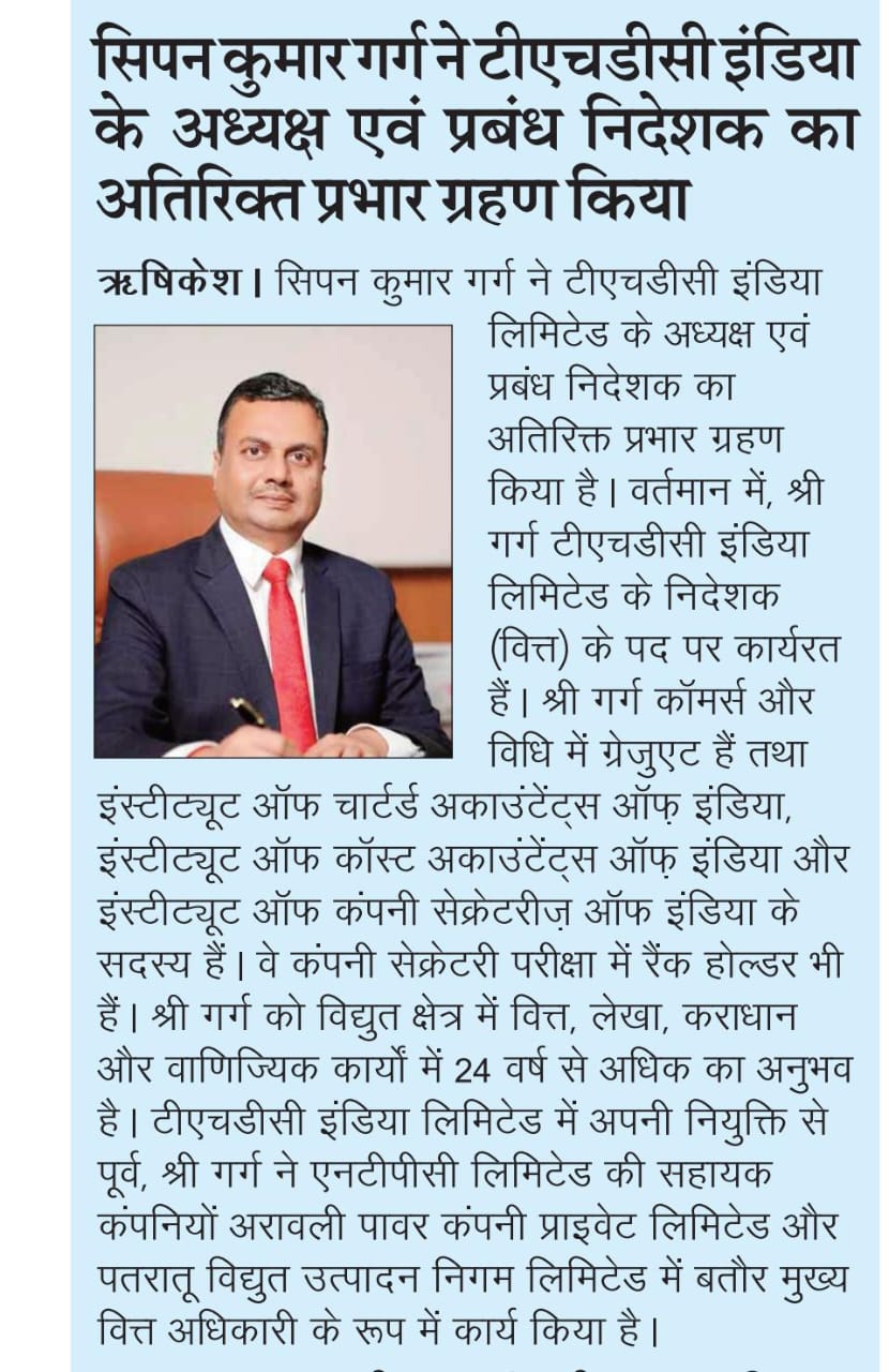 ऋषिकेश, 26 नवंबर, 2025: श्री सिपन कुमार गर्ग ने टीएचडीसी इंडिया लिमिटेड के अध्यक्ष एवं प्रबंध निदेशक का अतिरिक्त प्रभार ग्रहण किया है। वर्तमान में, श्री गर्ग टीएचडीसी इंडिया लिमिटेड के निदेशक (वित्त) के पद पर कार्यरत हैं। श्री गर्ग कॉमर्स और विधि में ग्रेजुएट हैं तथा इंस्टीट्यूट ऑफ़ चार्टर्ड अकाउंटेंट्स ऑफ़ इंडिया, इंस्टीट्यूट ऑफ़ कॉस्ट अकाउंटेंट्स ऑफ़ इंडिया और इंस्टीट्यूट ऑफ़ कंपनी सेक्रेटरीज़ ऑफ़ इंडिया के सदस्य हैं। वे कंपनी सेक्रेटरी परीक्षा में रैंक होल्डर भी हैं।