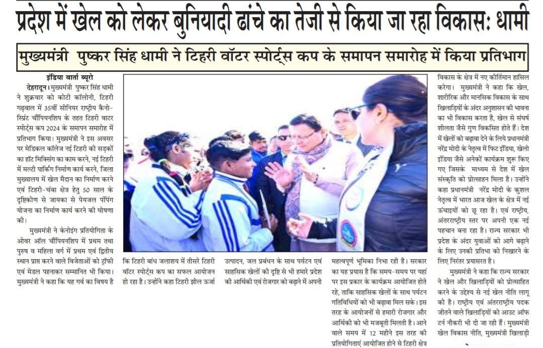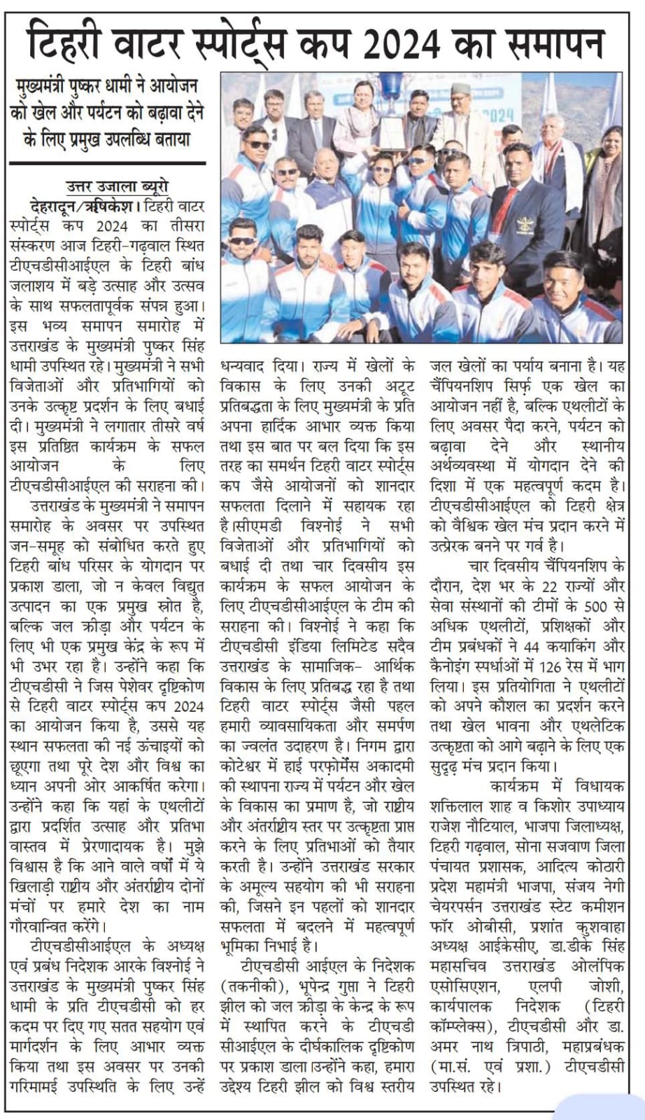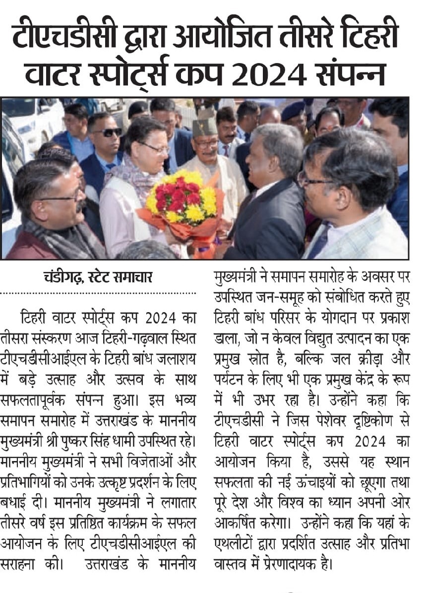 ऋषिकेश, 13-12-2024: टिहरी वाटर स्पोर्ट्स कप 2024 का तीसरा संस्करण आज टिहरी-गढ़वाल स्थित टीएचडीसीआईएल के टिहरी बांध जलाशय में बड़े उत्साह और उत्सव के साथ सफलतापूर्वक संपन्न हुआ। इस भव्य समापन समारोह में उत्तराखंड के माननीय मुख्यमंत्री श्री पुष्कर सिंह धामी उपस्थित रहे। माननीय मुख्यमंत्री ने सभी विजेताओं और प्रतिभागियों को उनके उत्कृष्ट प्रदर्शन के लिए बधाई दी। माननीय मुख्यमंत्री ने लगातार तीसरे वर्ष इस प्रतिष्ठित कार्यक्रम के सफल आयोजन के लिए टीएचडीसीआईएल की सराहना की।