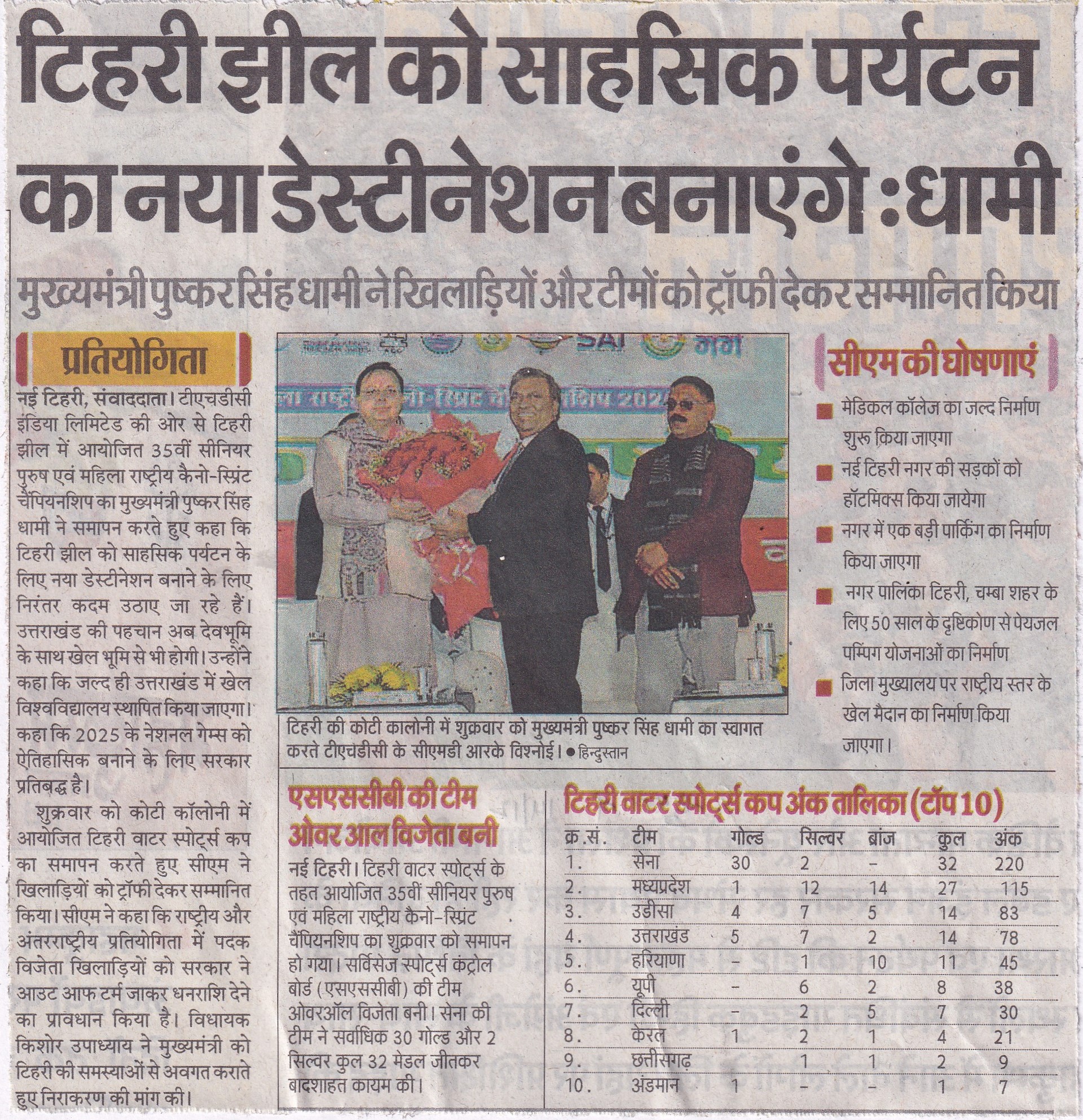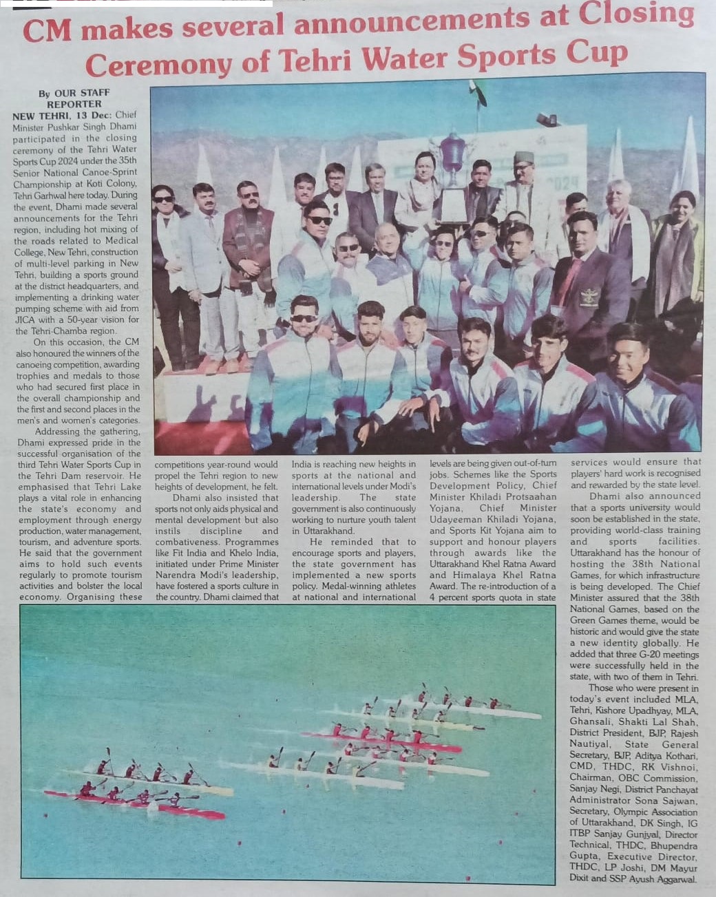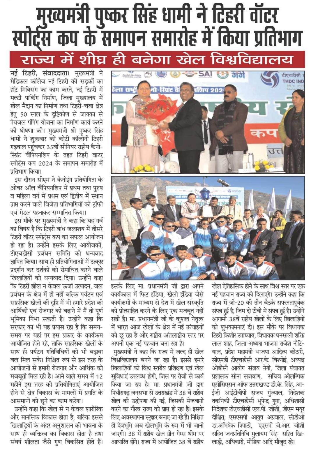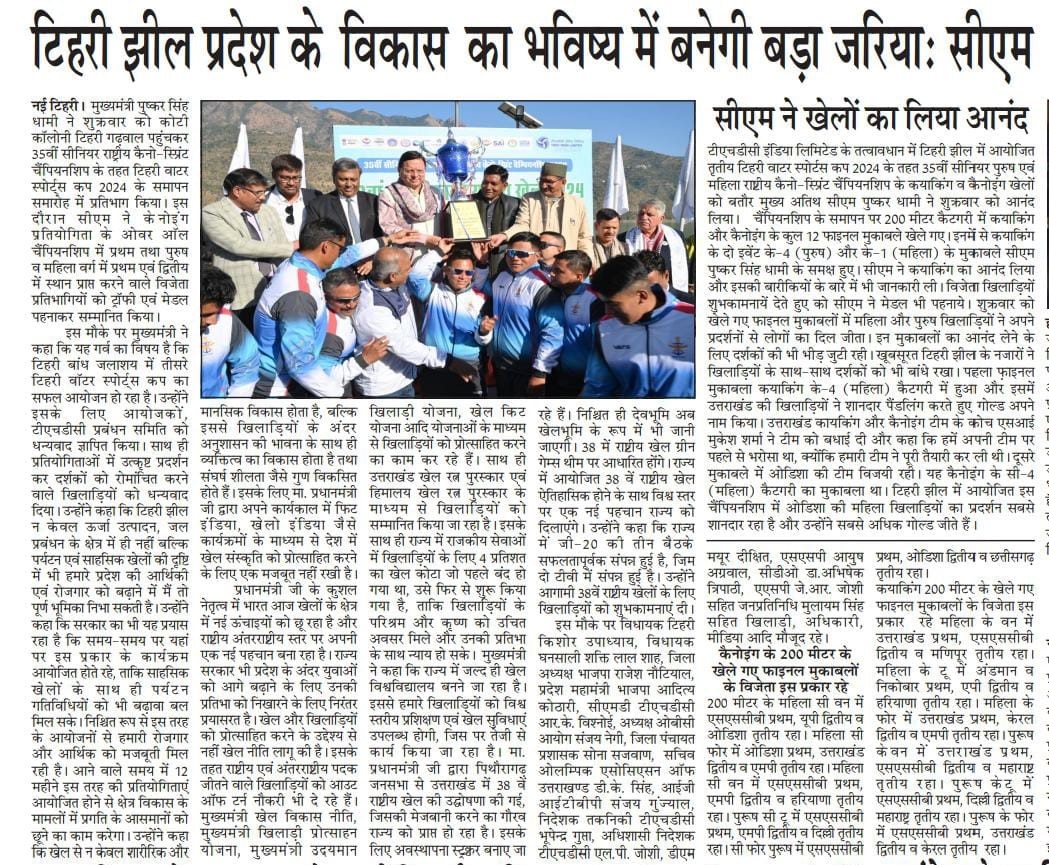 श्री विश्नोई ने कहा कि टीएचडीसी इंडिया लिमिटेड सदैव उत्तराखंड के सामाजिक-आर्थिक विकास के लिए प्रतिबद्ध रहा है तथा टिहरी वाटर स्पोर्ट्स जैसी पहल हमारी व्यावसायिकता और समर्पण का ज्वलंत उदाहरण है। निगम द्वारा कोटेश्वर में हाई परफ़ोर्मेंस अकादमी की स्थापना राज्य में पर्यटन और खेल के विकास का प्रमाण है, जो राष्ट्रीय और अंतर्राष्ट्रीय स्तर पर उत्कृष्टता प्राप्त करने के लिए प्रतिभाओं को तैयार करती है। उन्होंने उत्तराखंड सरकार के अमूल्य सहयोग की भी सराहना की, जिसने इन पहलों को शानदार सफलता में बदलने में महत्वपूर्ण भूमिका निभाई है।"