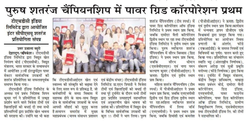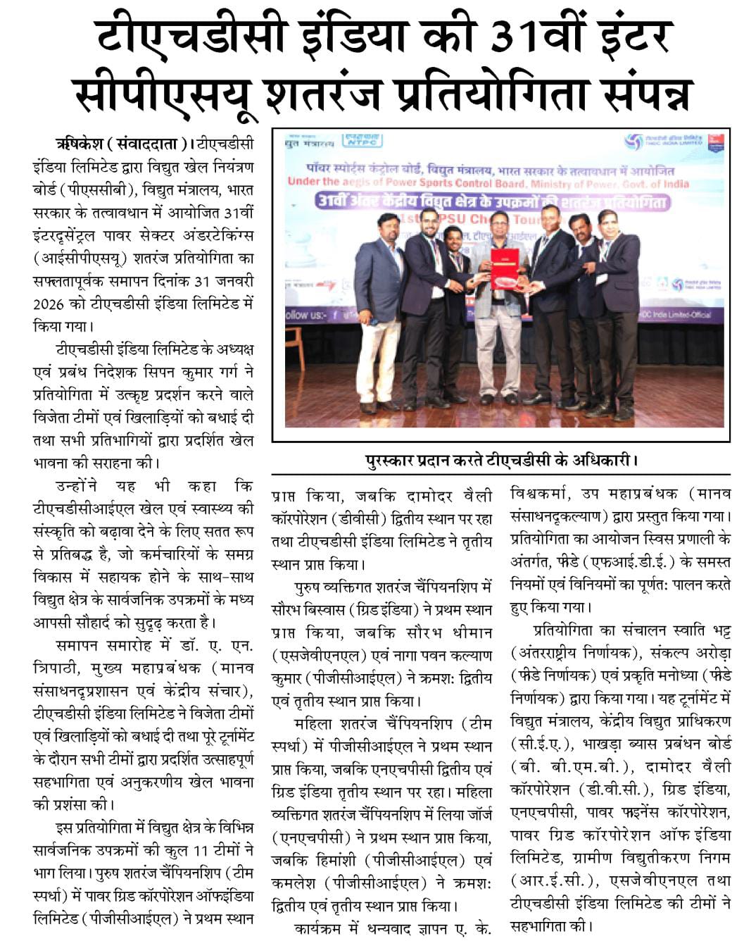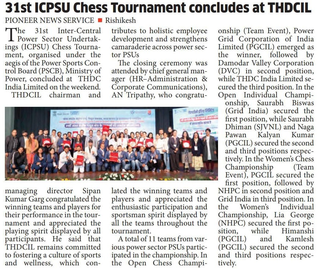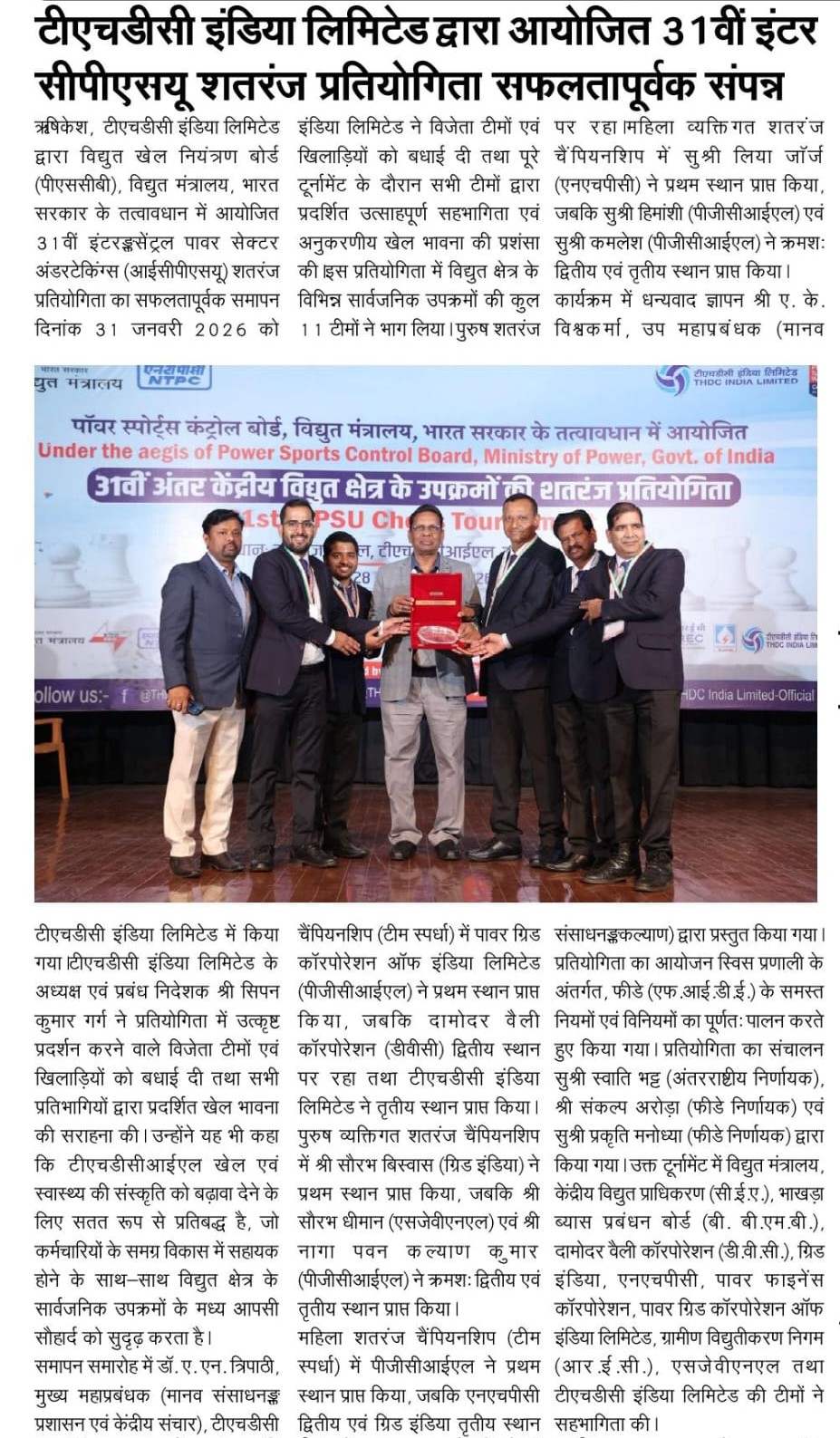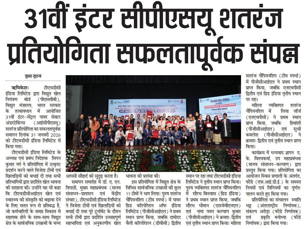 ऋषिकेश, 01-02-2026: टीएचडीसी इंडिया लिमिटेड द्वारा विद्युत खेल नियंत्रण बोर्ड (पीएससीबी), विद्युत मंत्रालय, भारत सरकार के तत्वावधान में आयोजित 31वीं इंटर–सेंट्रल पावर सेक्टर अंडरटेकिंग्स (आईसीपीएसयू) शतरंज प्रतियोगिता का सफलतापूर्वक समापन दिनांक 31 जनवरी 2026 को टीएचडीसी इंडिया लिमिटेड में किया गया।