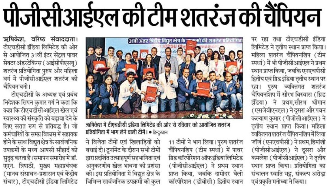 महिला शतरंज चैंपियनशिप (टीम स्पर्धा) में पीजीसीआईएल ने प्रथम स्थान प्राप्त किया, जबकि एनएचपीसी द्वितीय एवं ग्रिड इंडिया तृतीय स्थान पर रहा।