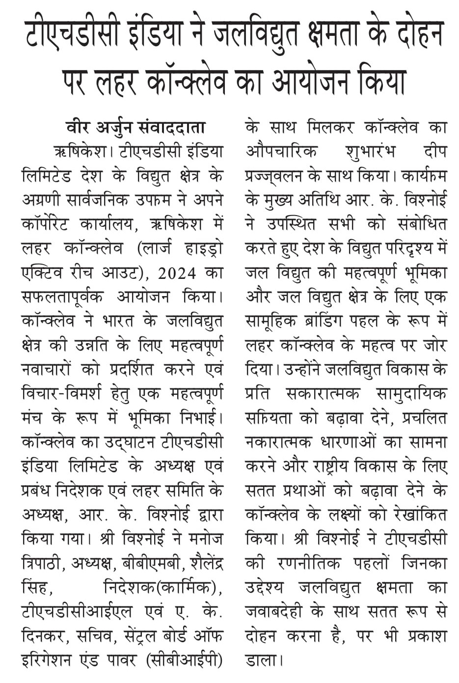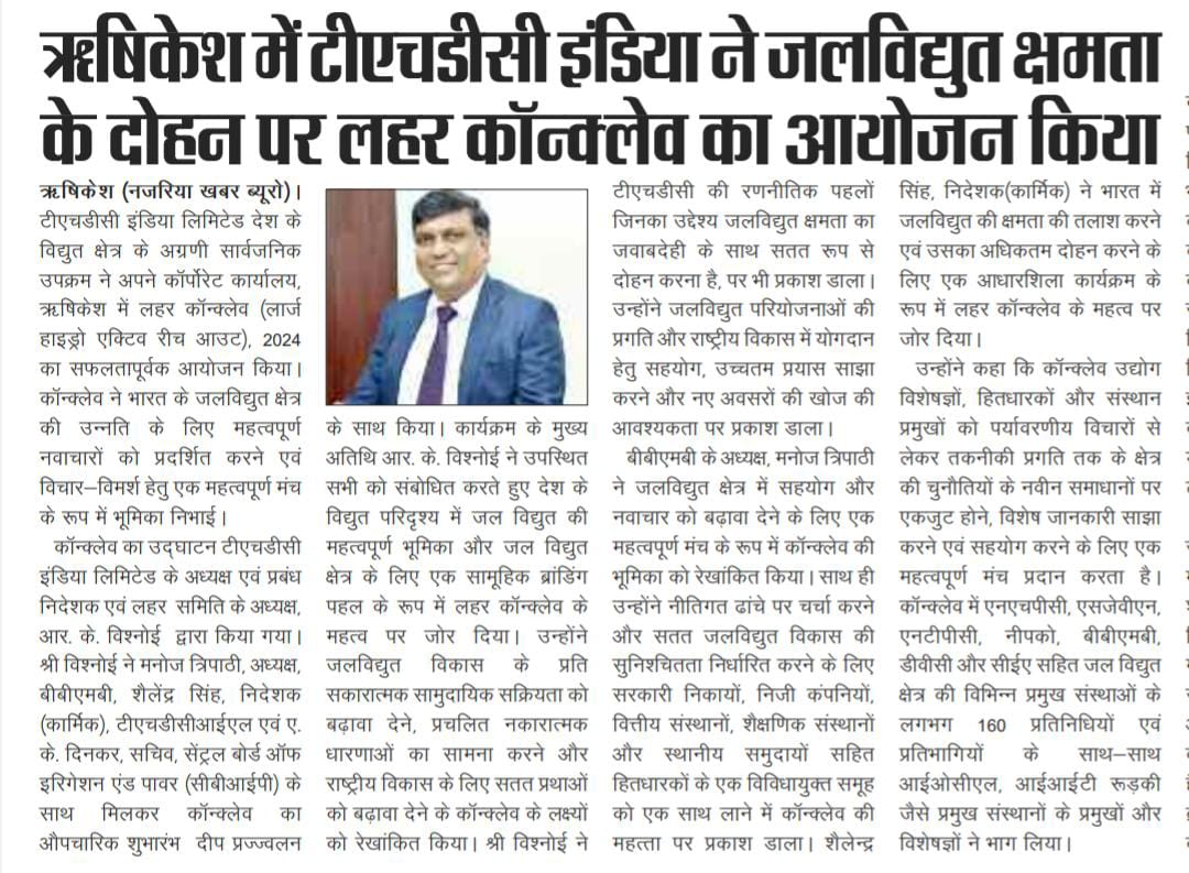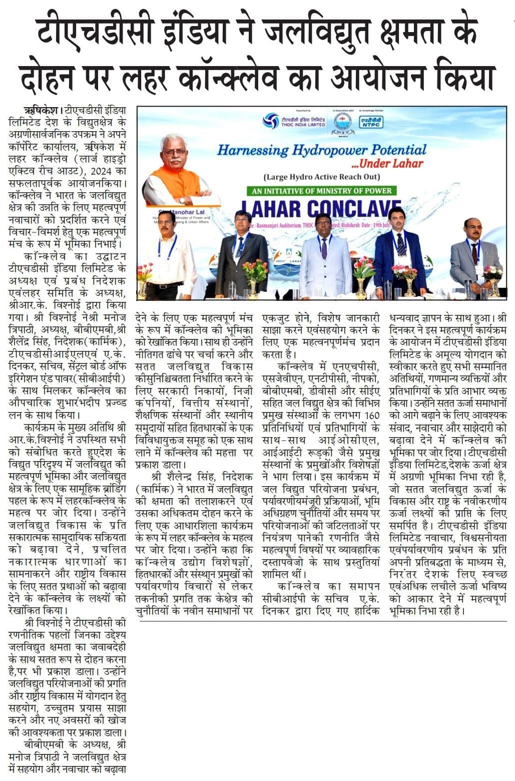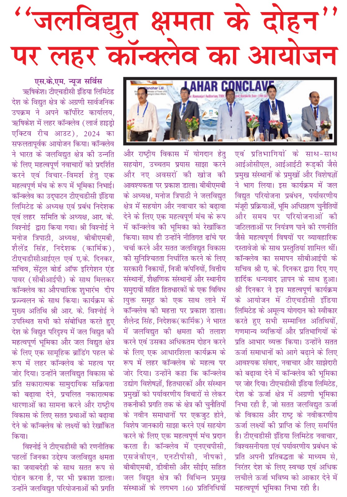 ऋषिकेश, 19-07-2024: टीएचडीसी इंडिया लिमिटेड देश के विद्युत क्षेत्र के अग्रणी सार्वजनिक उपक्रम ने अपने कॉर्पोरेट कार्यालय, ऋषिकेश में लहर कॉन्क्लेव (लार्ज हाइड्रो एक्टिव रीच आउट), 2024 का सफलतापूर्वक आयोजन किया। कॉन्क्लेव ने भारत के जलविद्युत क्षेत्र की उन्नति के लिए महत्वपूर्ण नवाचारों को प्रदर्शित करने एवं विचार-विमर्श हेतु एक महत्वपूर्ण मंच के रूप में भूमिका निभाई।