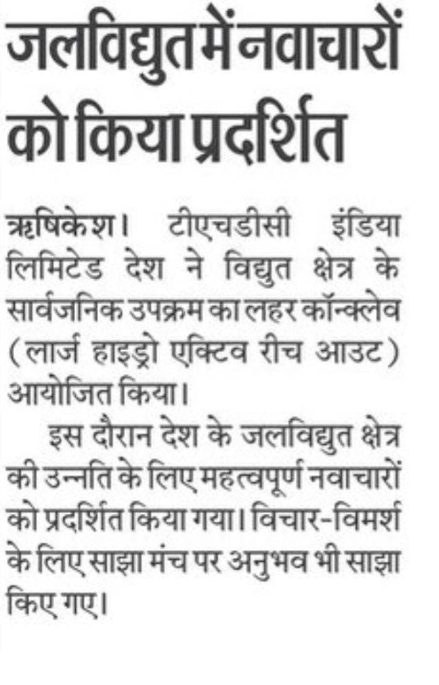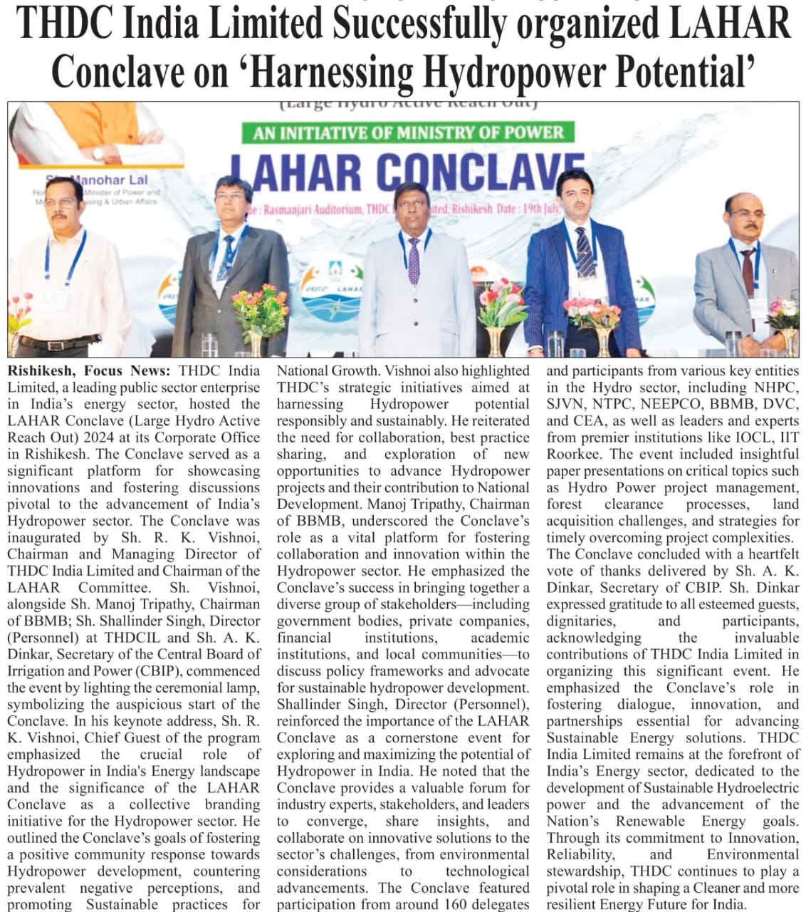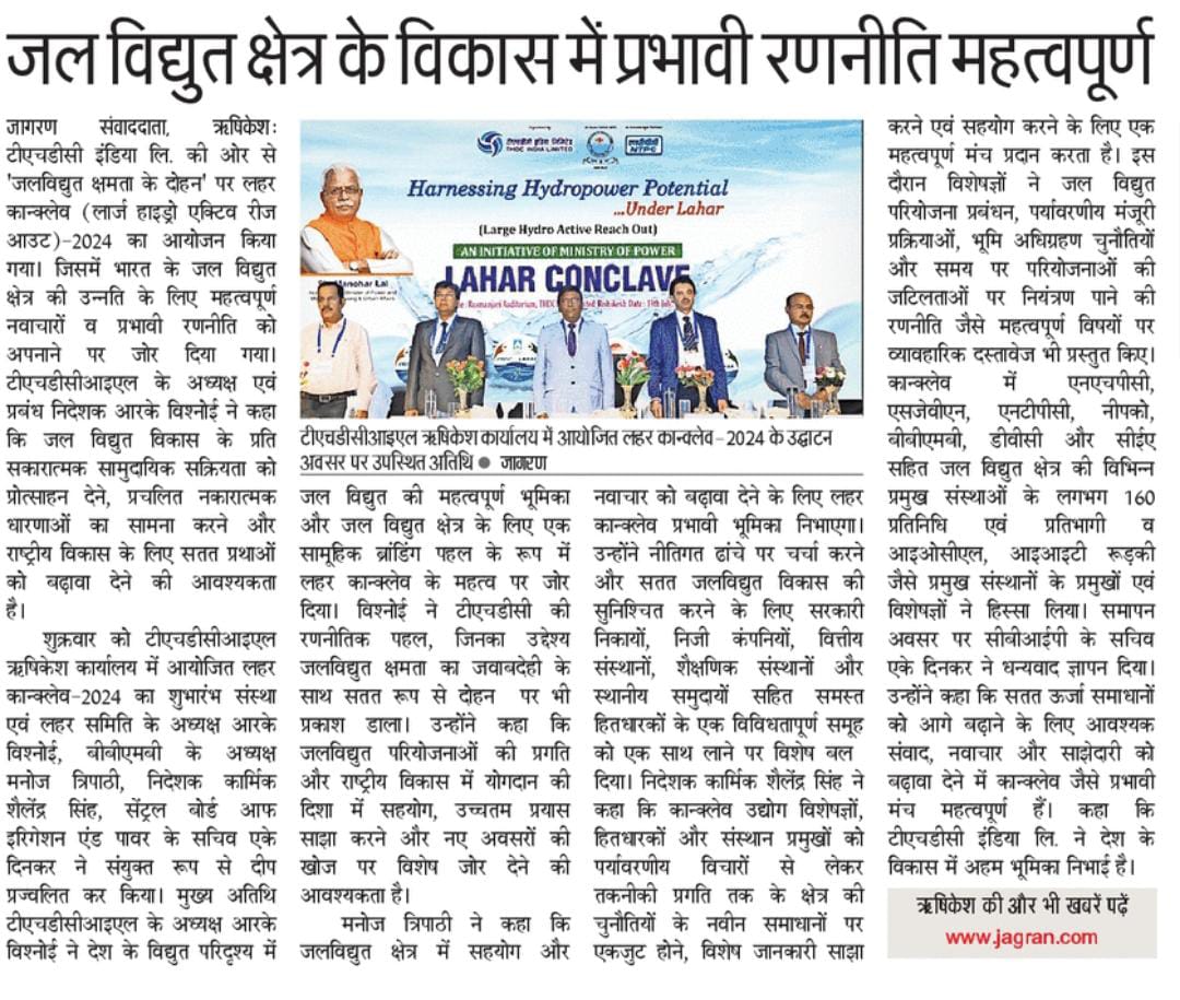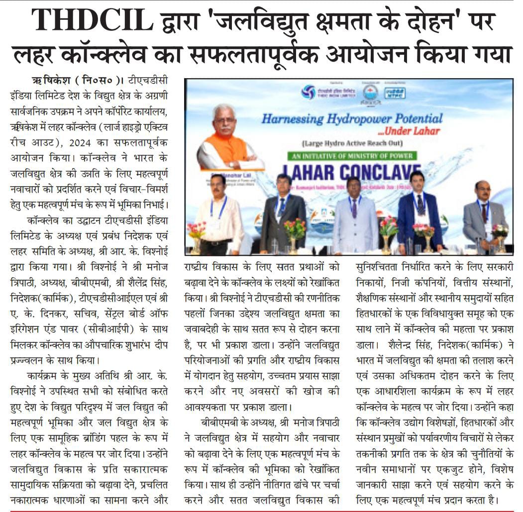 ऋषिकेश, 19-07-2024: टीएचडीसी इंडिया लिमिटेड देश के विद्युत क्षेत्र के अग्रणी सार्वजनिक उपक्रम ने अपने कॉर्पोरेट कार्यालय, ऋषिकेश में लहर कॉन्क्लेव (लार्ज हाइड्रो एक्टिव रीच आउट), 2024 का सफलतापूर्वक आयोजन किया। कॉन्क्लेव ने भारत के जलविद्युत क्षेत्र की उन्नति के लिए महत्वपूर्ण नवाचारों को प्रदर्शित करने एवं विचार-विमर्श हेतु एक महत्वपूर्ण मंच के रूप में भूमिका निभाई।