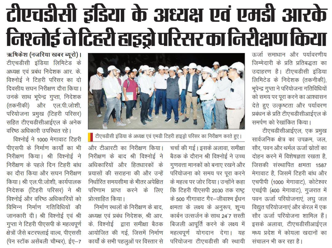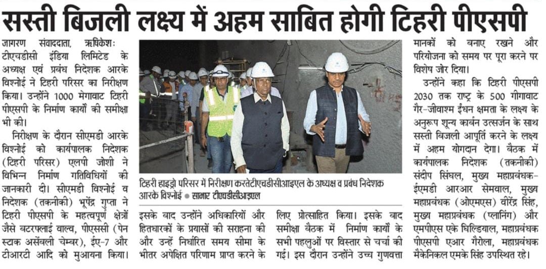 निर्माण स्थलों के निरीक्षण के बाद, अध्यक्ष एवं प्रबंध निदेशक, श्री आर. के. विश्नोई द्वारा समीक्षा बैठक आयोजित की गई, जिसमें निर्माण कार्यों के सभी पहलुओं पर विस्तार से चर्चा की गई। इसके अलावा, समीक्षा बैठक के दौरान श्री विश्नोई ने उच्च गुणवत्ता मानकों को बनाए रखने और परियोजना को समय पर पूरा करने के महत्व पर जोर दिया। उन्होंने कहा कि टिहरी पीएसपी 2030 तक राष्ट्र के 500 गीगावाट गैर-जीवाश्म ईंधन क्षमता के लक्ष्य के अनुरूप, शून्य कार्बन उत्सर्जन के साथ 24*7 सस्ती बिजली आपूर्ति करने के लक्ष्य में महत्वपूर्ण योगदान देगा। यह परियोजना टीएचडीसी की स्थायी ऊर्जा समाधान और पर्यावरणीय जिम्मेदारी के प्रति प्रतिबद्धता का उदाहरण है।