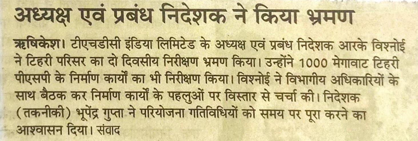 श्री विश्नोई ने निरीक्षण के पहले दिन टिहरी बांध का दौरा किया और सघन निरीक्षण किया। श्री एल.पी.जोशी, कार्यपालक निदेशक (टिहरी परिसर) ने श्री विश्नोई और वरिष्ठ अधिकारियों को विभिन्न निर्माण गतिविधियों की जानकारी दी। श्री विश्नोई एवं श्री गुप्ता ने टिहरी पीएसपी के महत्वपूर्ण क्षेत्रों जैसे बटरफ्लाई वाल्व, पीएससी (पेन स्टॉक असेंबली चैम्बर), ईए-7 और टीआरटी का निरीक्षण किया। निरीक्षण के बाद श्री विश्नोई ने अधिकारियों और हितधारकों के प्रयासों की सराहना की और उन्हें निर्धारित समयसीमा के भीतर अपेक्षित परिणाम प्राप्त करने के लिए प्रोत्साहित किया।